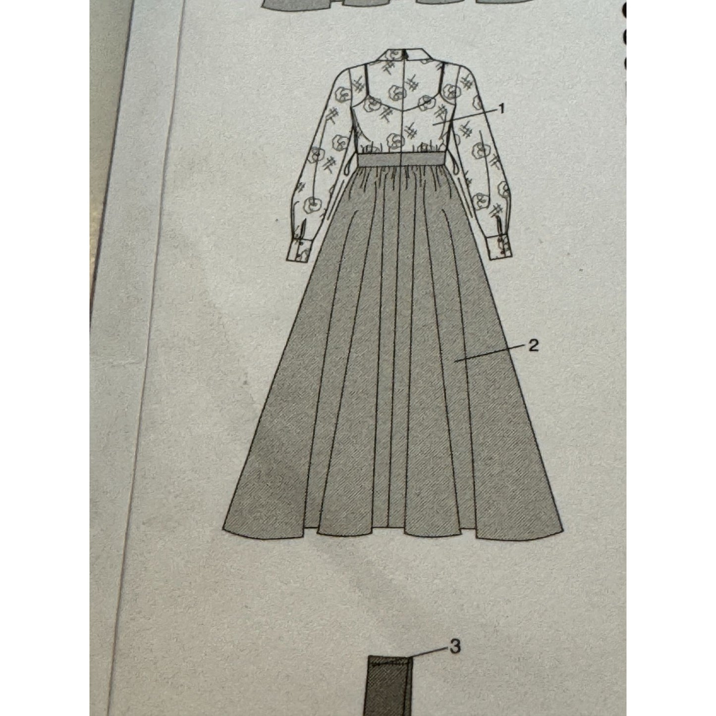 This Vogue Pattern sewing pattern V2029 by Badgley Mischka offers versatility for various formal occasions. Dress, close-fitting through bust, has see through bodice, split front band, long set-in sleeves with continuous lap opening, cuffs with button and loops. Contrast underbodice has spaghetti straps. Lined flared skirt attaches at midriff and has 3/8" baby hem. Contrast sash included.