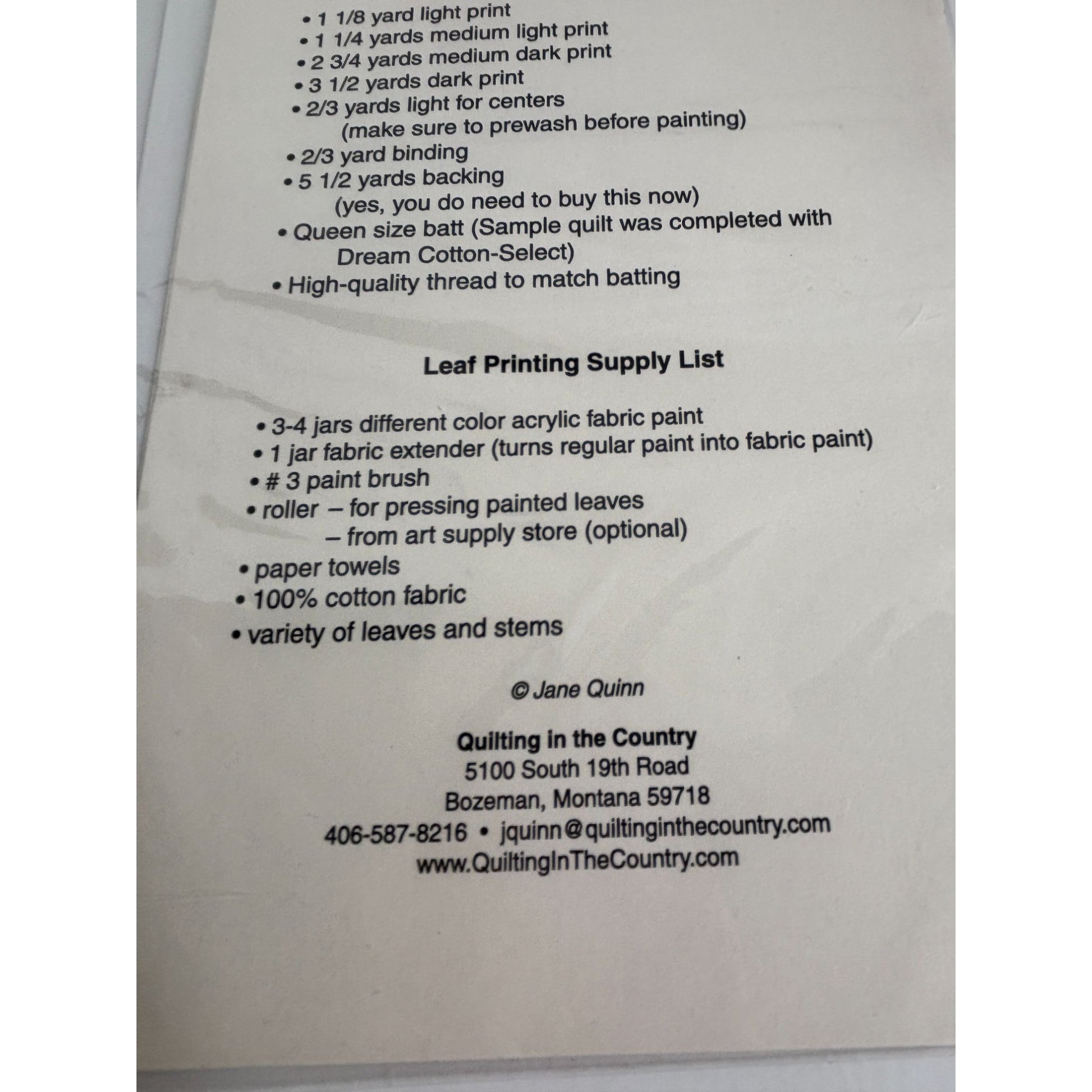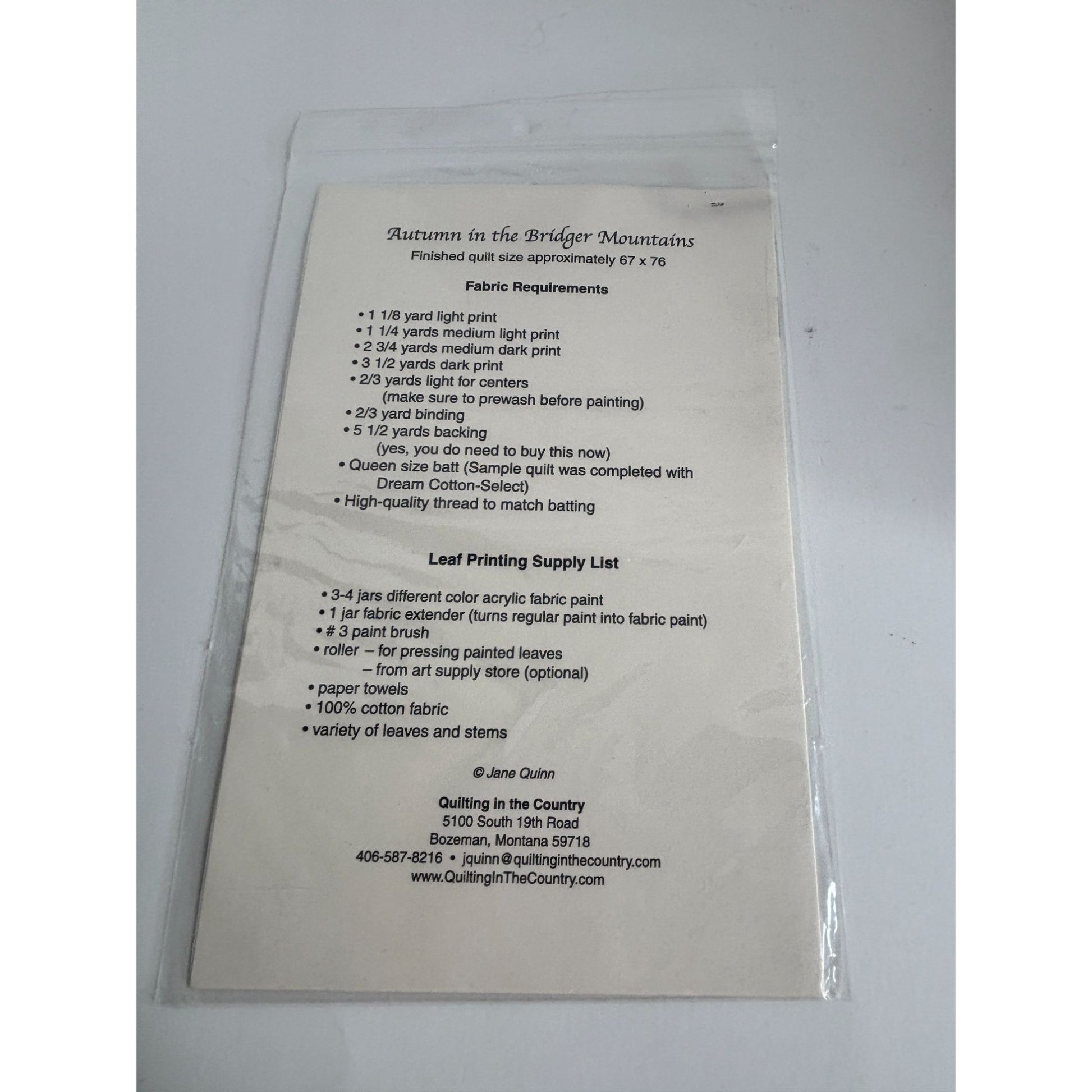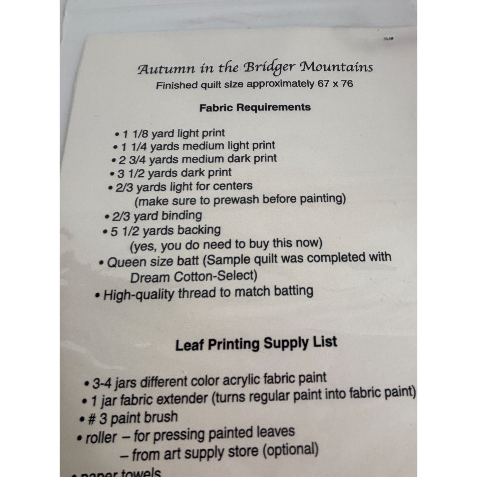 This quilt pattern offers a warm, inviting design inspired by the Bridger Mountains. Detailed fabric requirements and leaf printing supply list included, ensuring a seamless crafting experience.