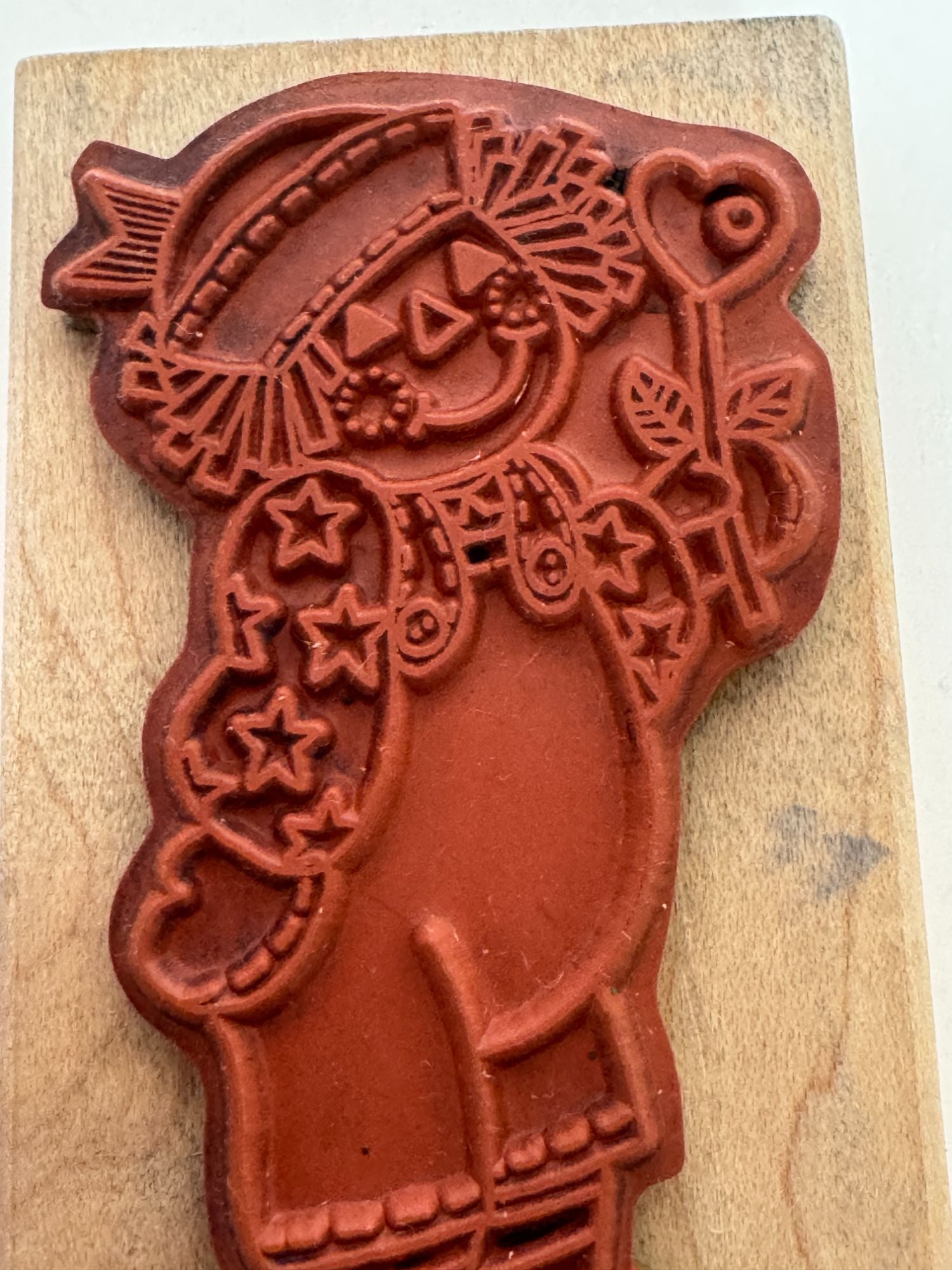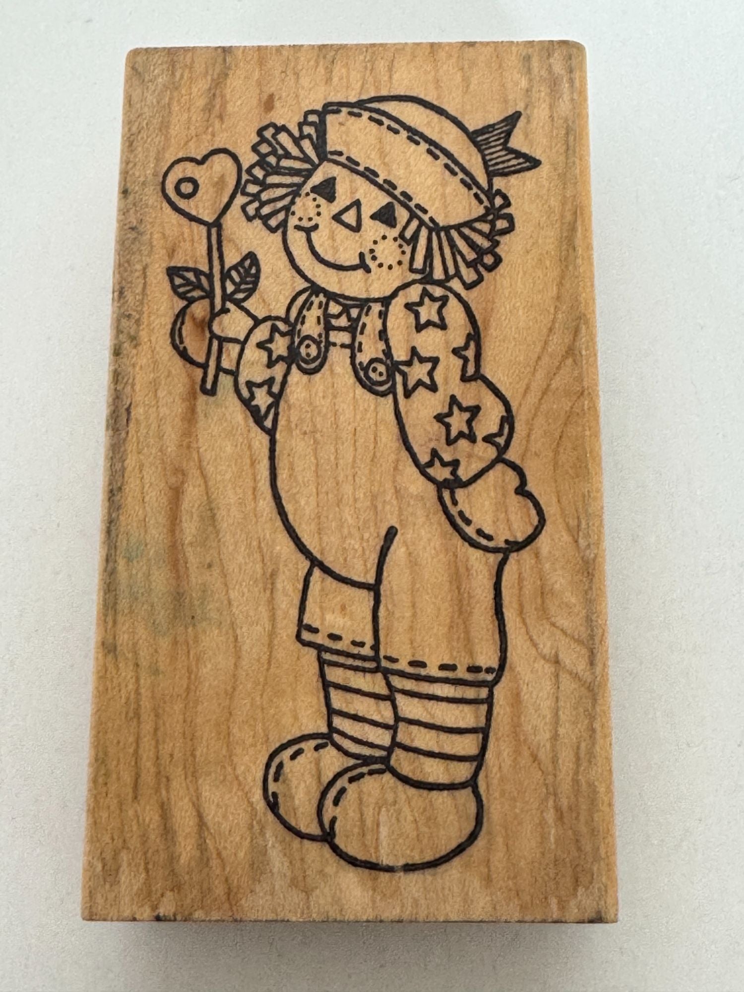 This vintage rubber stamp features the charming Raggedy Andy holding a heart flower, providing a nostalgic touch to your crafting projects.