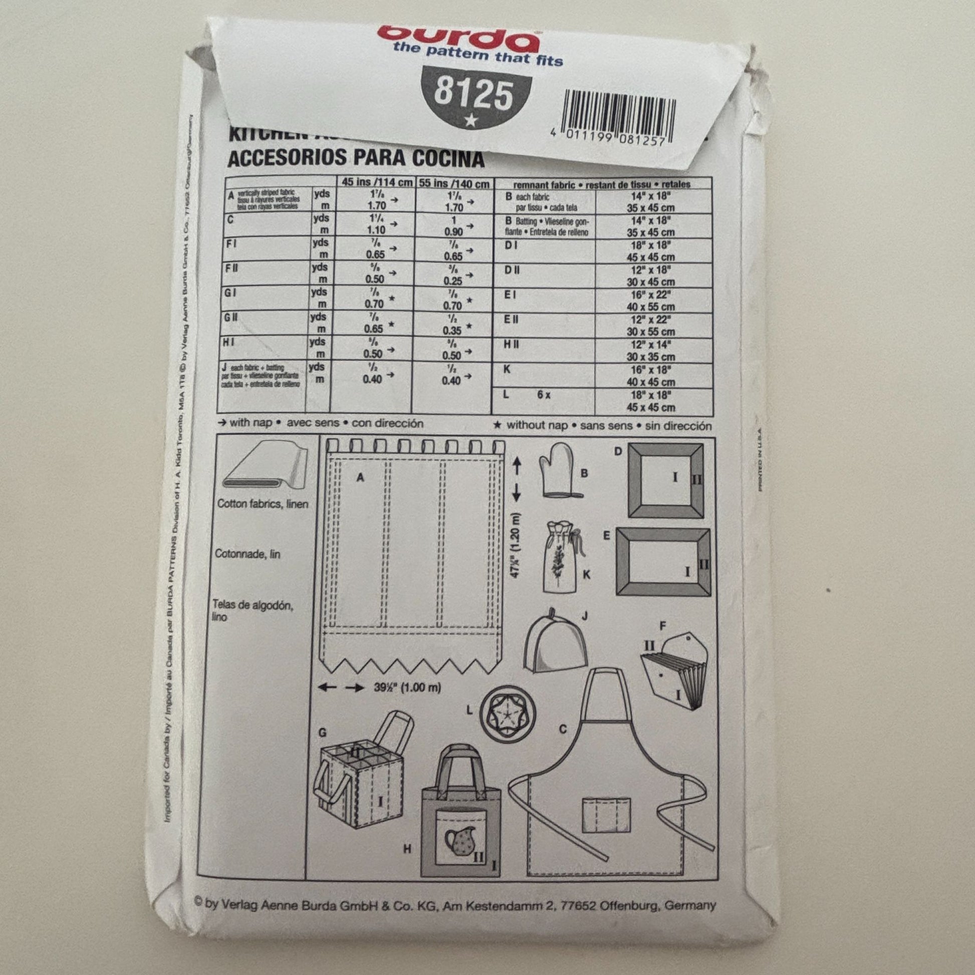 Burda Sewing Pattern 8125 Creative Kitchen Accessories Apron Napkins Valance Bag