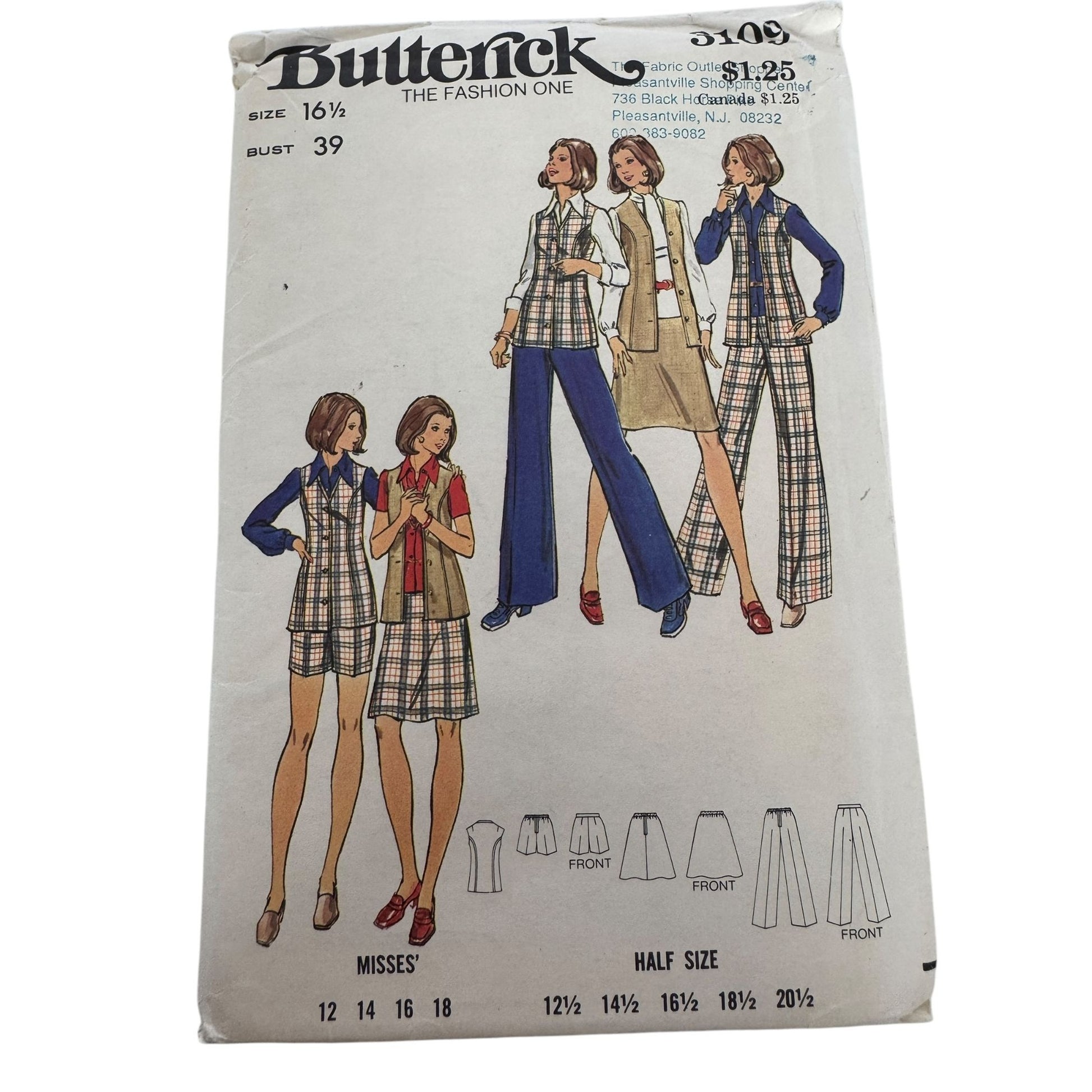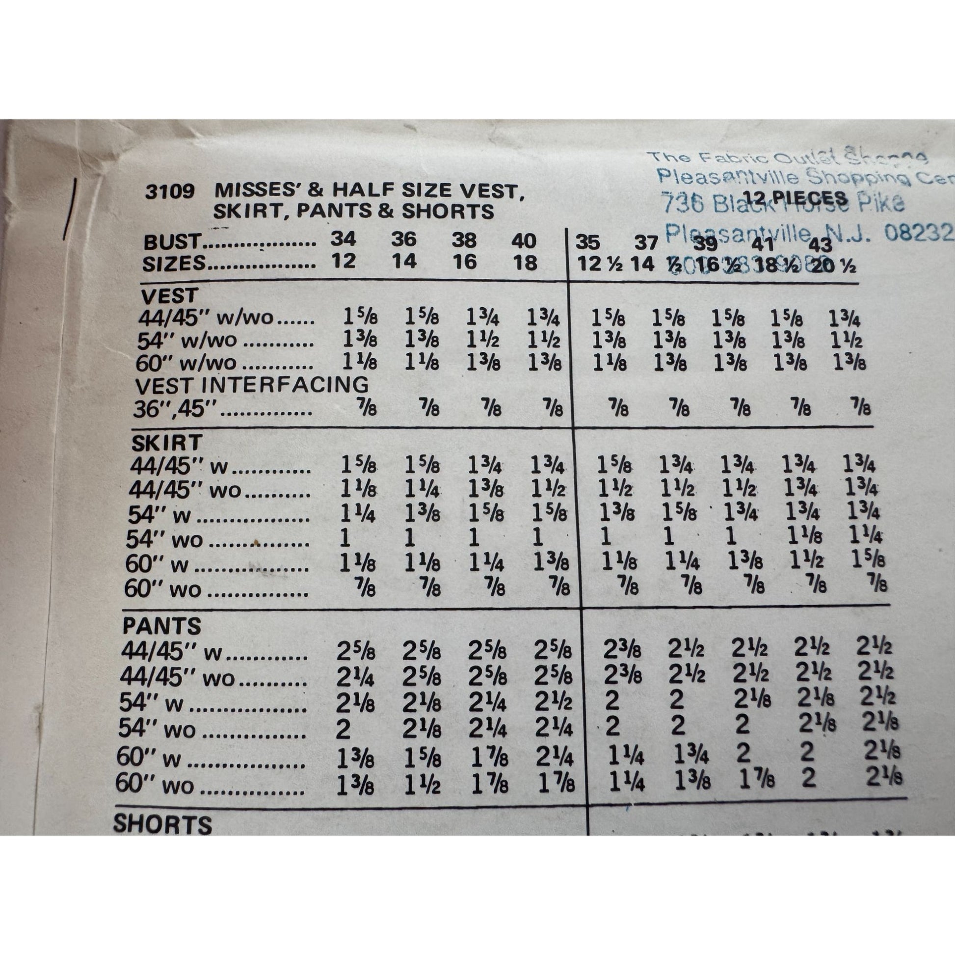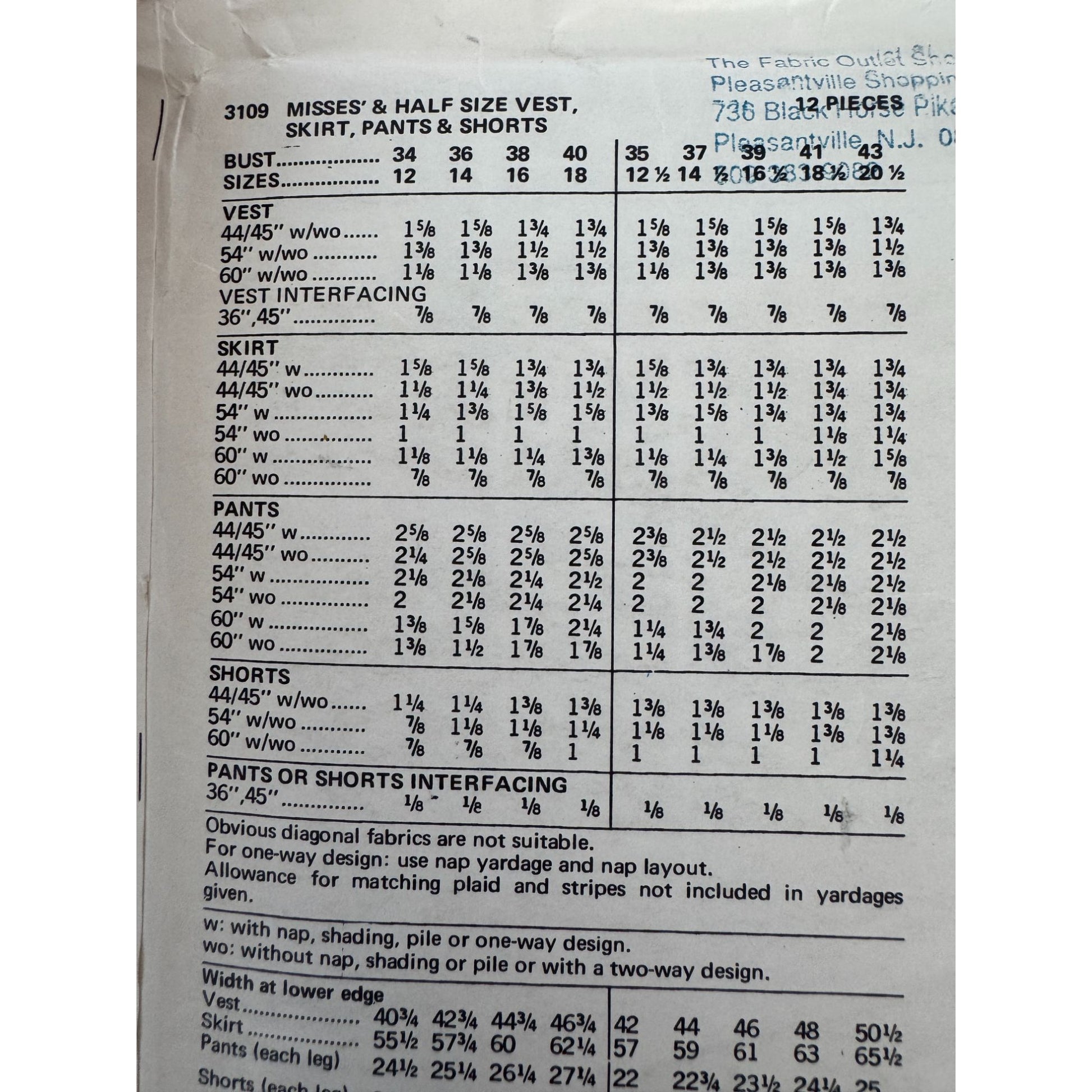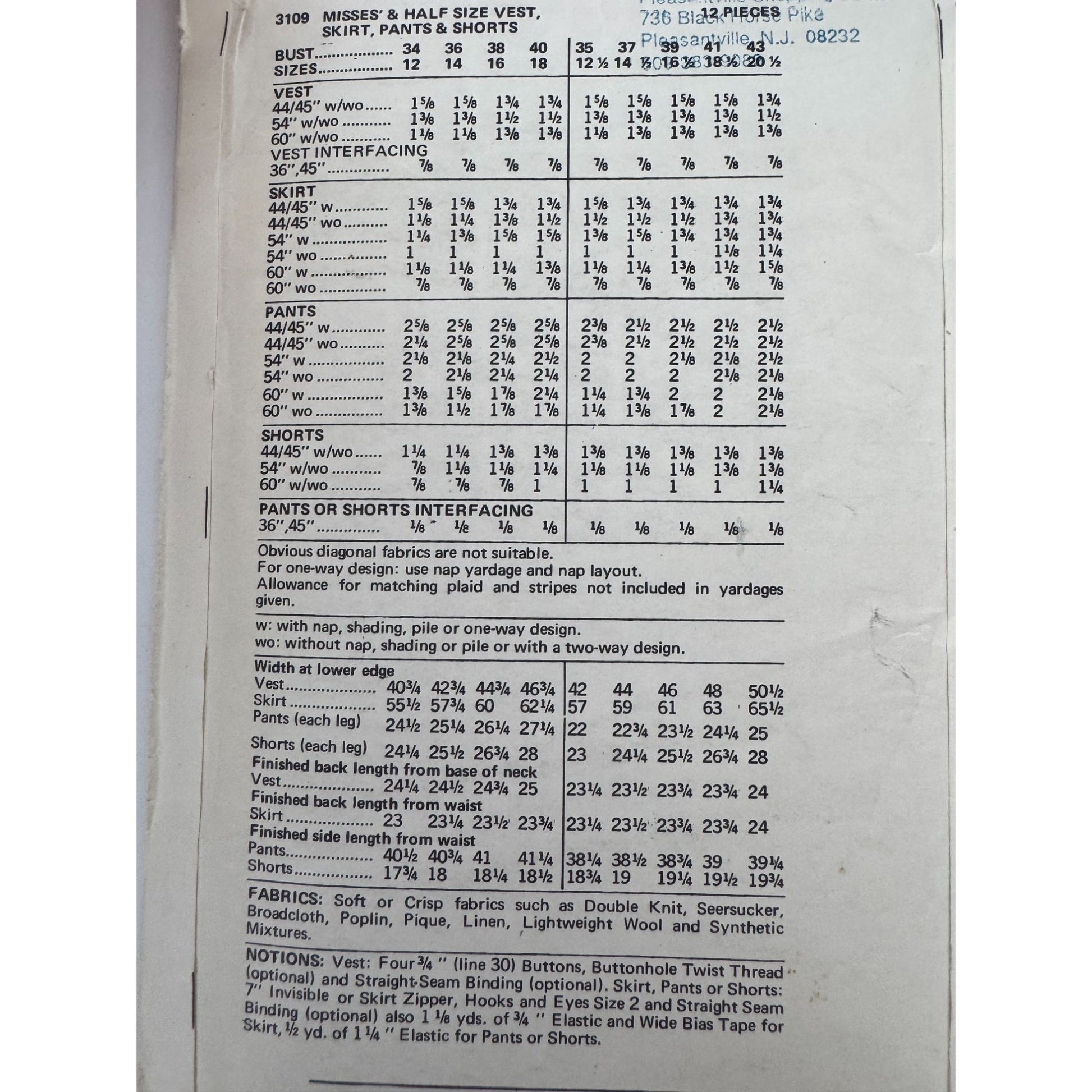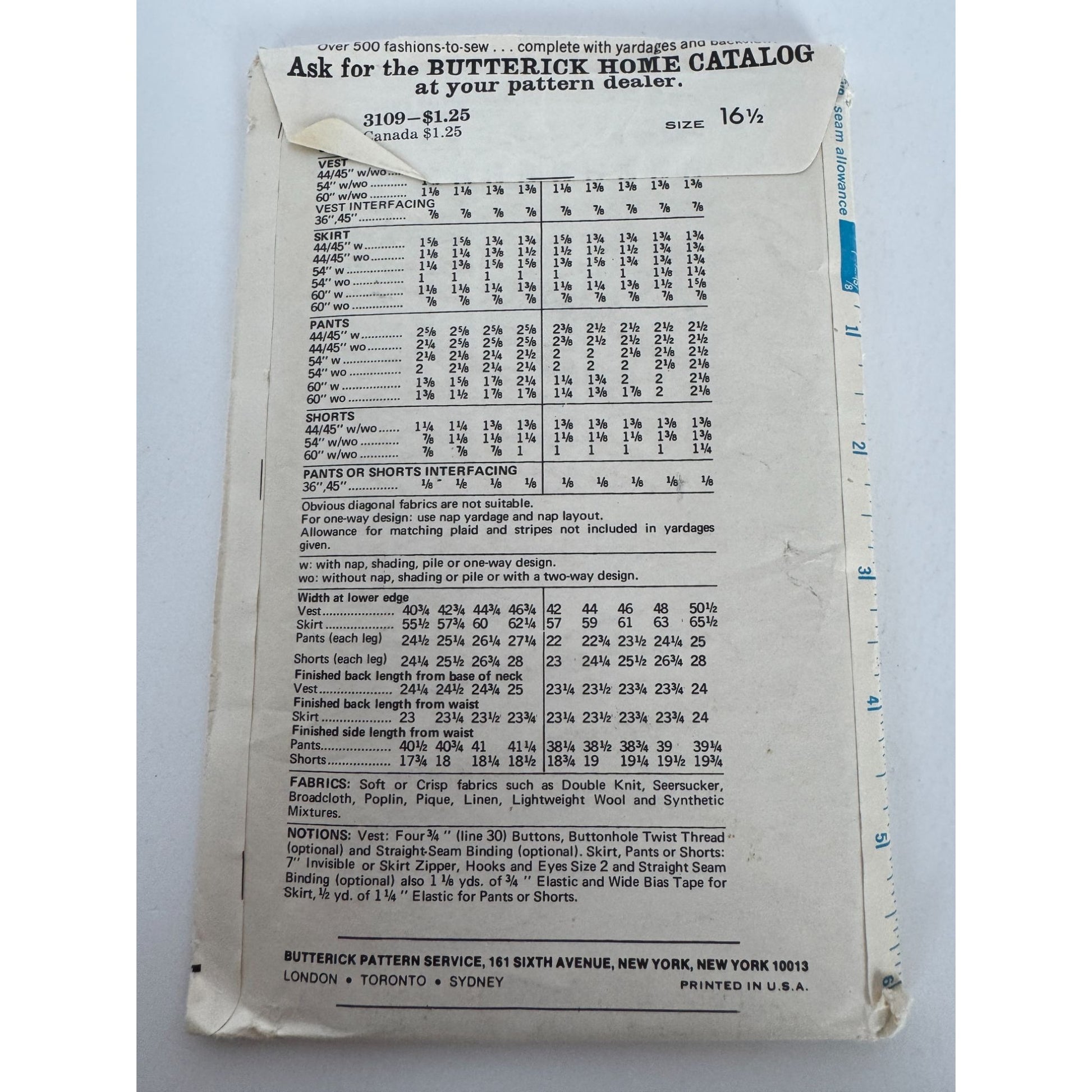 Butterick Pattern 3109 Misses Vest Skirt Pants Shorts 1970s Outfit Size 16.5 UC