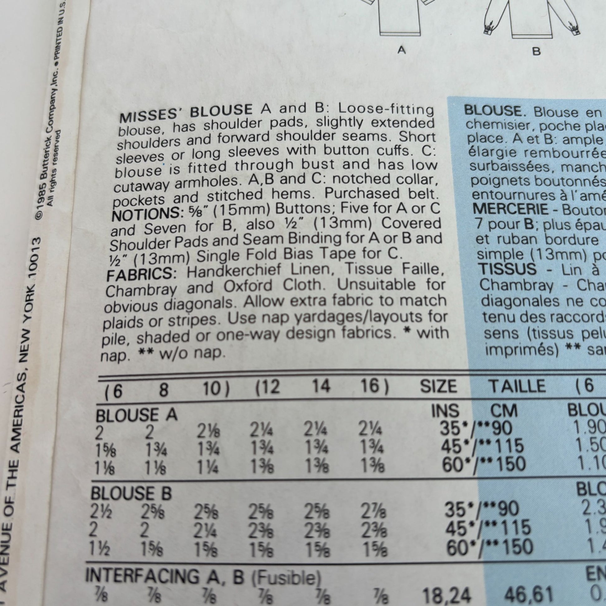 A and B: Loose-fitting blouse, has shoulder pads, slightly extended shoulders and forward shoulder seams. Short sleeves or long sleeves with button cuffs. C: blouse is fitted through bust and has low cutaway armholes. A, B and C: notched collar, pockets and stitched hems.