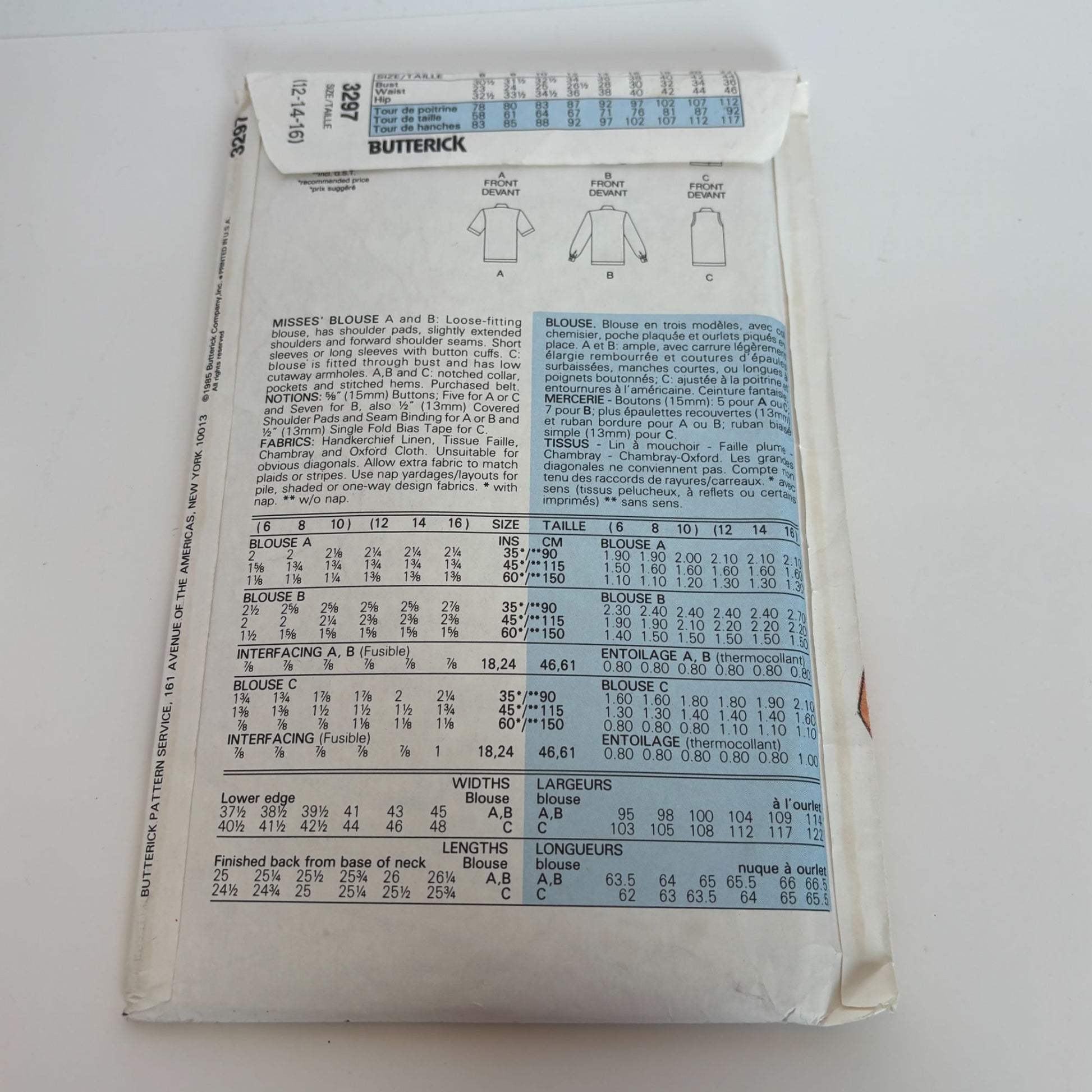 Butterick Sewing Pattern 3297: Misses' Blouse