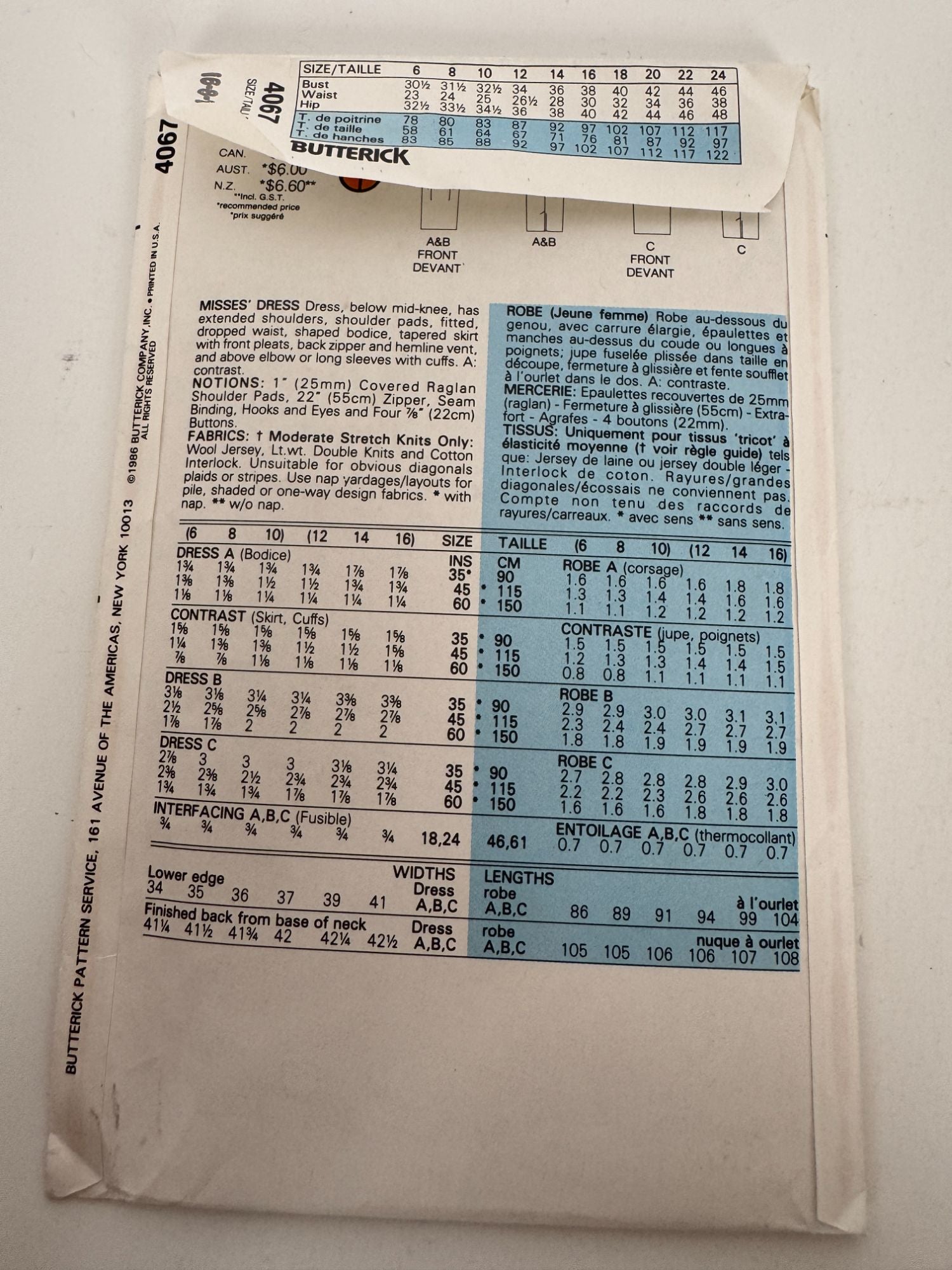 Butterick Sewing Pattern 4067: Misses' Dress
