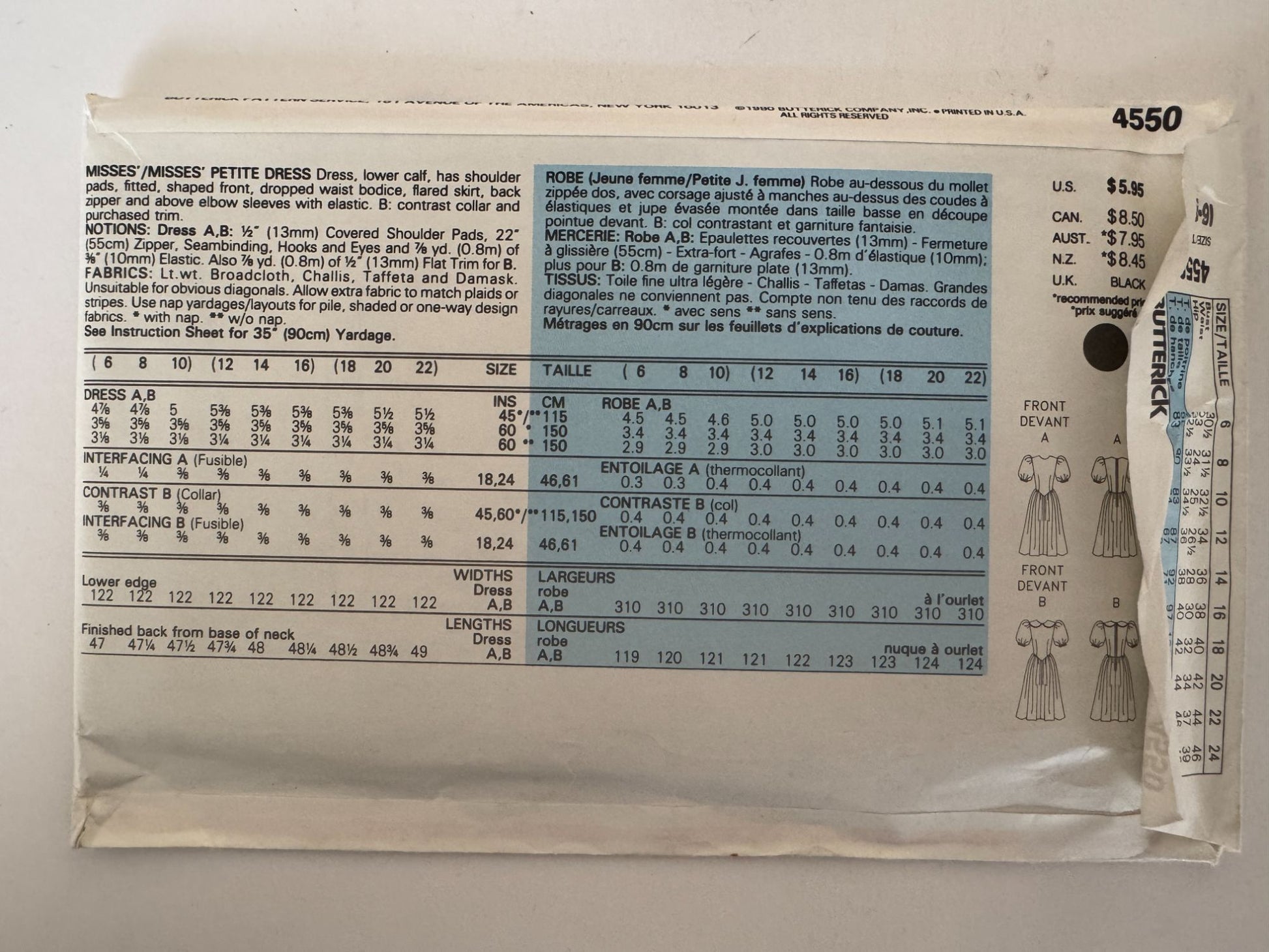 Butterick Sewing Pattern 4550 Dress Easy Back Zipper Dropped Waist Bodice 6 8 10
