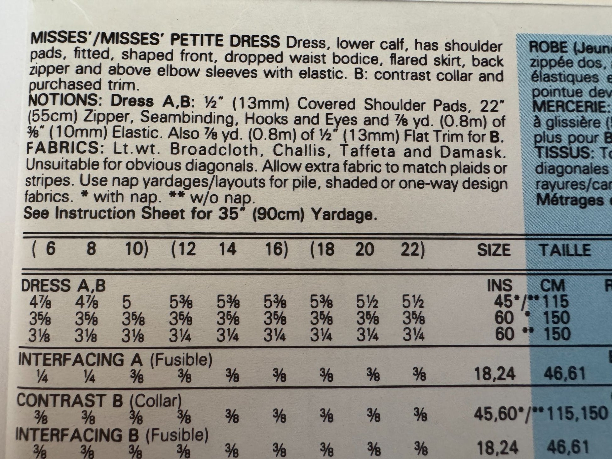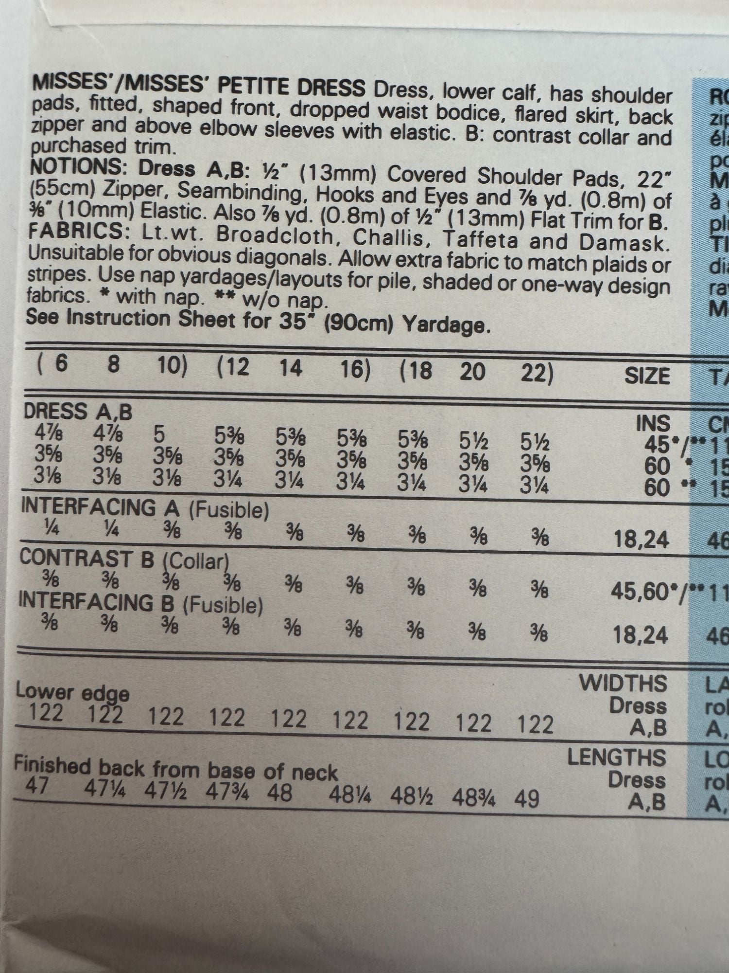 Envelope Description: Dress, lower-calf, has shoulder pads, fitted, shaped front, dropped waist bodice, flared skirt, back zipper and above elbow sleeves with elastic.