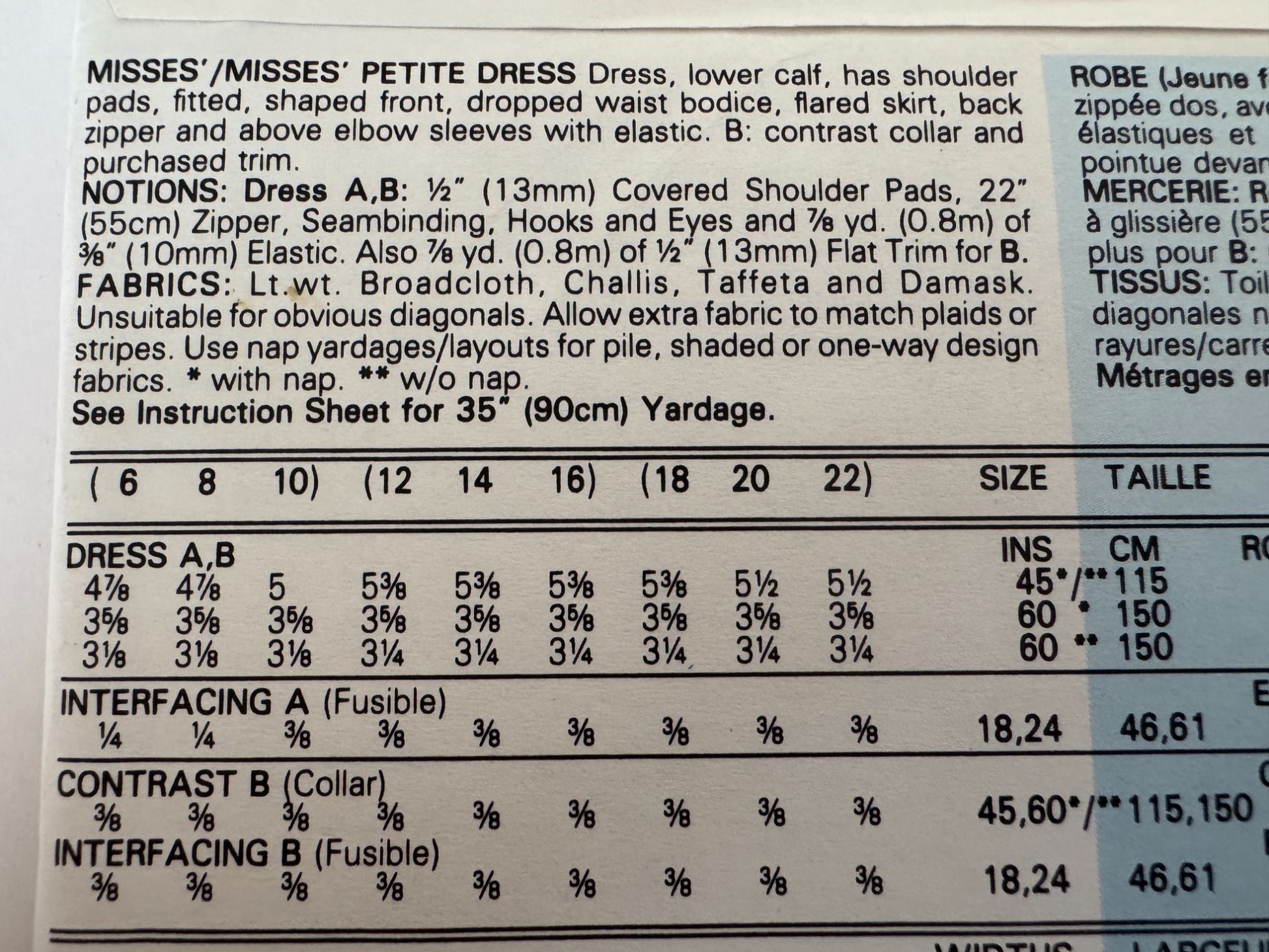 Envelope Description: Dress, lower-calf, has shoulder pads, fitted, shaped front, dropped waist bodice, flared skirt, back zipper and above elbow sleeves with elastic.