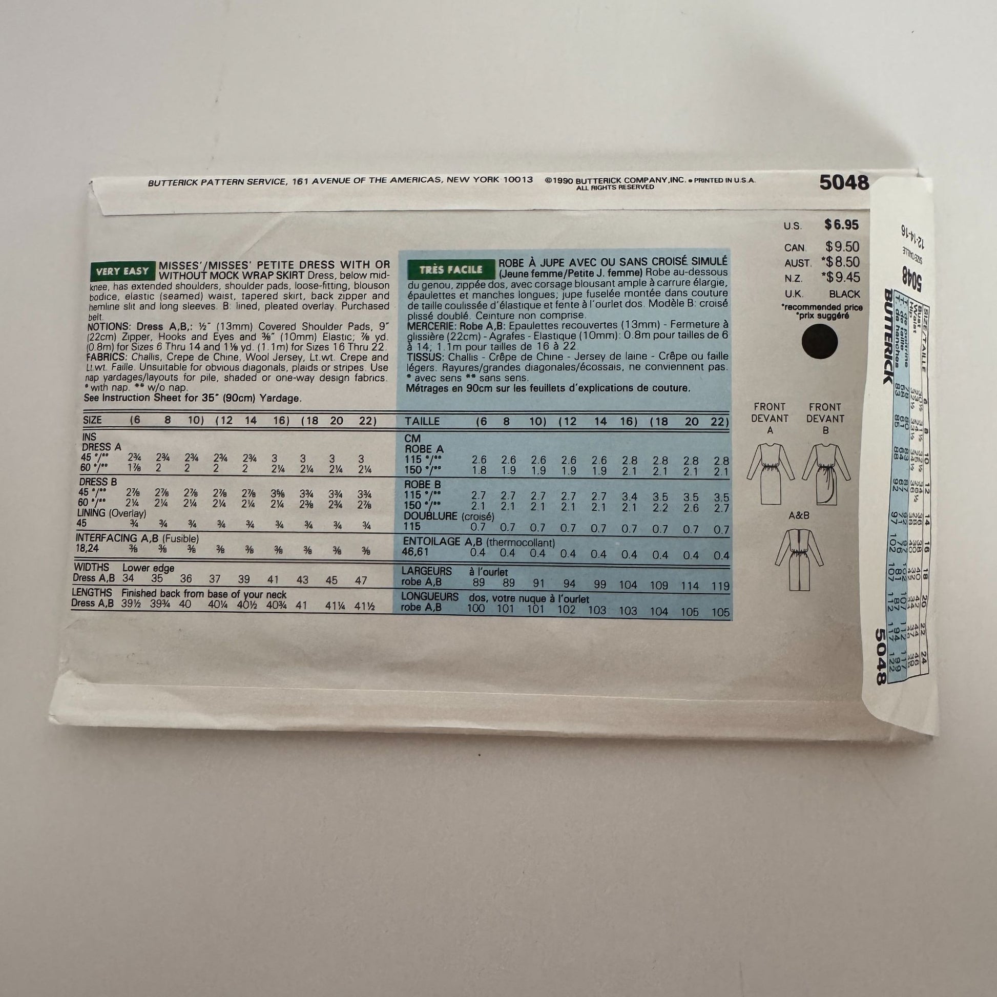 Butterick Sewing Pattern 5048 Dress with Mock Wrap Skirt Work Size 12-16 Easy UC