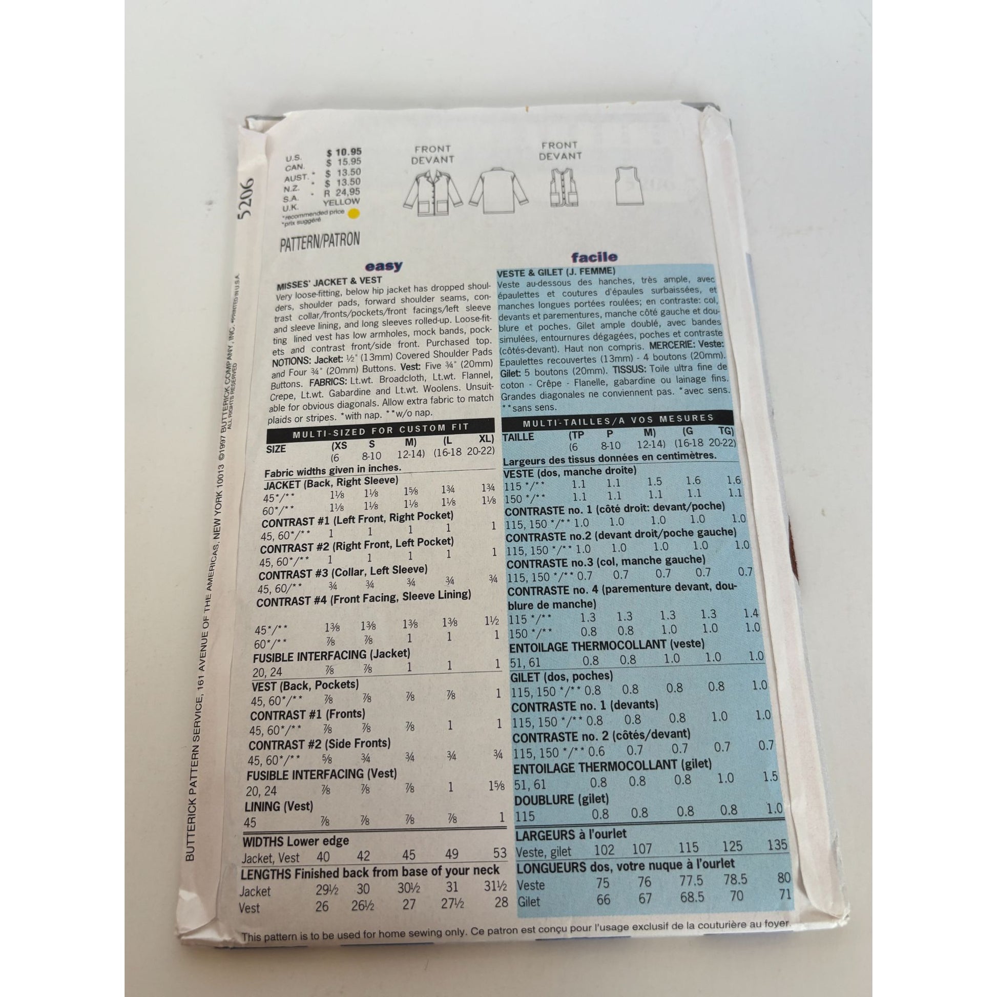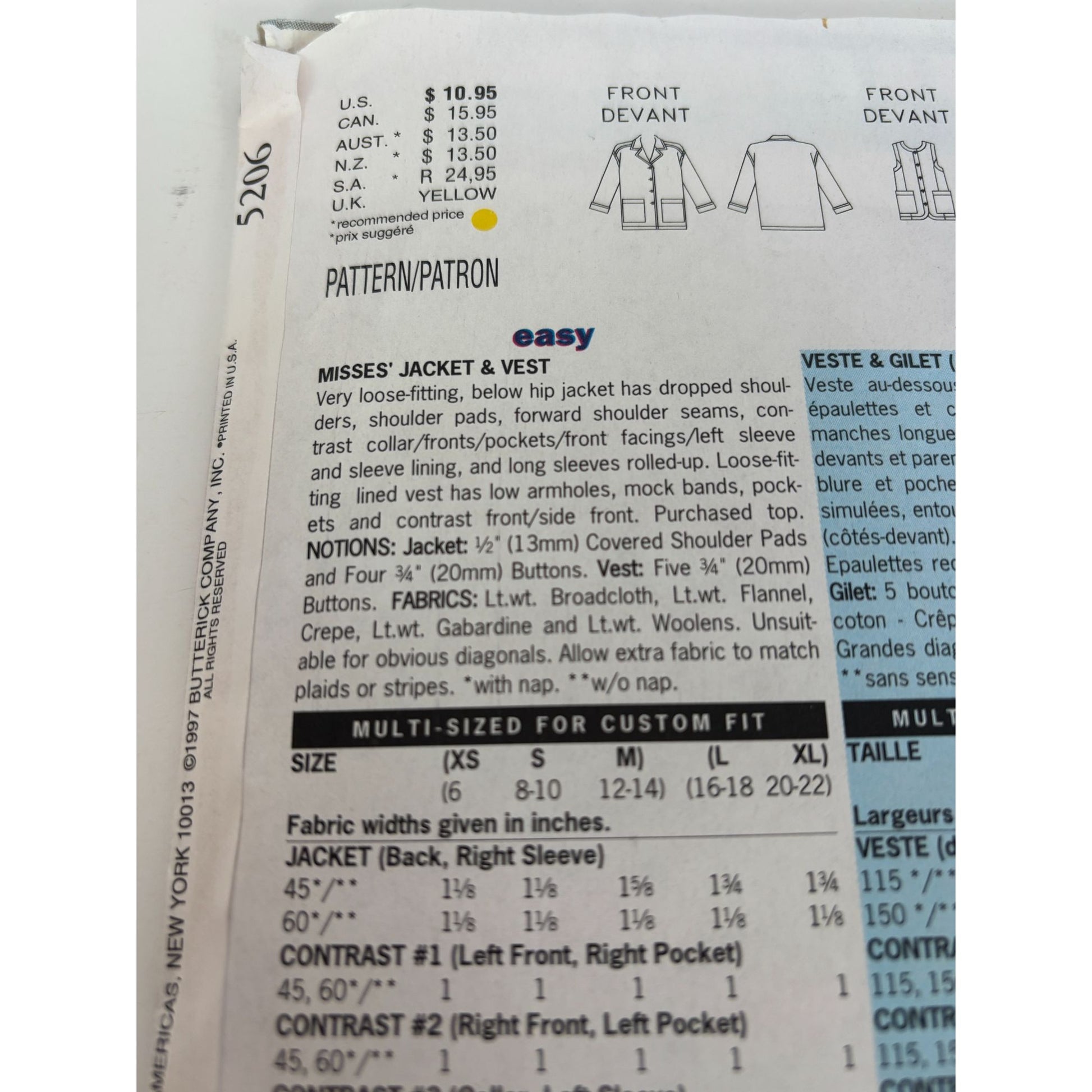Butterick Sewing Pattern 5206 Misses Jacket and Vest Easy Casual L XL 16-22 UC