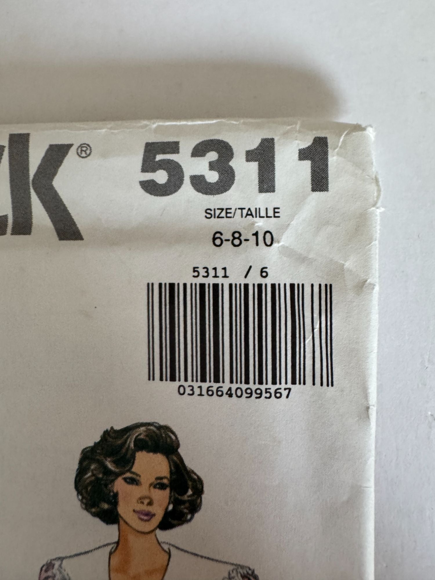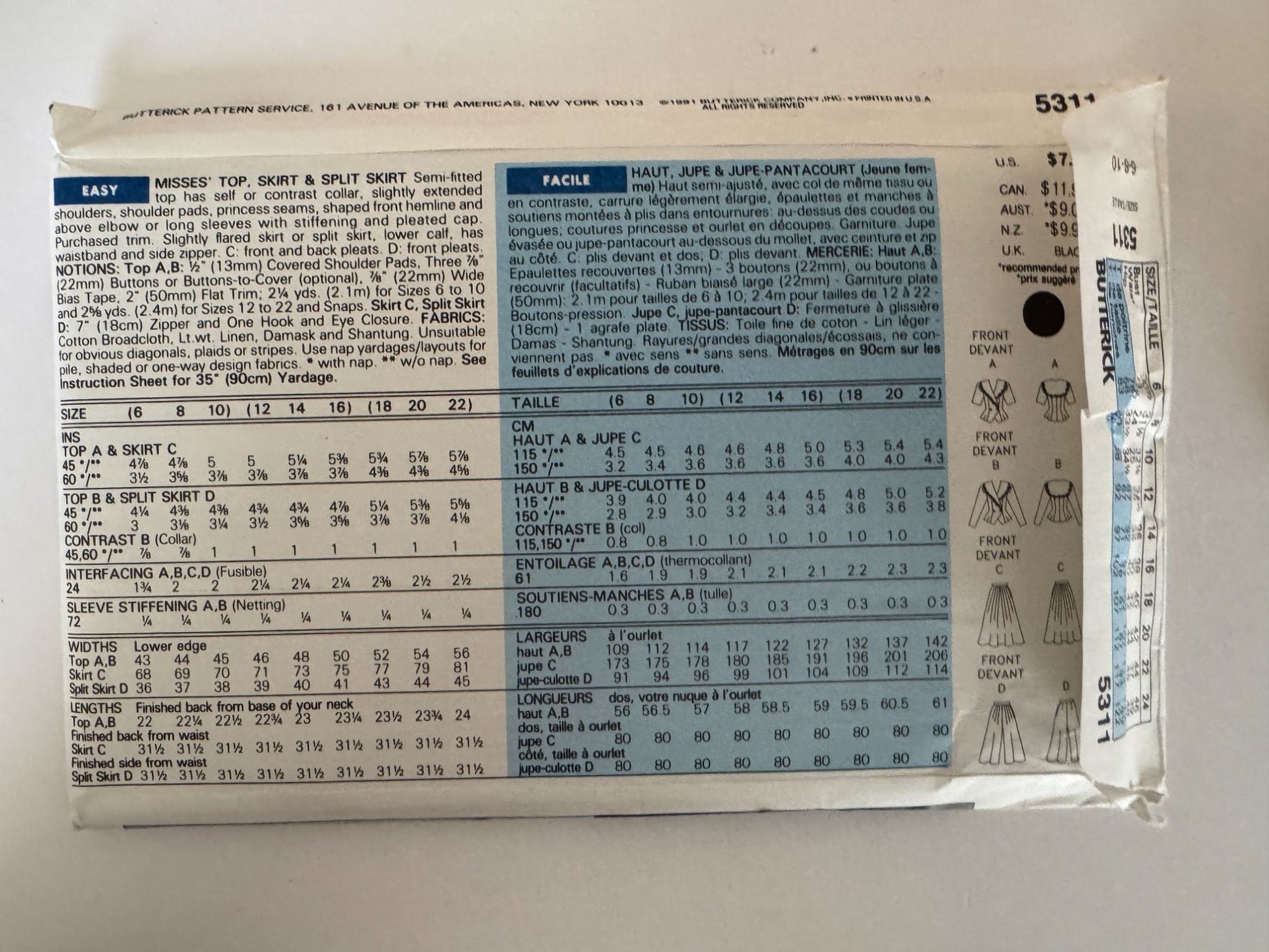 Butterick Sewing Pattern 5311 Top Peplum Skirt Split Skirt Easy 1990s UC 6 8 10