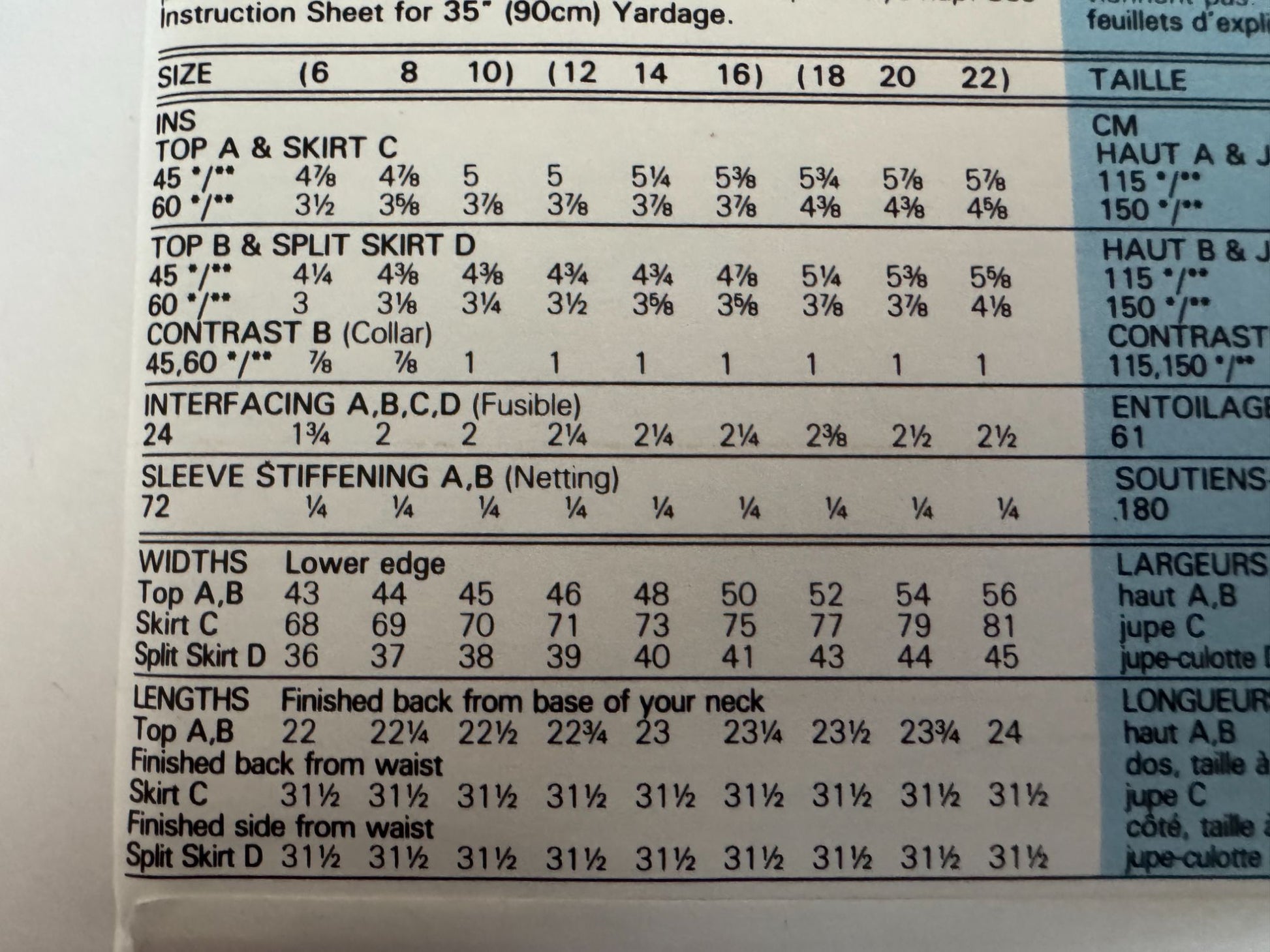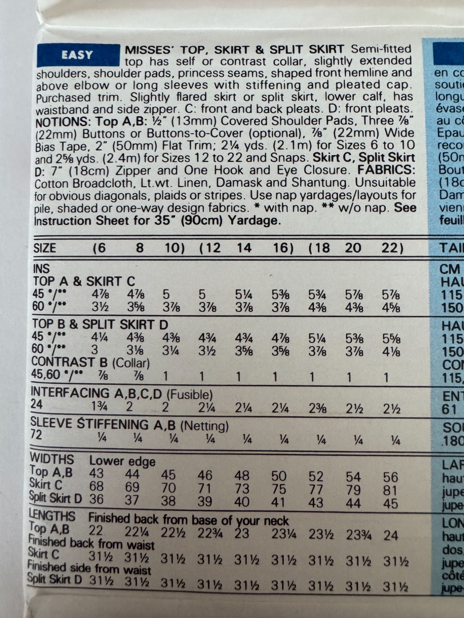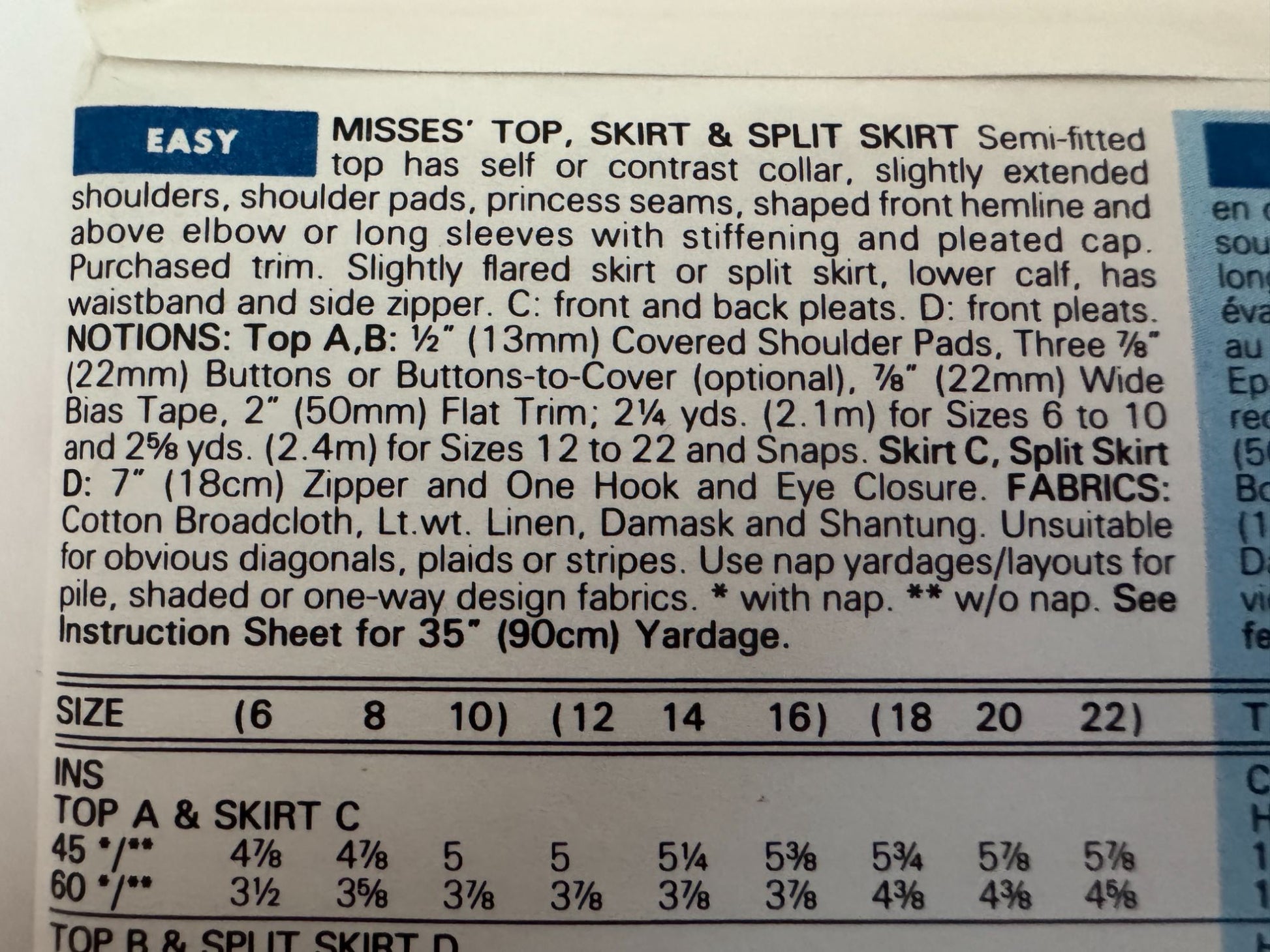 Envelope Description: Semi-fitted top has self or contrast collar, slightly extended shoulders, shoulder pads, princess seams, shaped front hemline and above elbow or long sleeves with stiffening and pleated cap. Purchased trim. Slightly flared skirt or split skirt, lower calf, has waistband and side zipper.