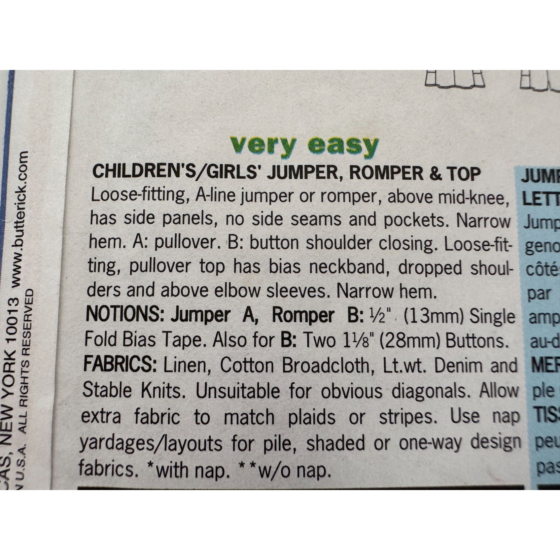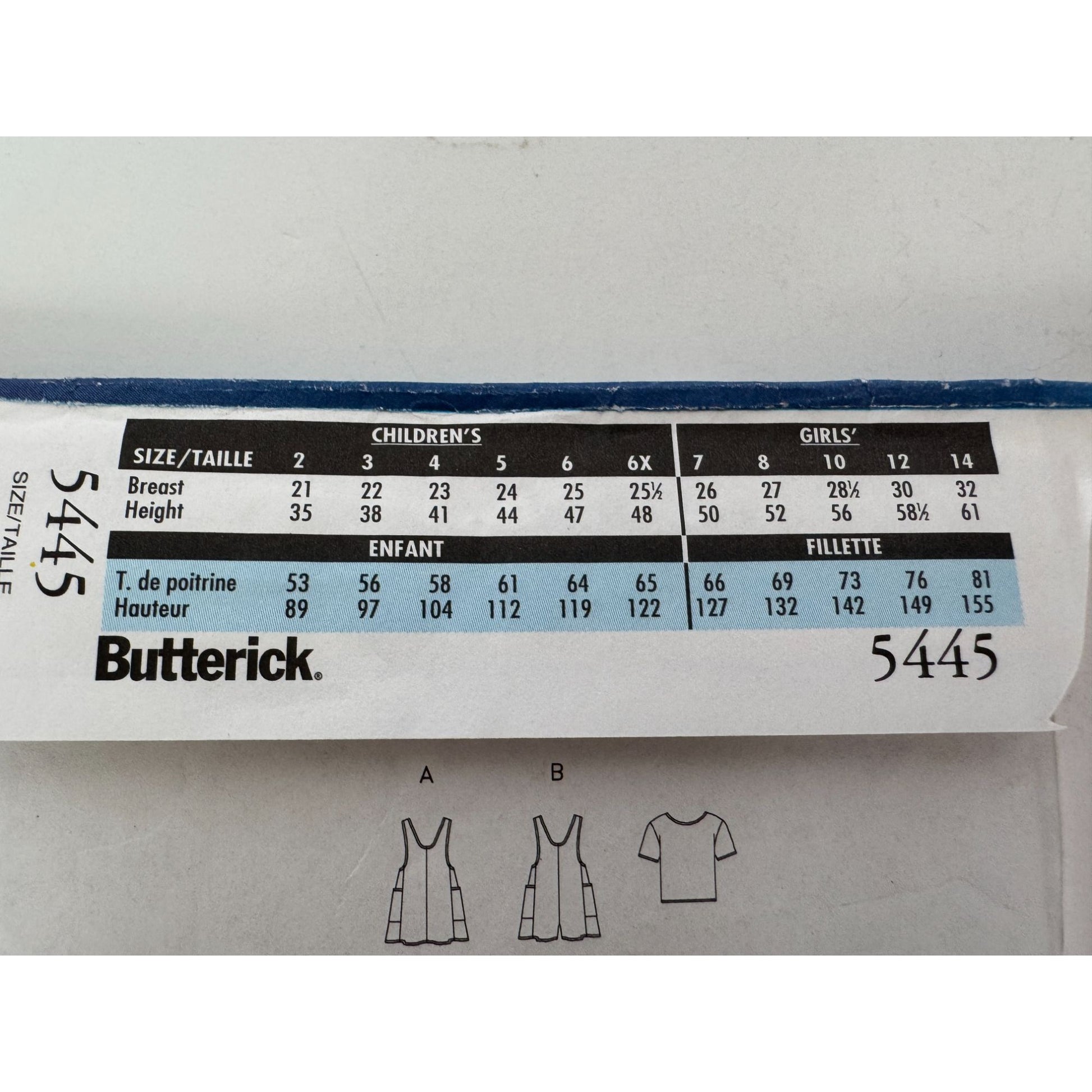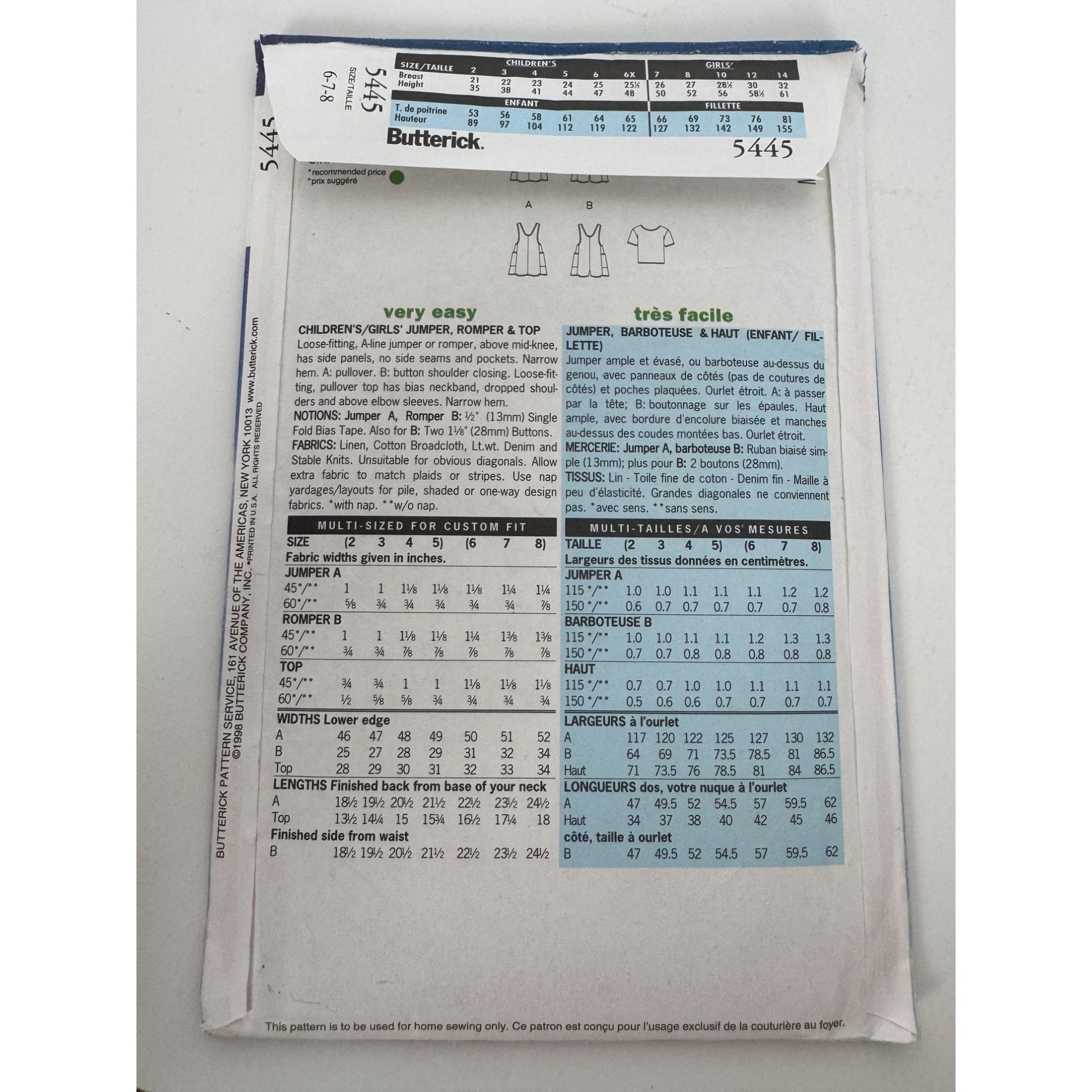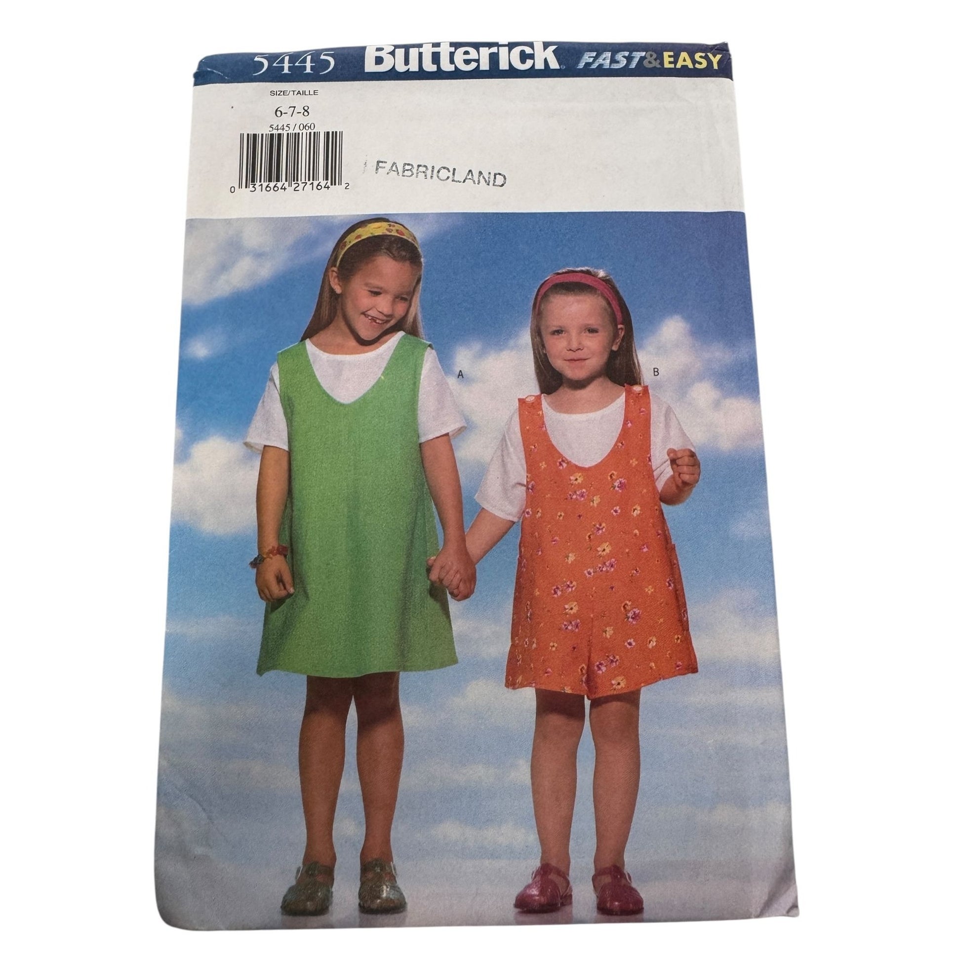 Butterick Sewing Pattern 5445 Girls Jumper and Top Create charming girls' A-line jumpers and tops with this sewing pattern. Sizes 6-8, featuring pullover and button-closure designs for versatile style. • Pullover or button shoulder closure options • Loose-fitting, A-line style • Designed for linen, cotton, or knits • Sizes 6-7-8 • Uncut