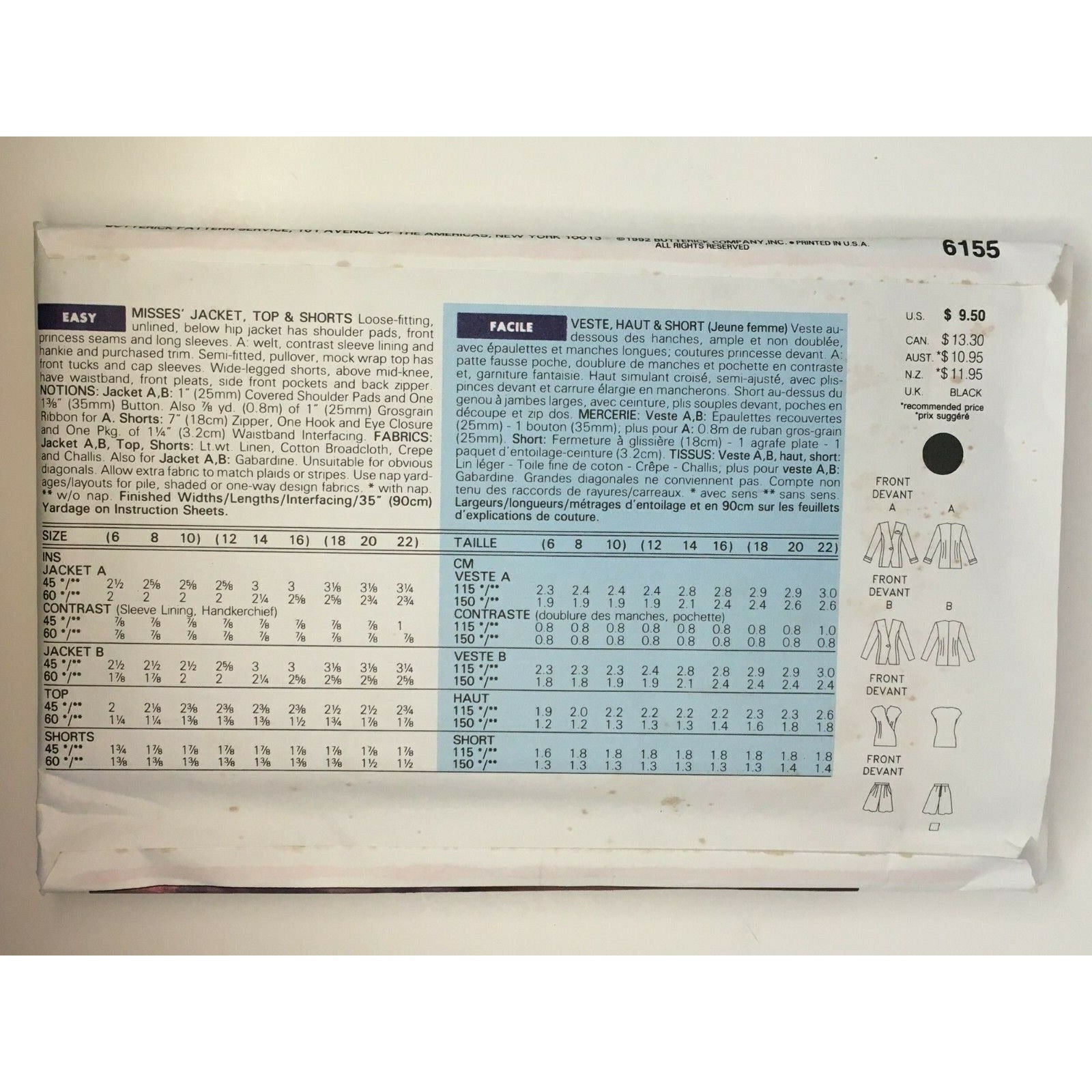 Butterick Sewing Pattern 6155 Career Suit Jacket Top Shorts Career Easy 12 14 16