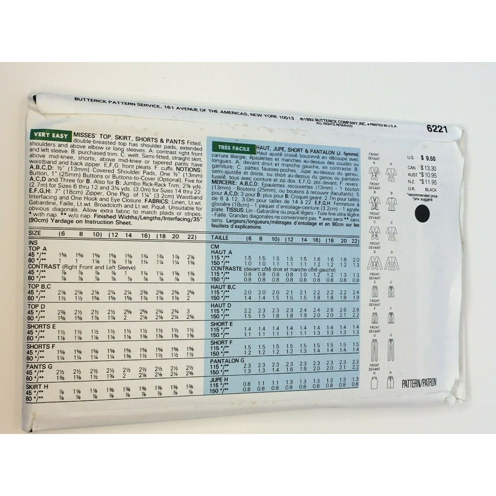 Butterick Sewing Pattern 6221 Work Suit Skirt Shorts Pants Career Outfit 6 8 10