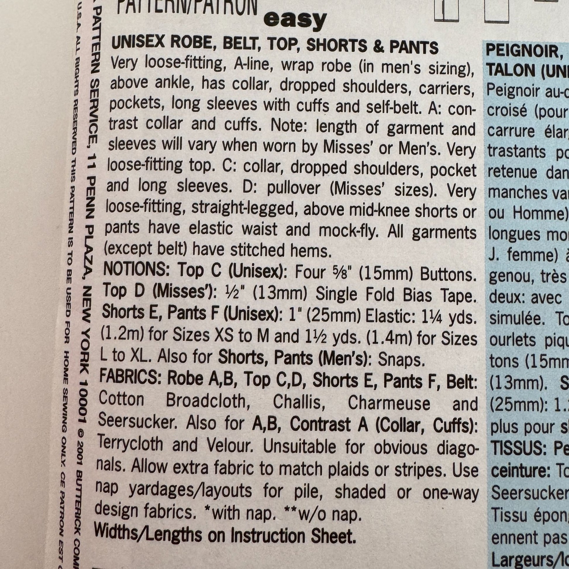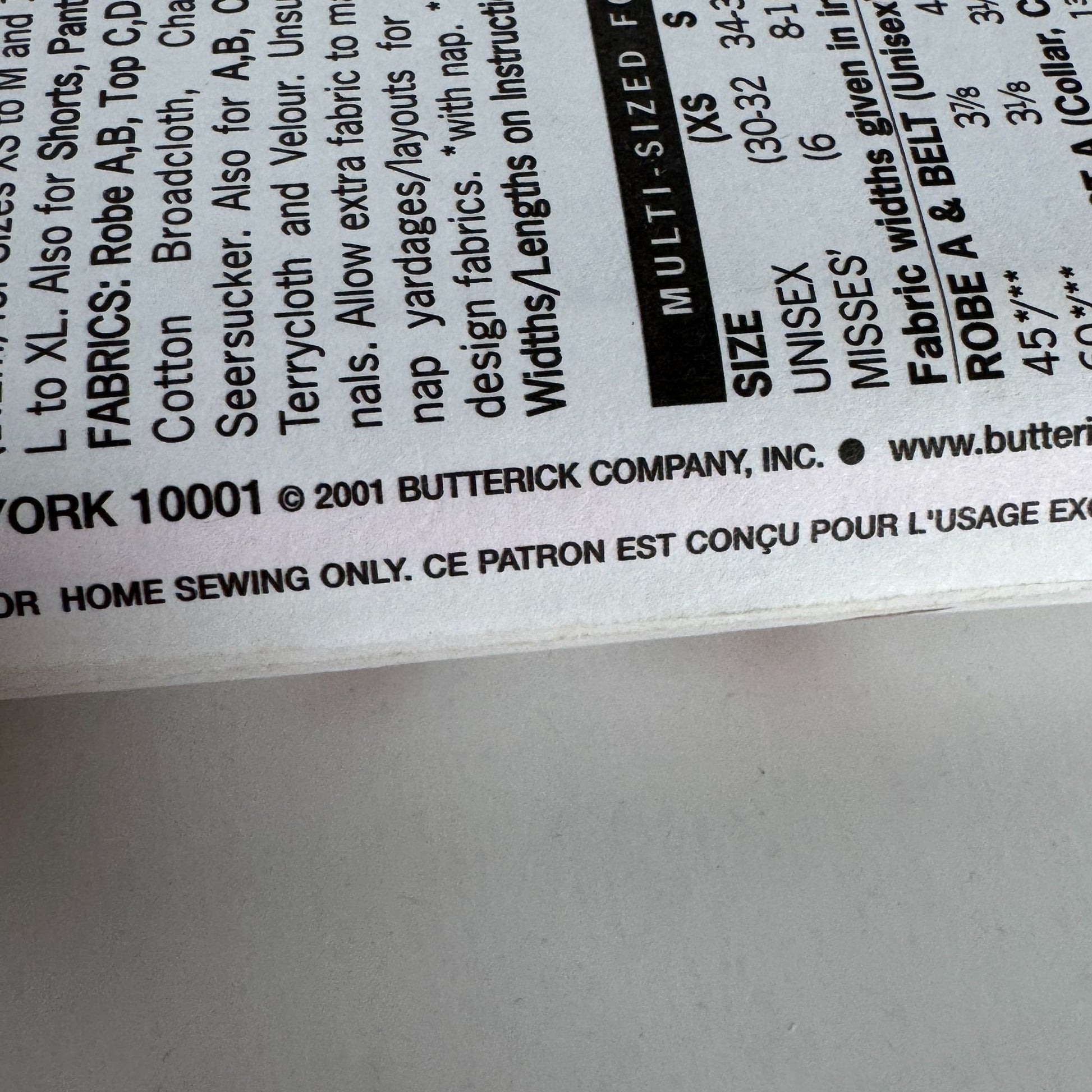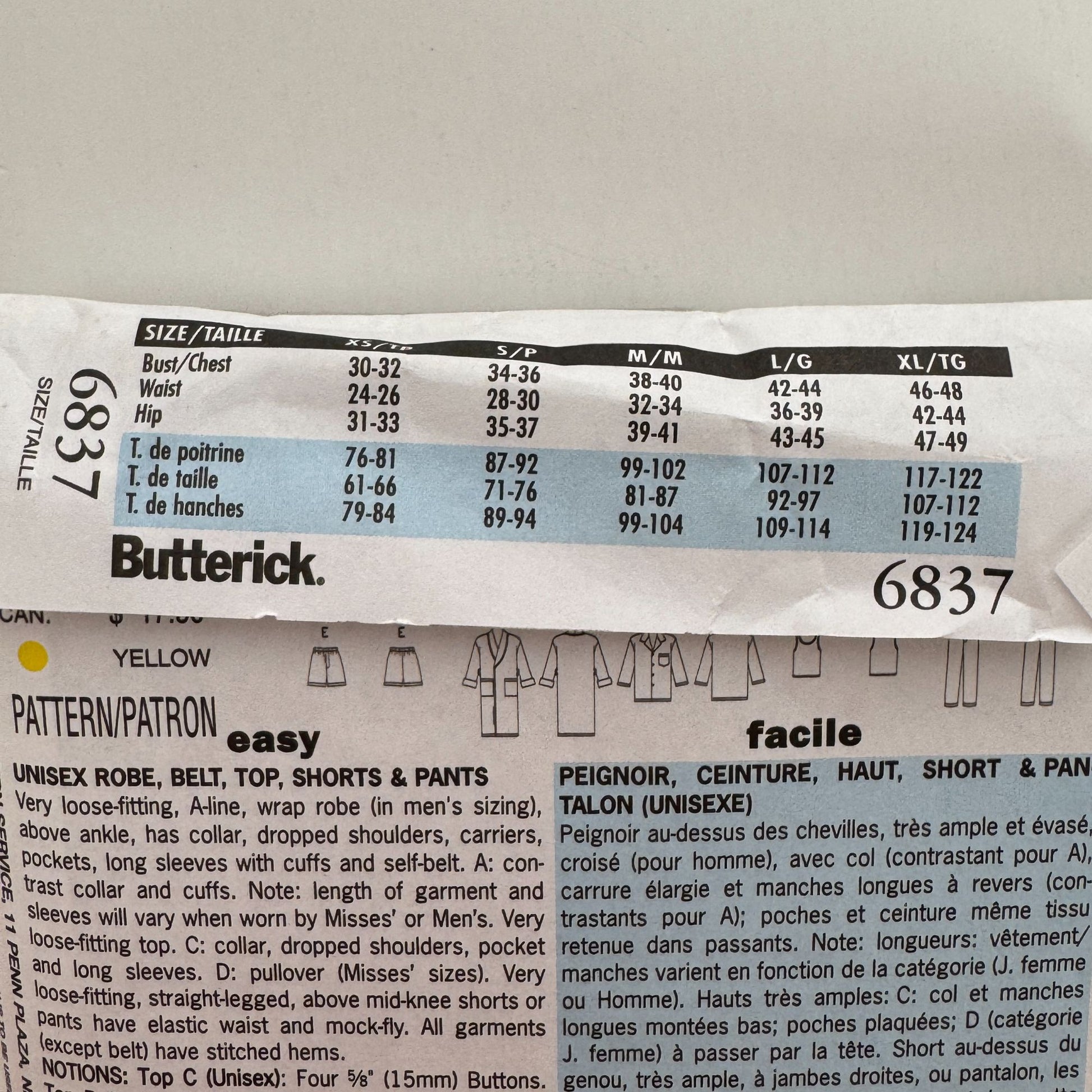 Butterick Classics Sewing pattern 6837: Unisex Robe, Belt, Top, Shorts and Pants