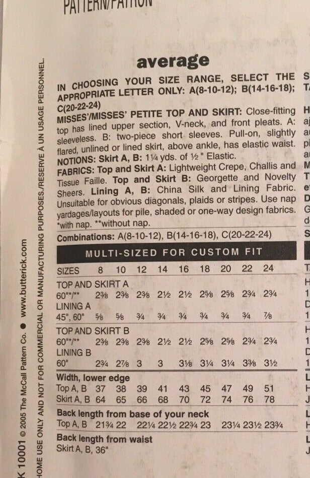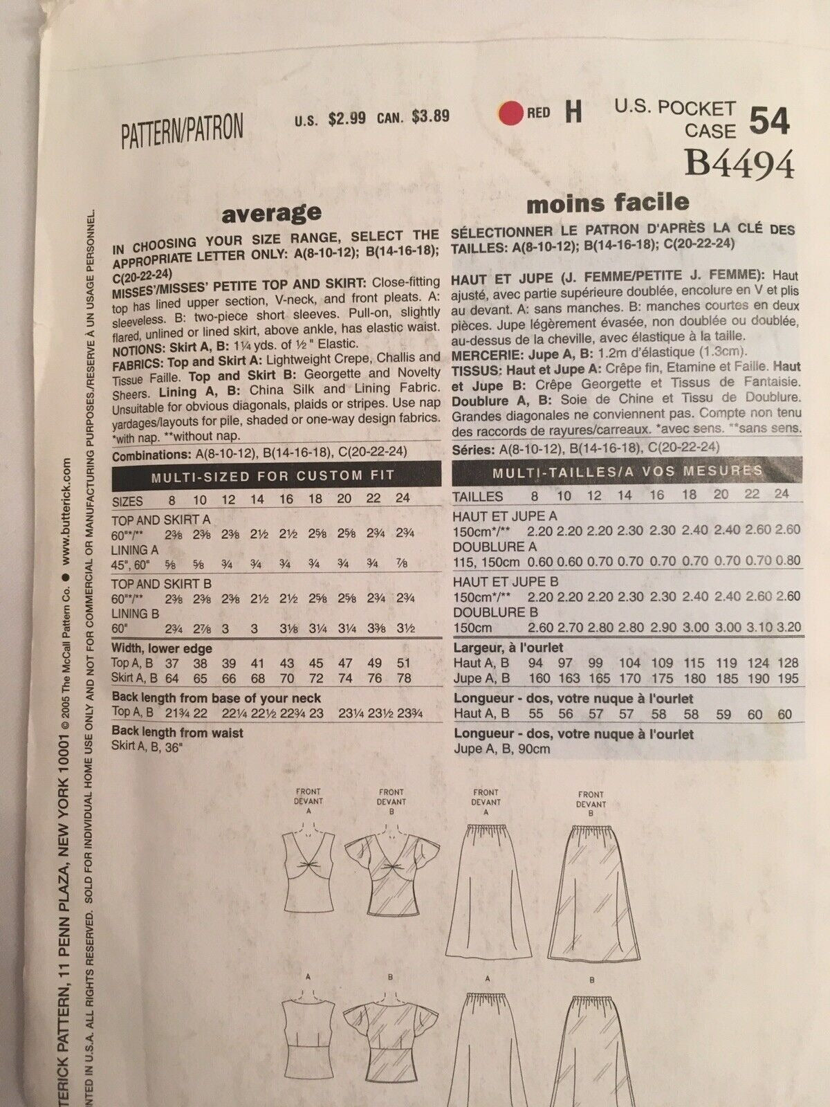 Butterick Sewing Pattern B4494 Summer Top Skirt Minimalist Easy Y2K 14 16 18 UC