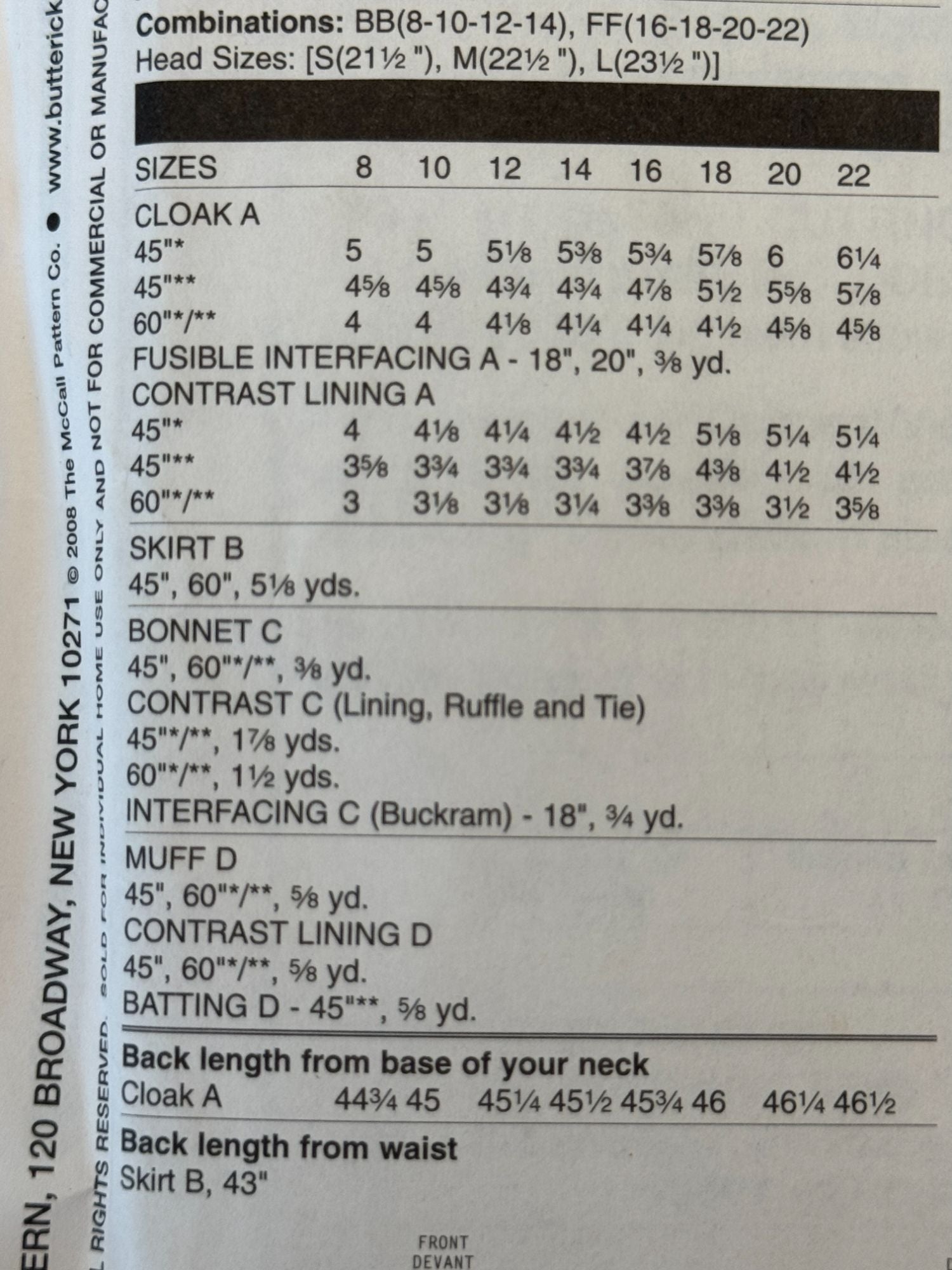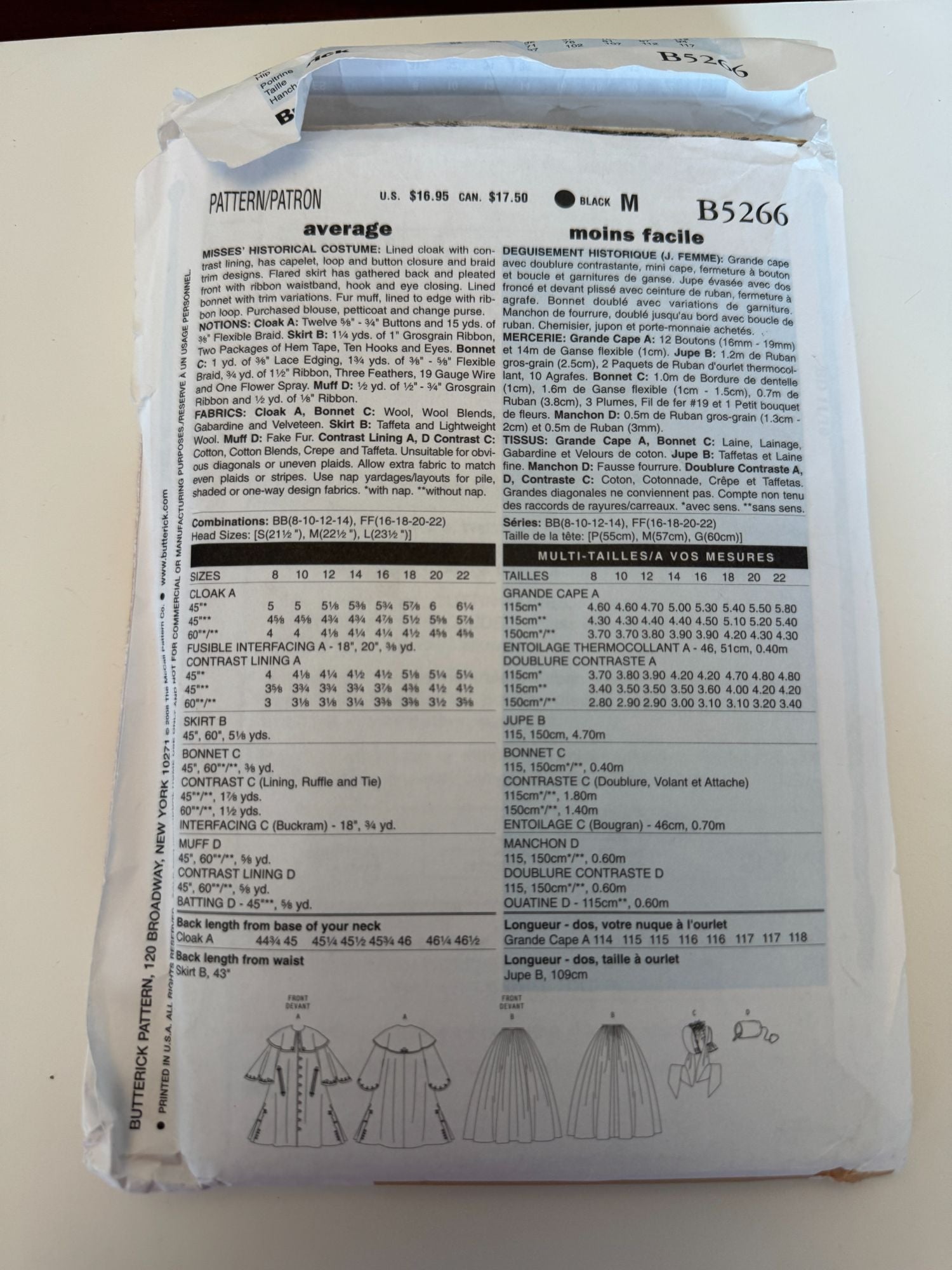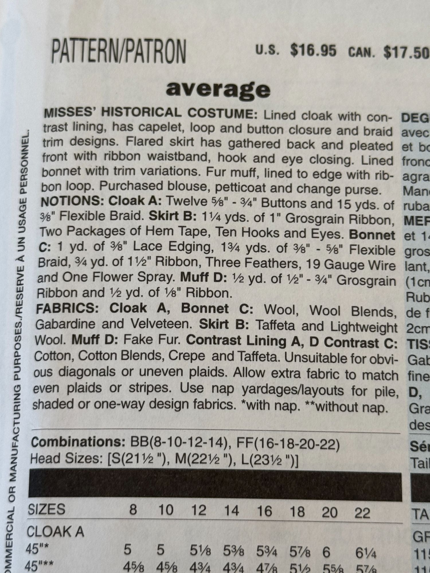 A detailed sewing pattern for creating a Victorian-style ensemble including a lined cloak with capelet, skirt, bonnet, and muff. Ideal for historical reenactments, Christmas caroling or costume events.