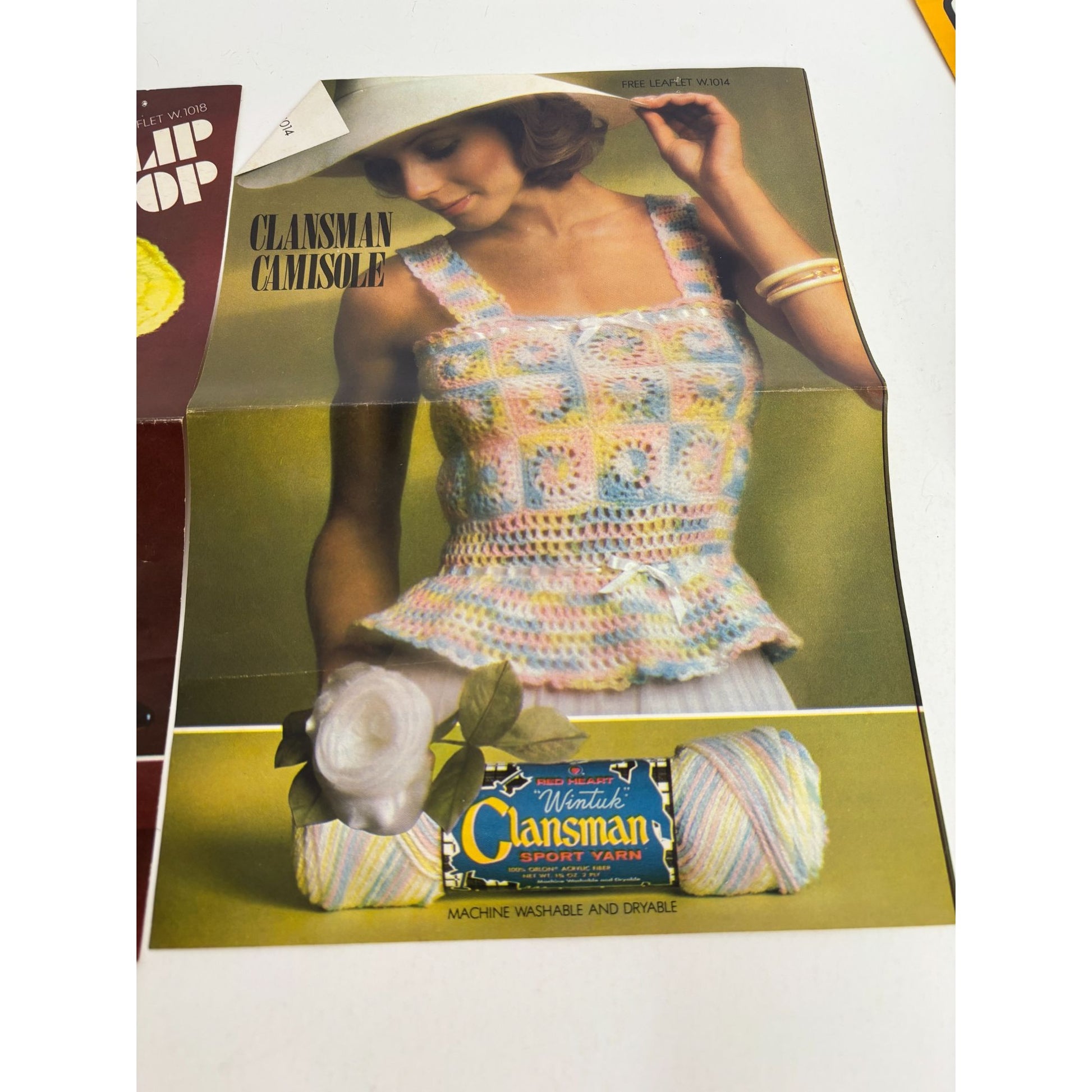 This vintage crochet pattern leaflet offers instructions for crafting a unique sleeveless camisole sweater. The leaflet showcases the use of vibrant yarns and intricate stitch patterns, providing a nostalgic touch for crochet enthusiasts.