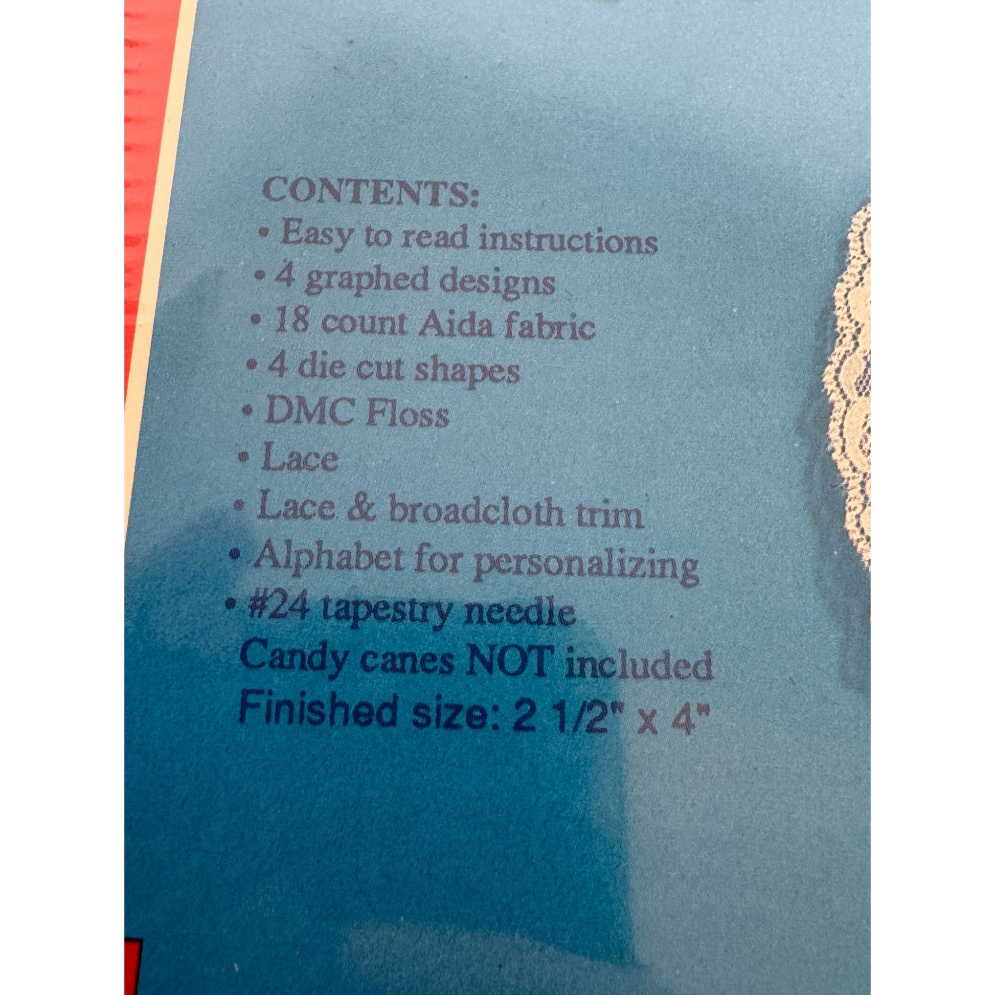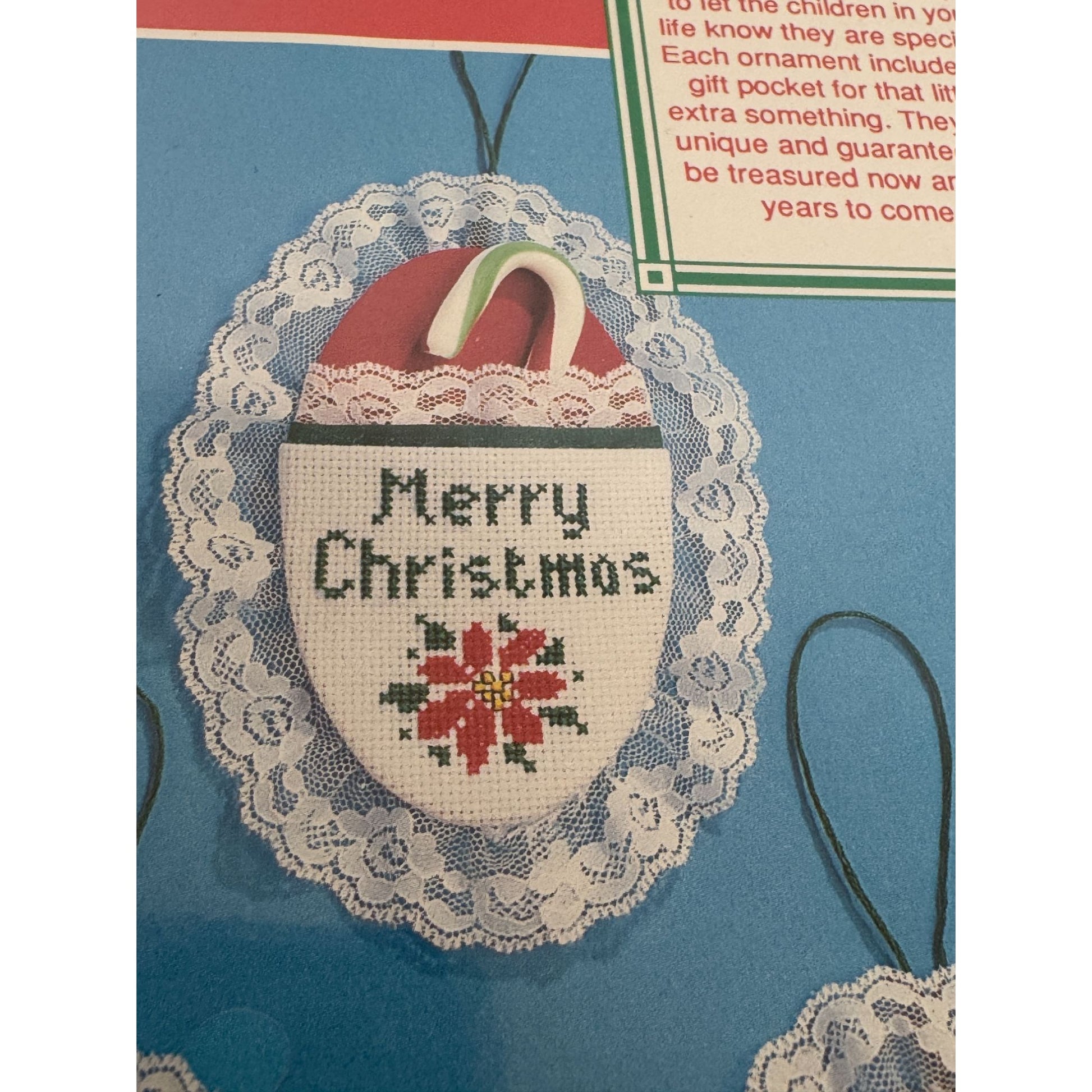 Create festive and personalized Christmas ornaments with this complete cross-stitch kit featuring four charming designs and lace accents. Each ornament includes a gift pocket.