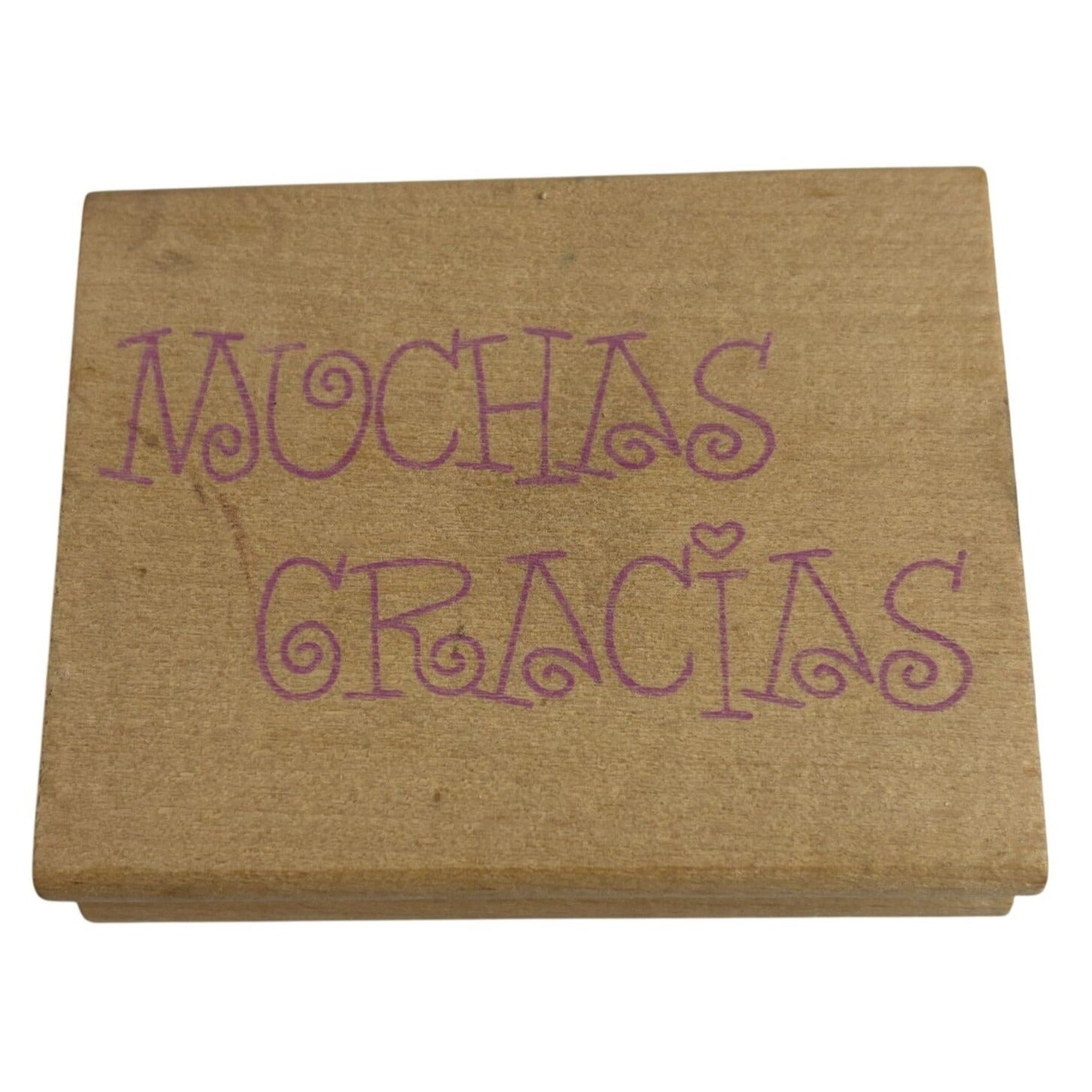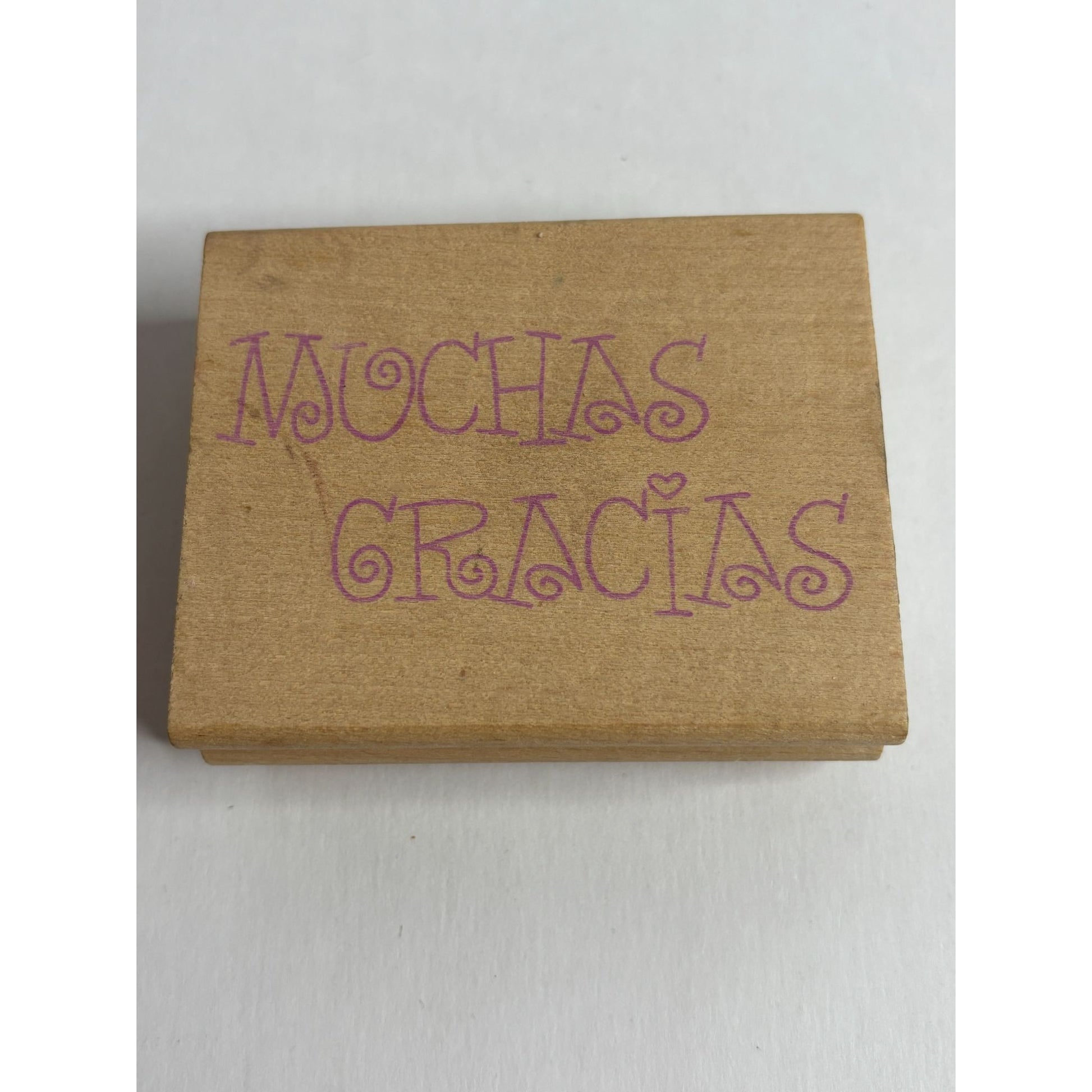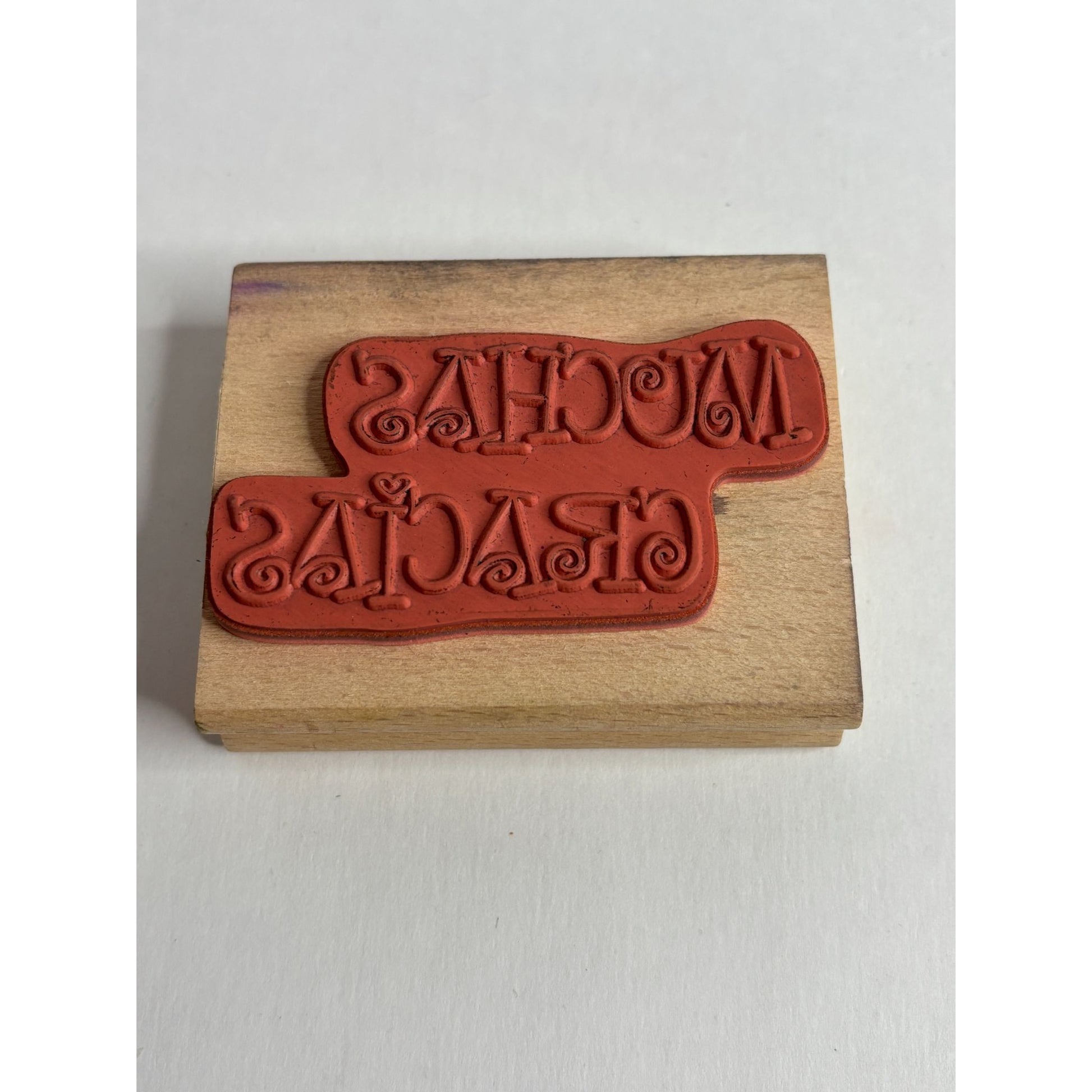 This rubber stamp features the phrase "Muchas Gracias" in a charming, whimsical font. Great for personalizing thank you notes.