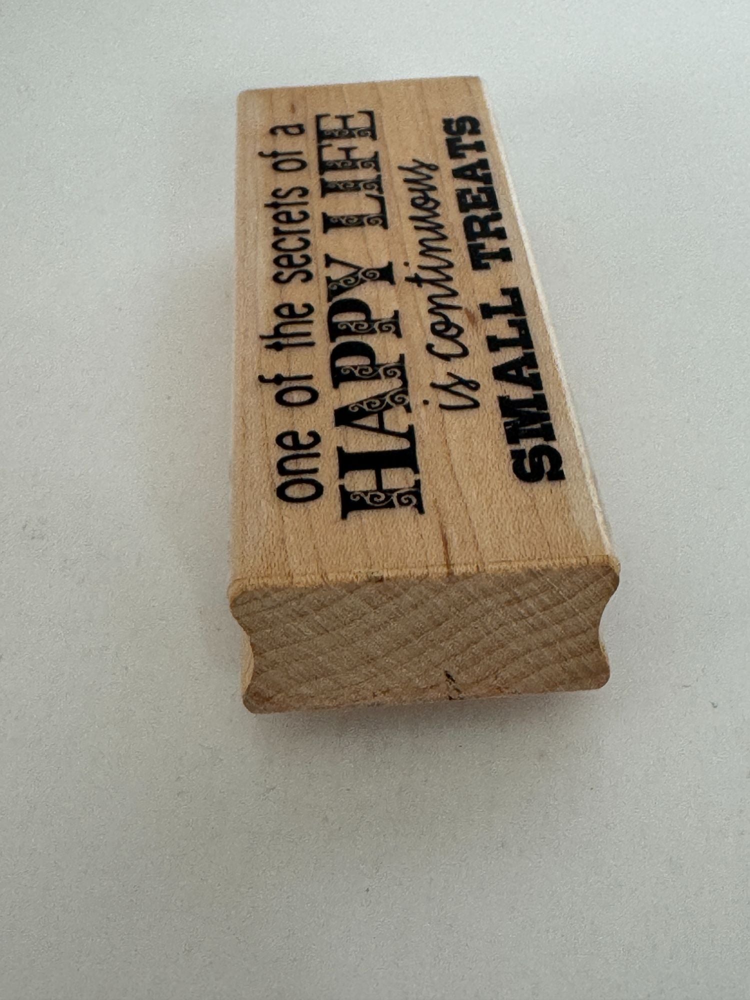 The stamp reads "One of the secrets of a Happy Life is continuous Small Treats"