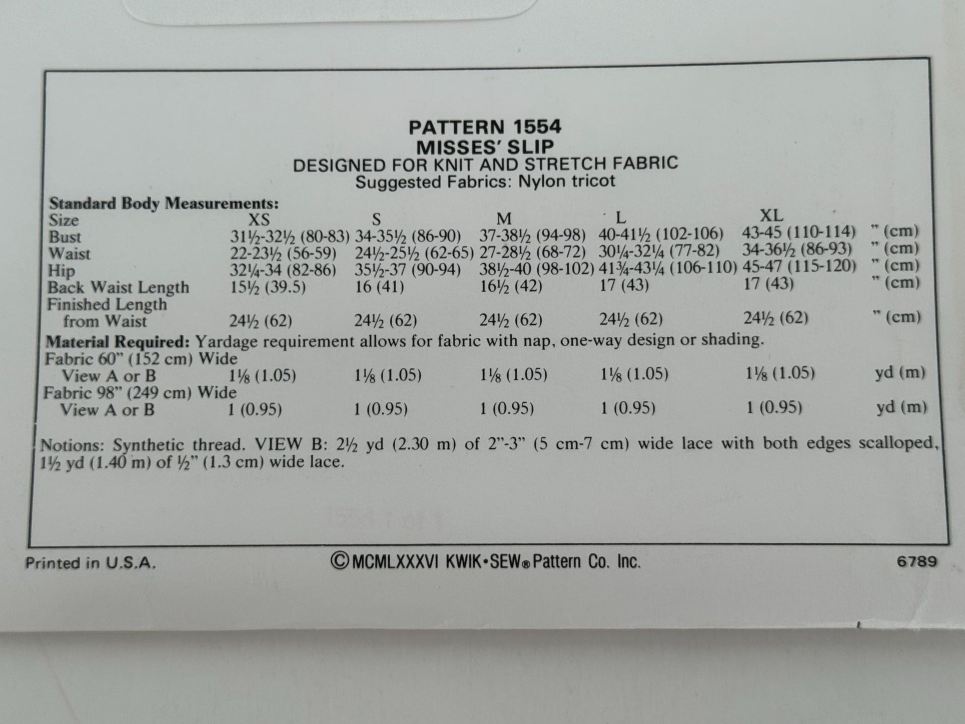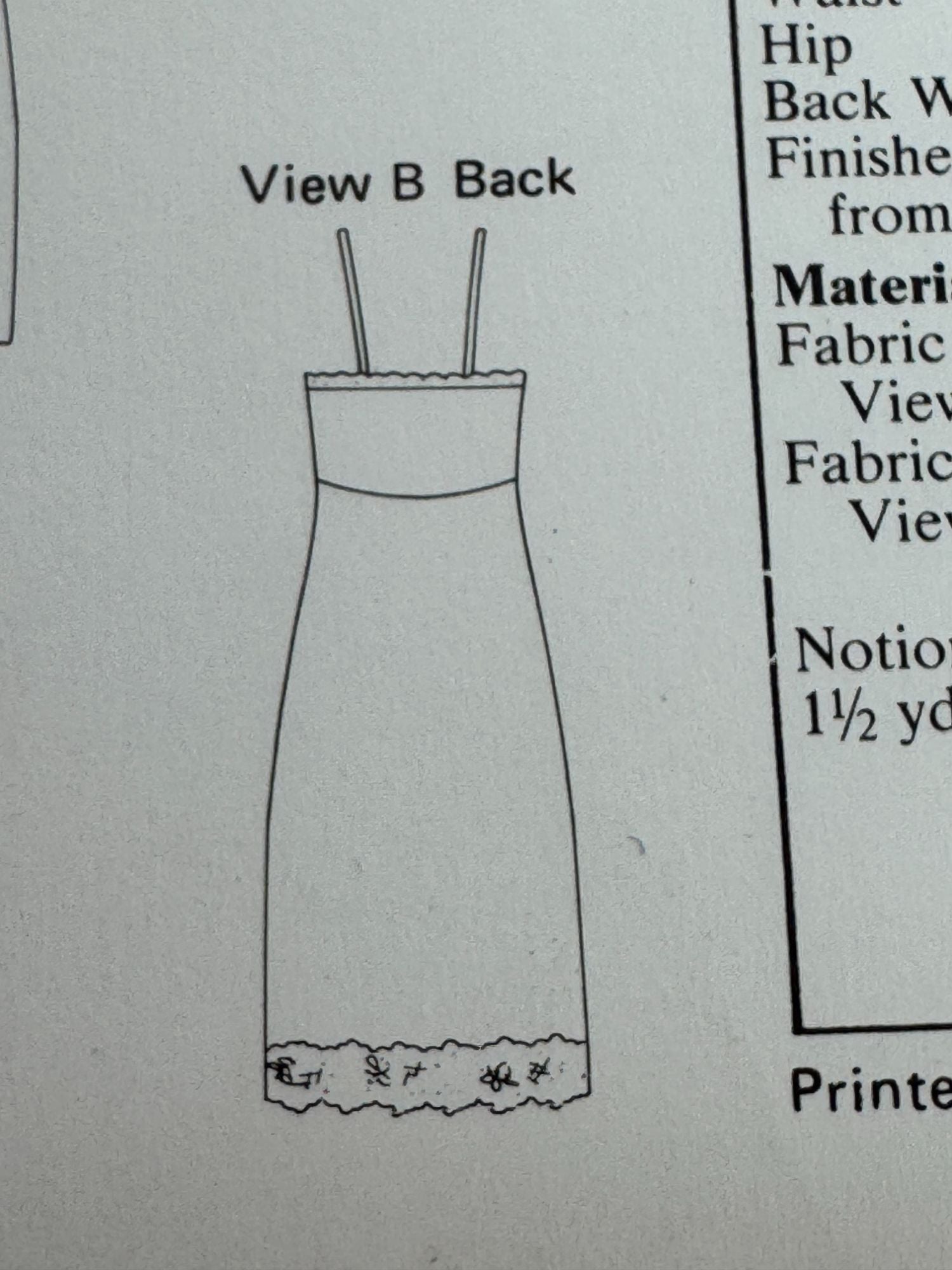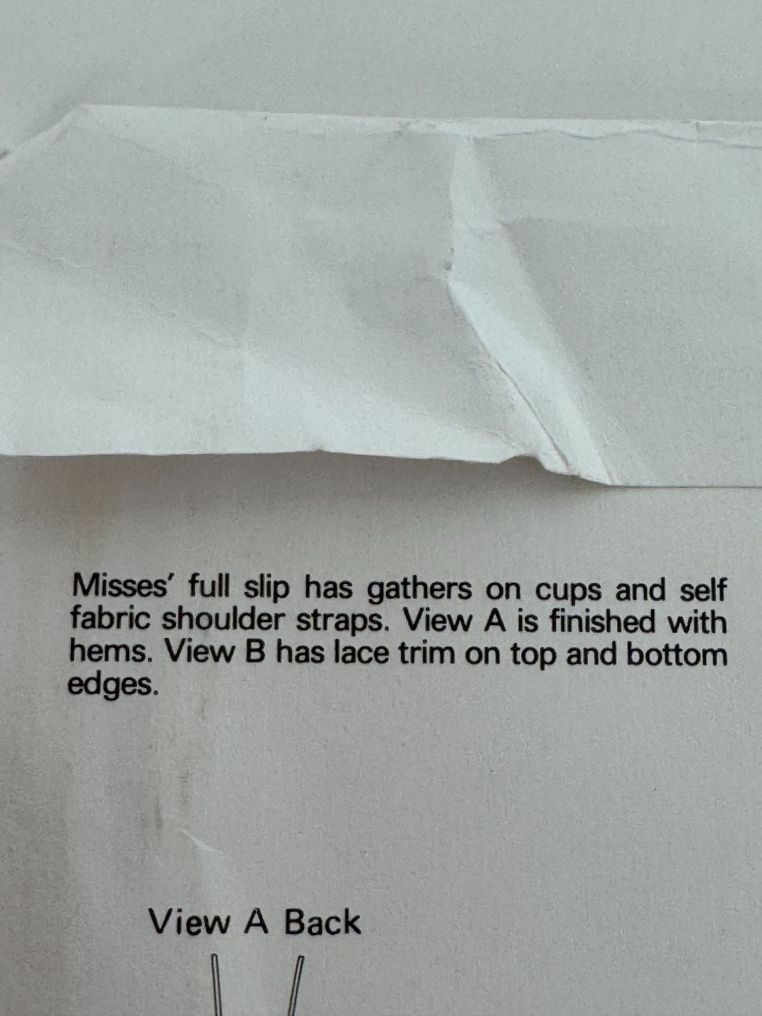 This pattern offers a detailed guide for creating elegant misses' slips. The full slip has gathers on cups and shoulder straps. Finished with optional lace trim.