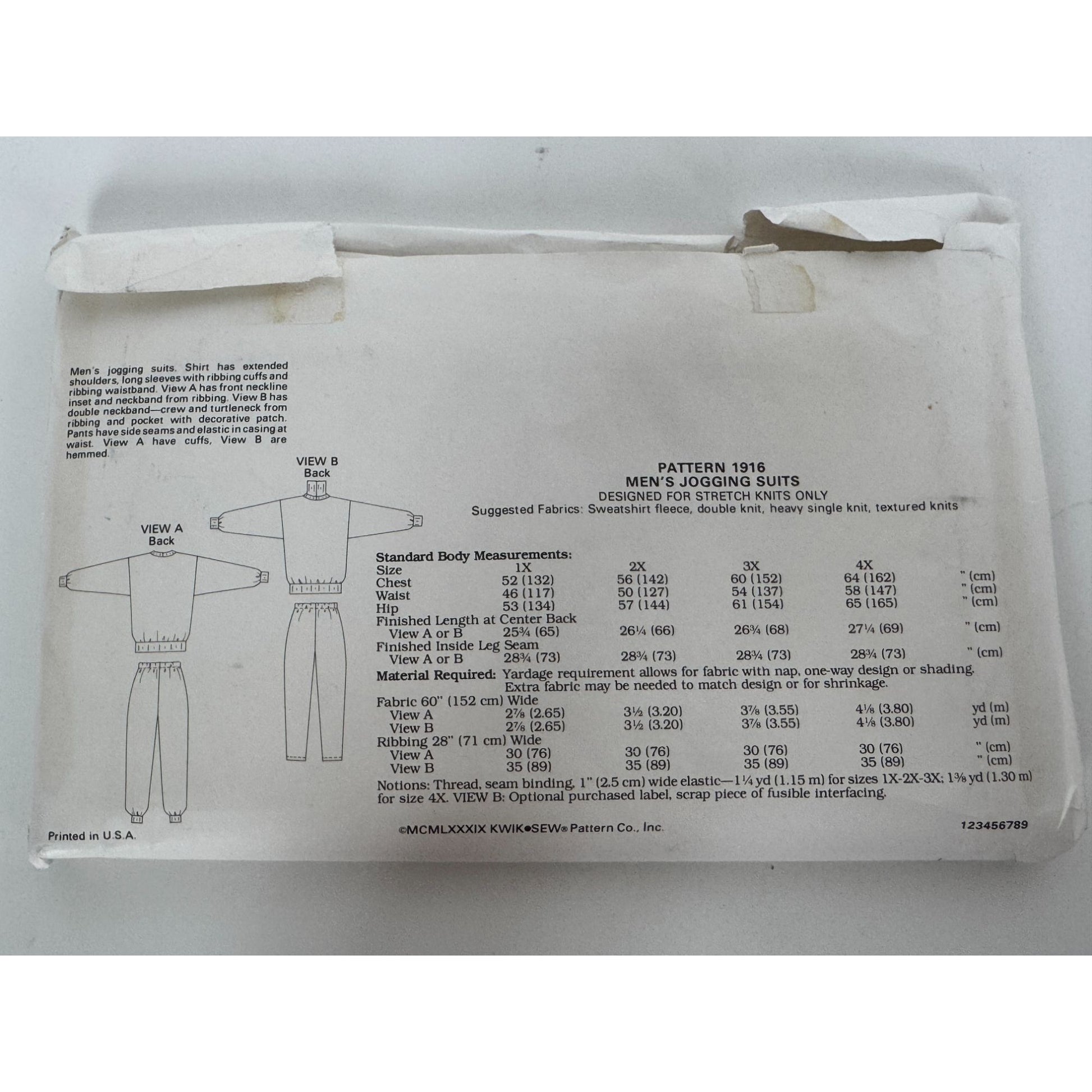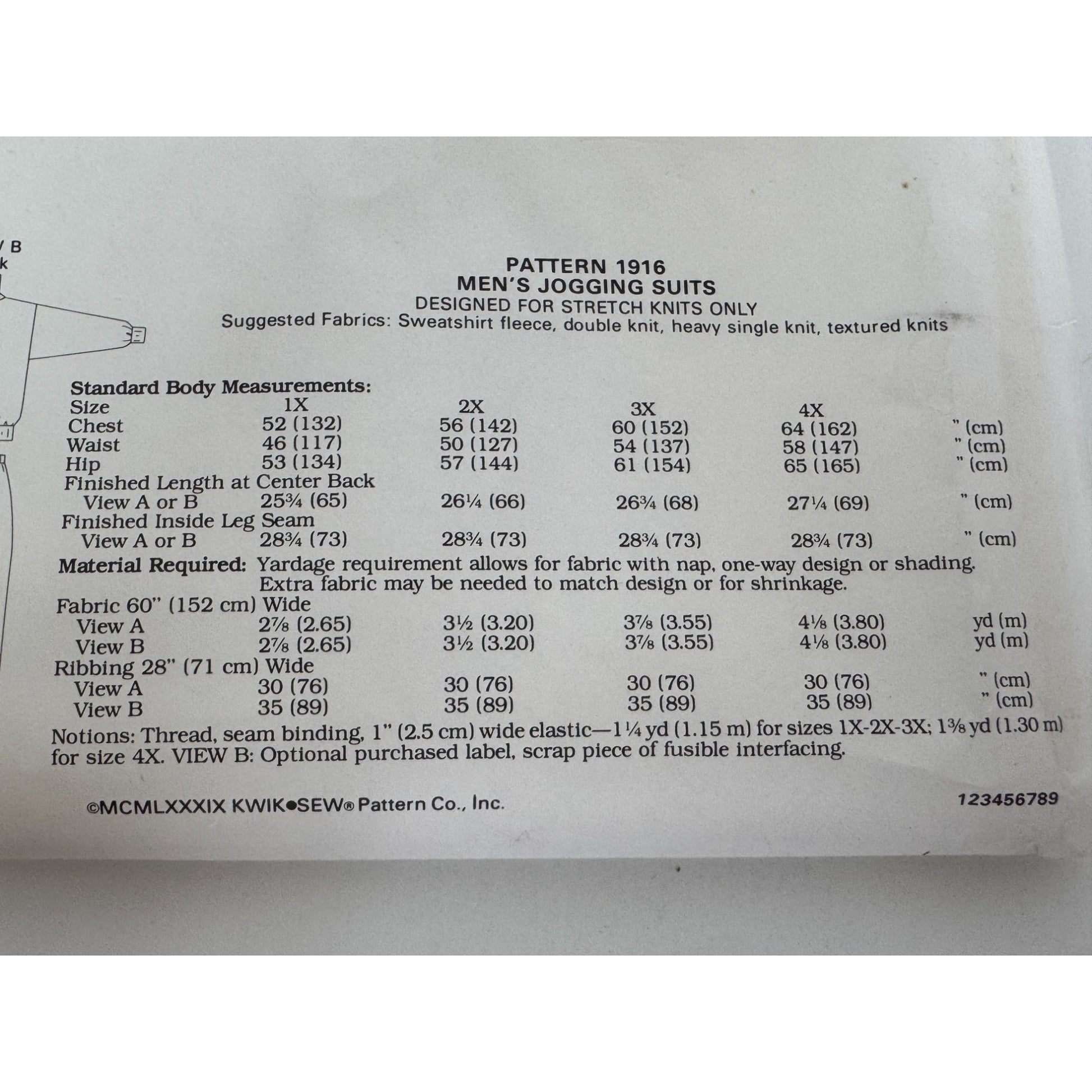 Kwik Sew Sewing Pattern 1916 Mens Sweatsuit Jogging Suits Athletic Shirt 1X-4X