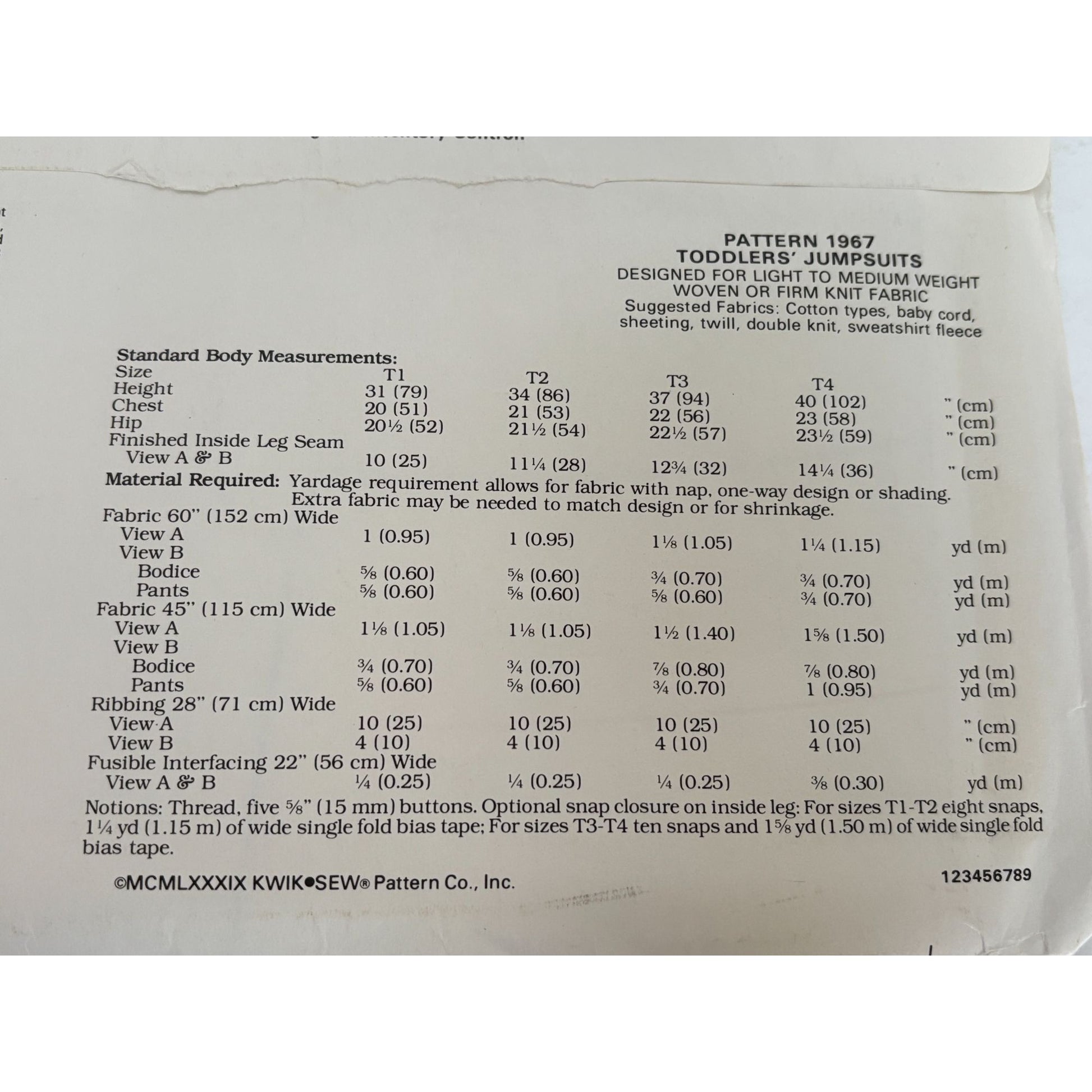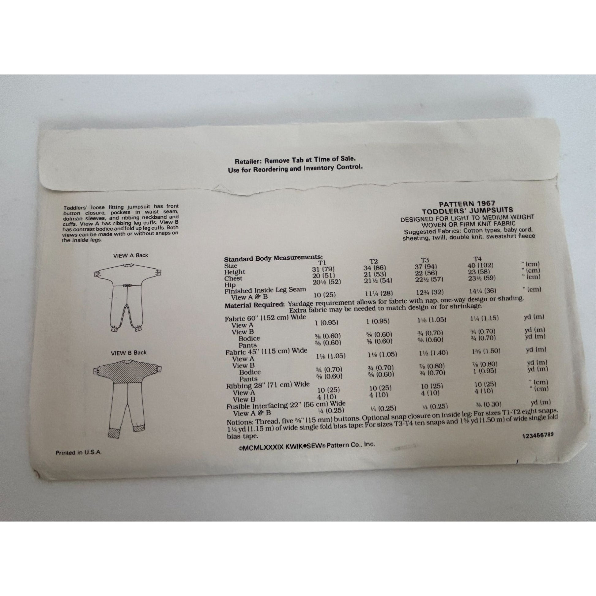 Kwik Sew Sewing Pattern 1967 Toddlers Jumpsuit Easy Dolman Sleeves 2T 3T 4T UC