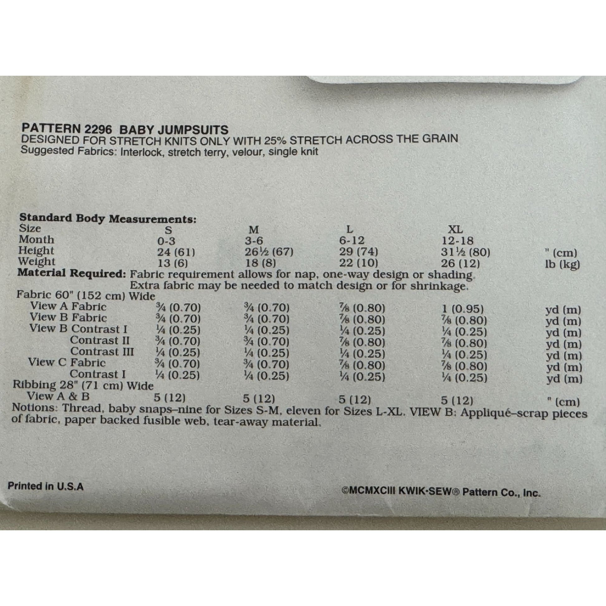 Kwik Sew Sewing Pattern 2296 Baby Jumpsuits Rompers Snaps Newborn to 18M Uncut