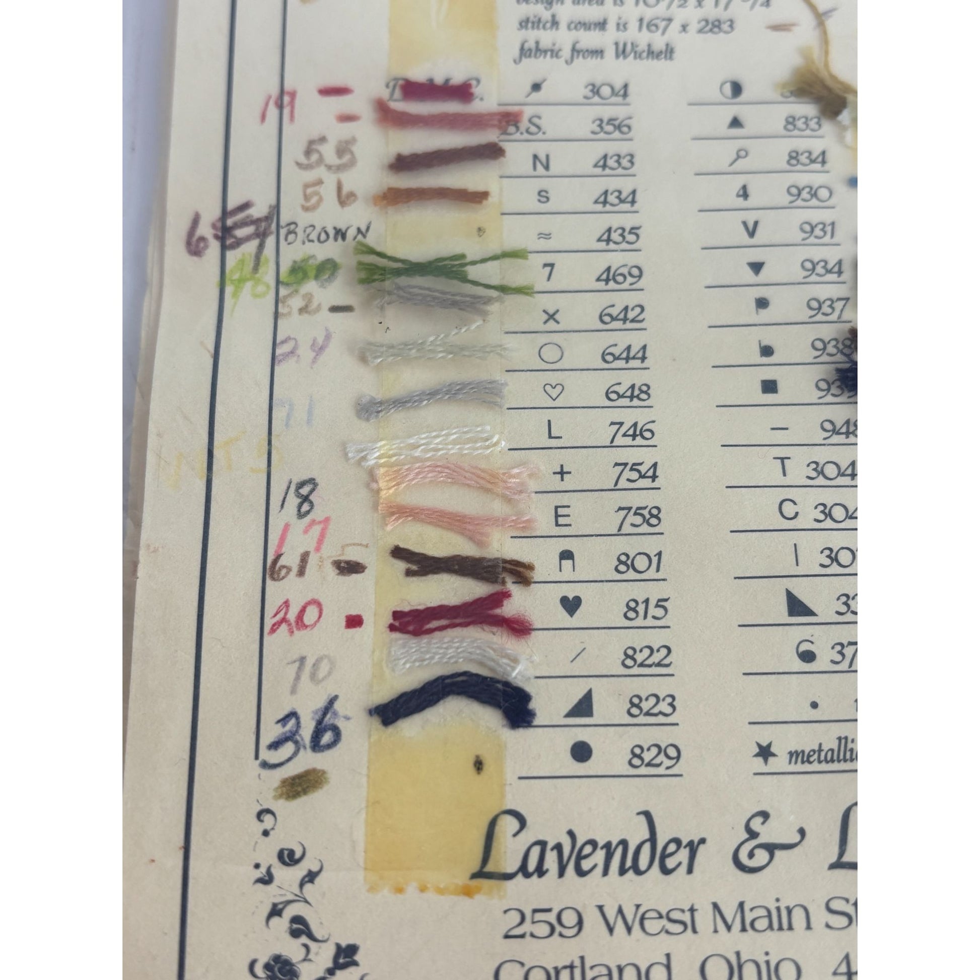 • Pattern has been used with open packaging. Light pencil markings on pattern. Embroidery floss samples next to embroidery floss key.