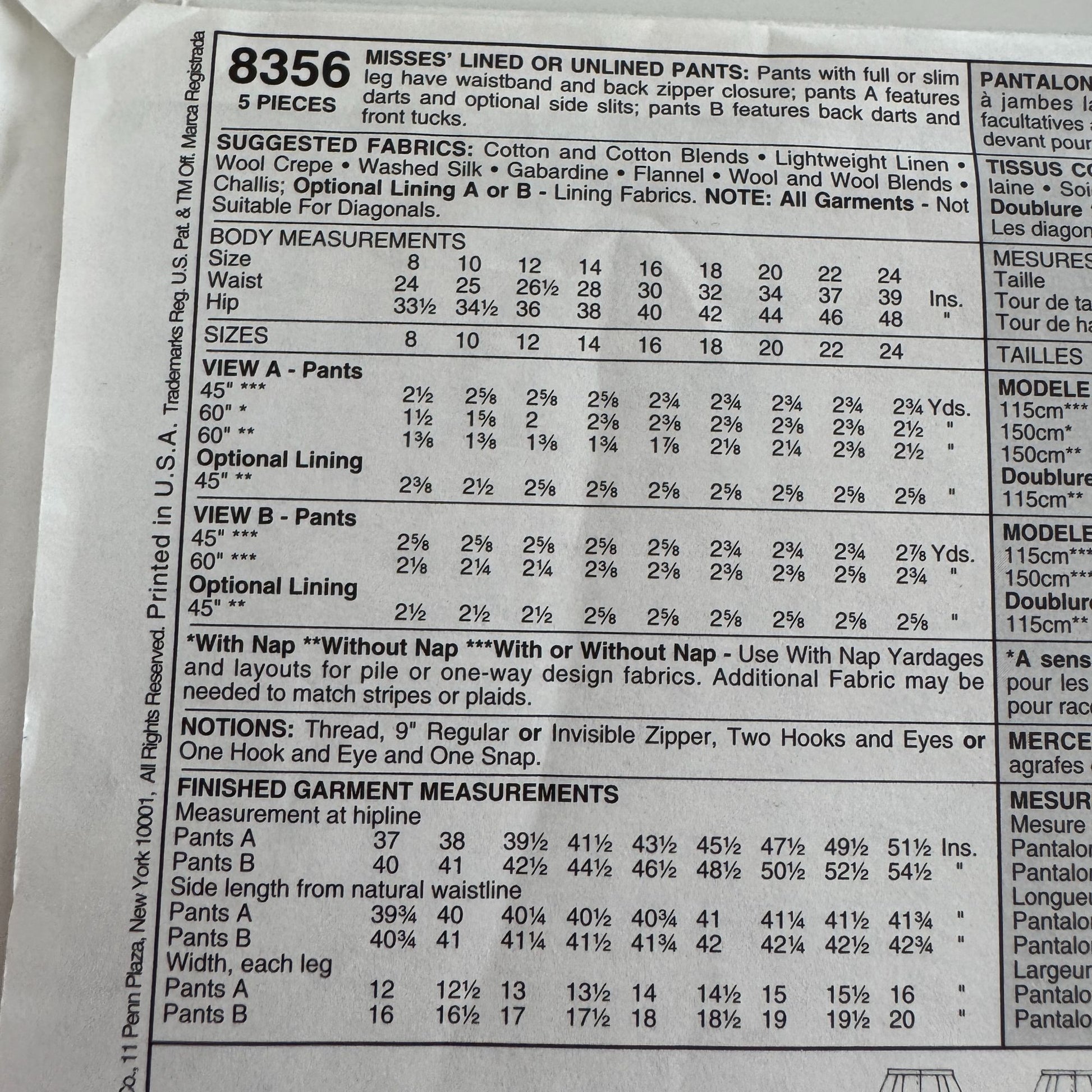 McCall's Sewing Pattern 8356: Palmer/ Pletsch - Misses' Lined or Unlined Pants