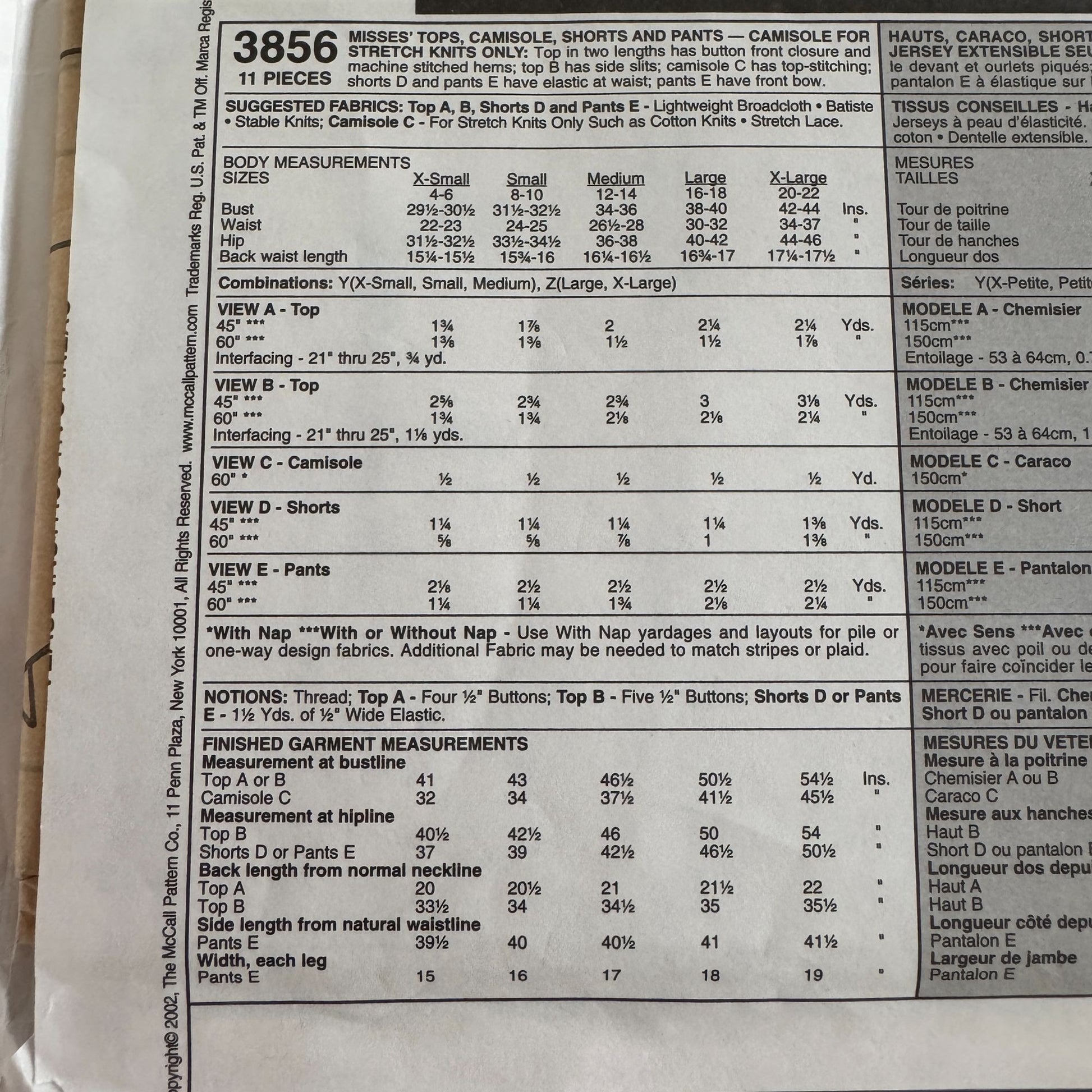 McCalls Sewing Pattern 3856 Pajamas Top Camisole Shorts Pants Easy L XL 16-22 UC