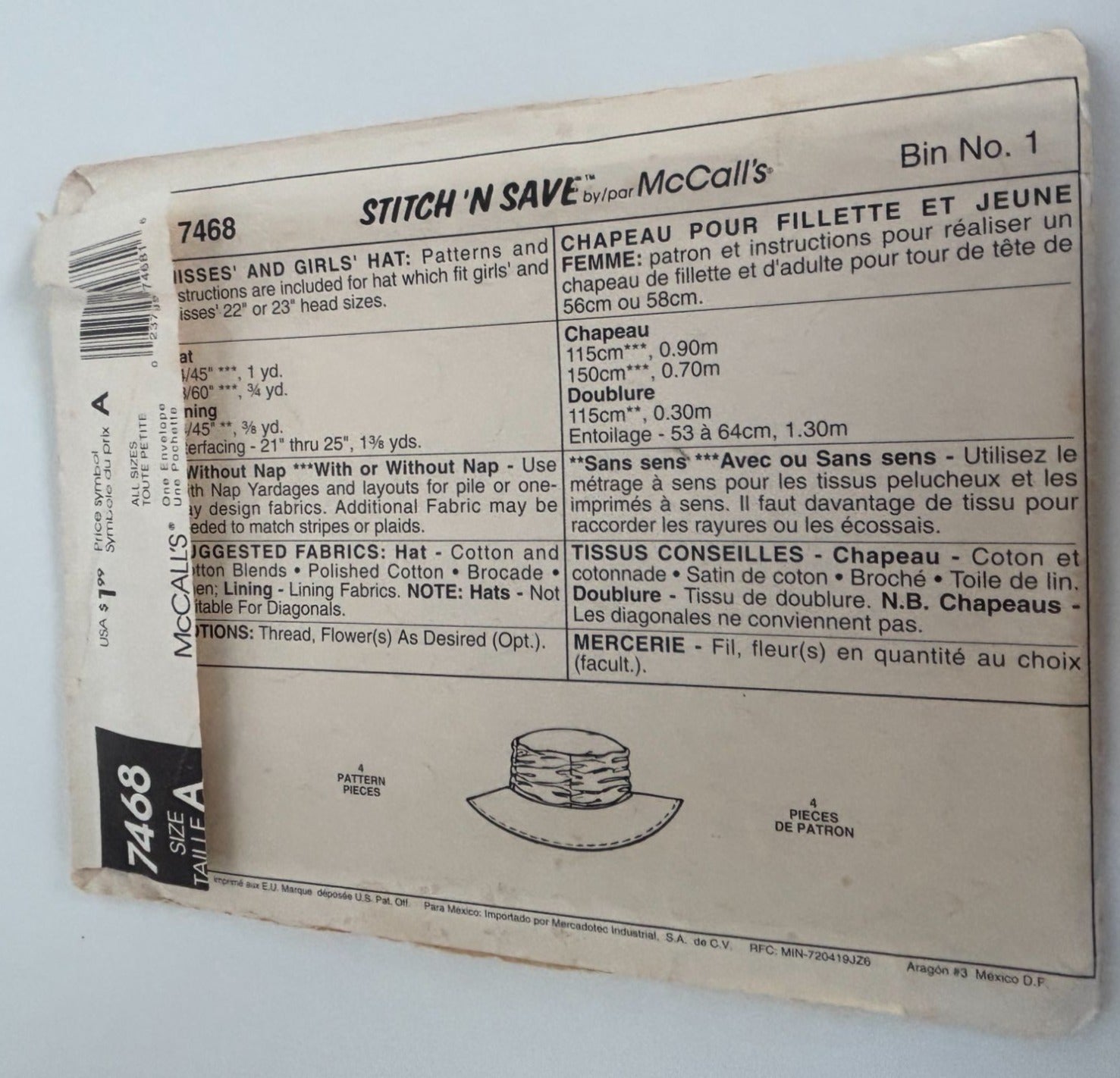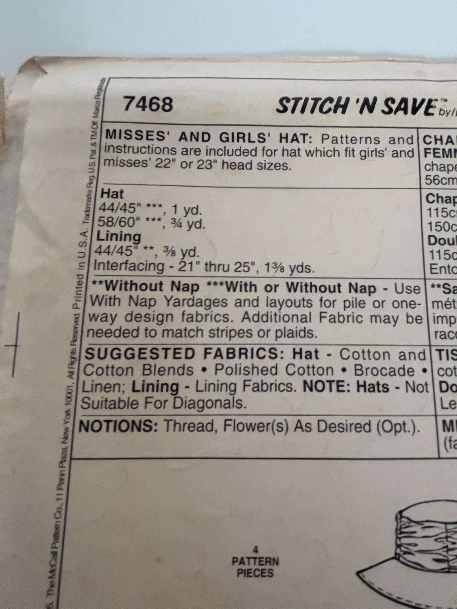 McCall's Sewing Pattern 7468:Misses' and Girls' Hat
