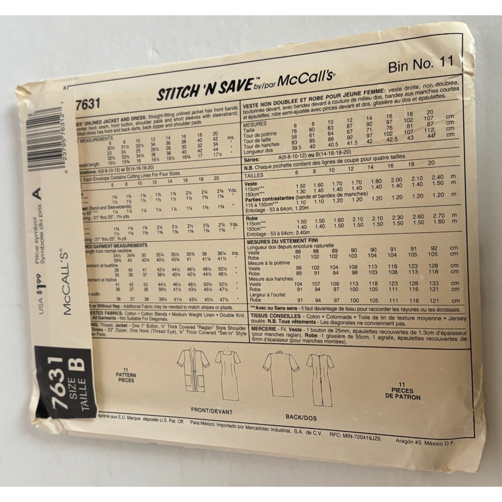 McCall's Sewing Pattern 7631: Unlined Straight Jacket and Dress