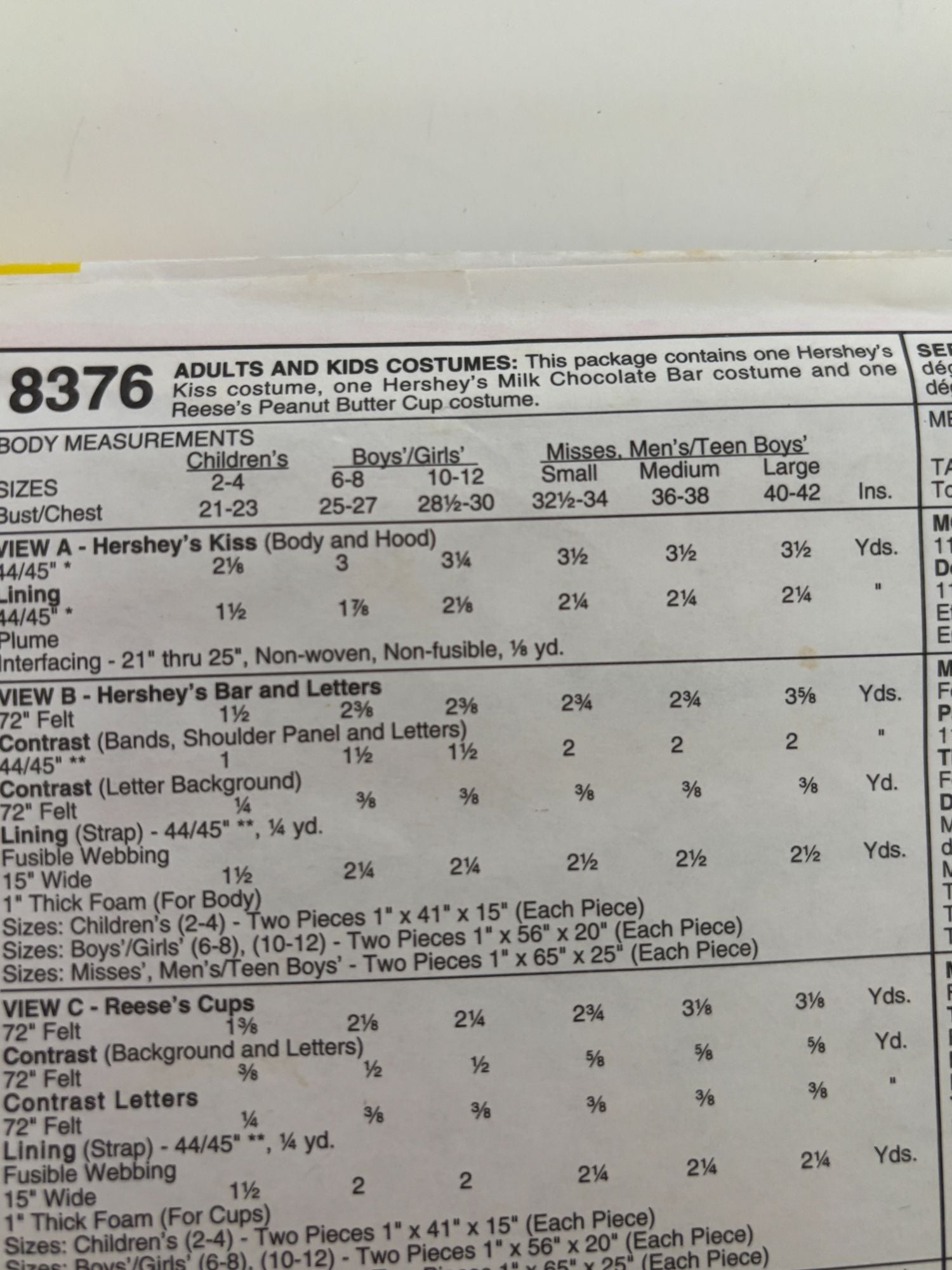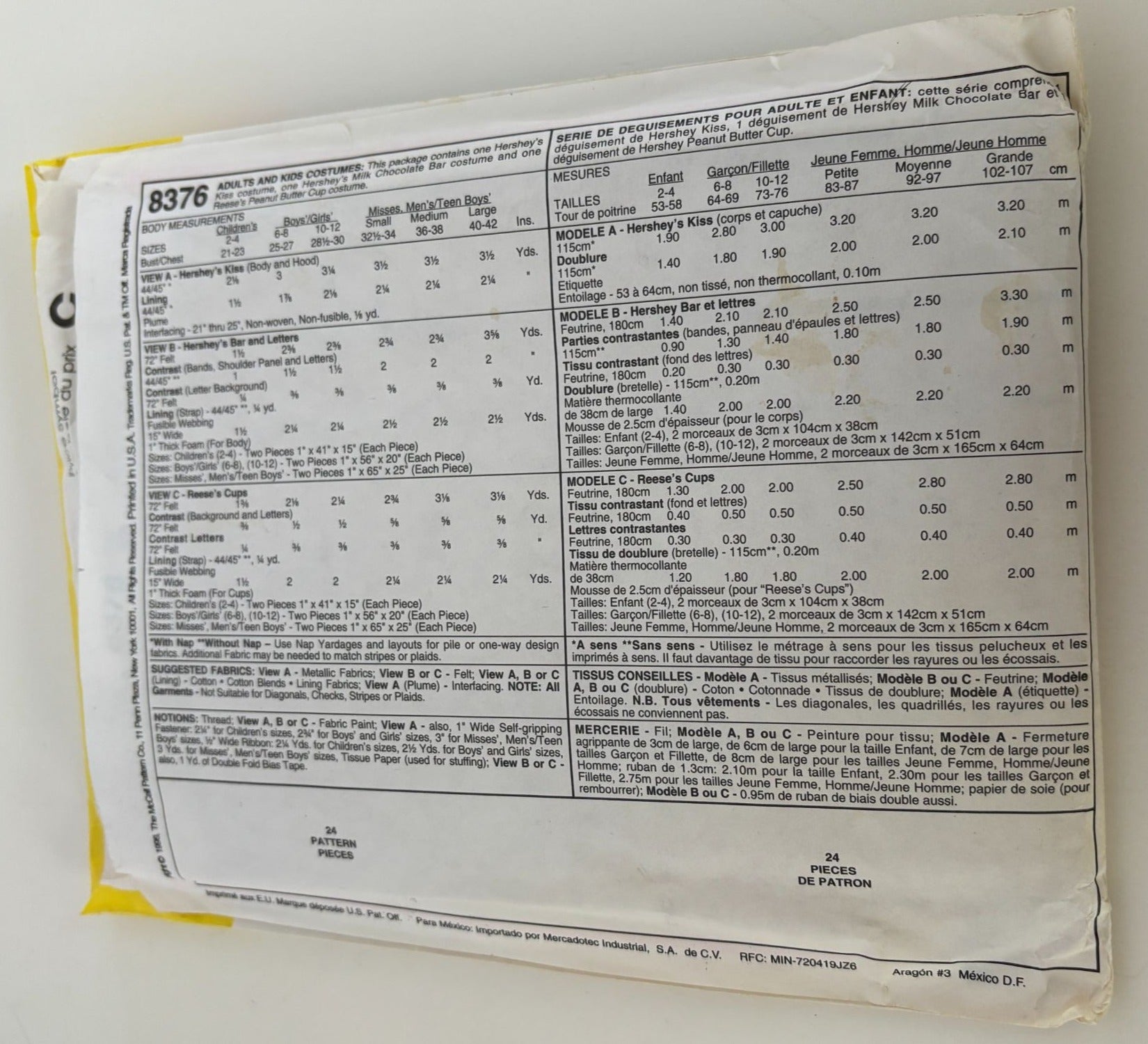 McCalls Sewing Pattern 8376 Halloween Candy Costume Hersheys Kiss Reeses Kid 6 8