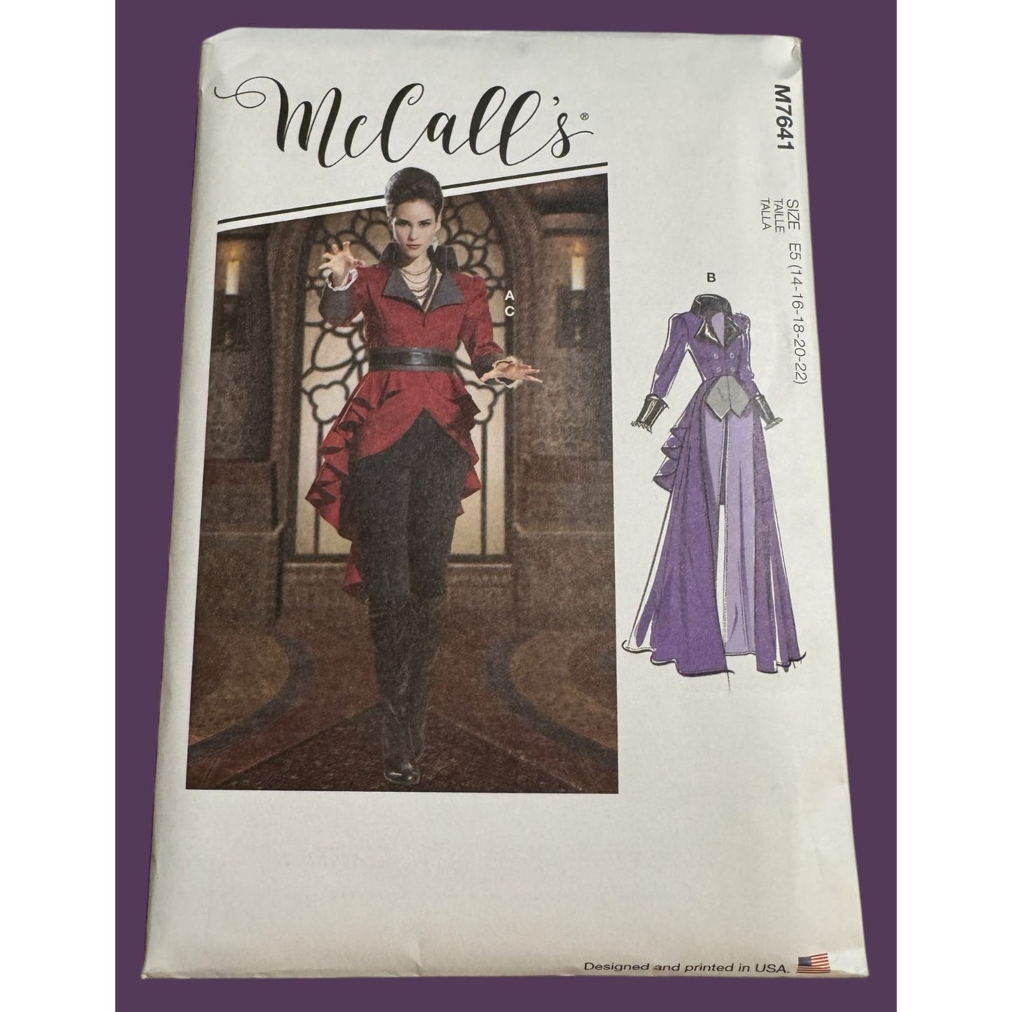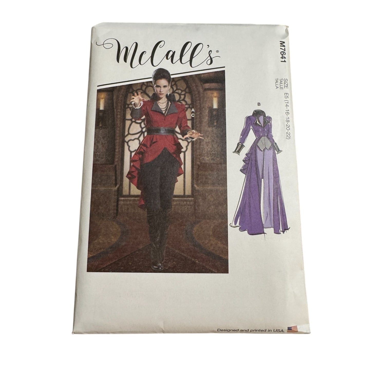 This versatile McCall's M7641 sewing pattern offers a striking costume design with detailed instructions. The pattern includes partially lined, fitted, zip-front jackets and coats with dramatic overskirts and elegant detailing. It’s ideal for creating unique costumes for themed events or theater productions.