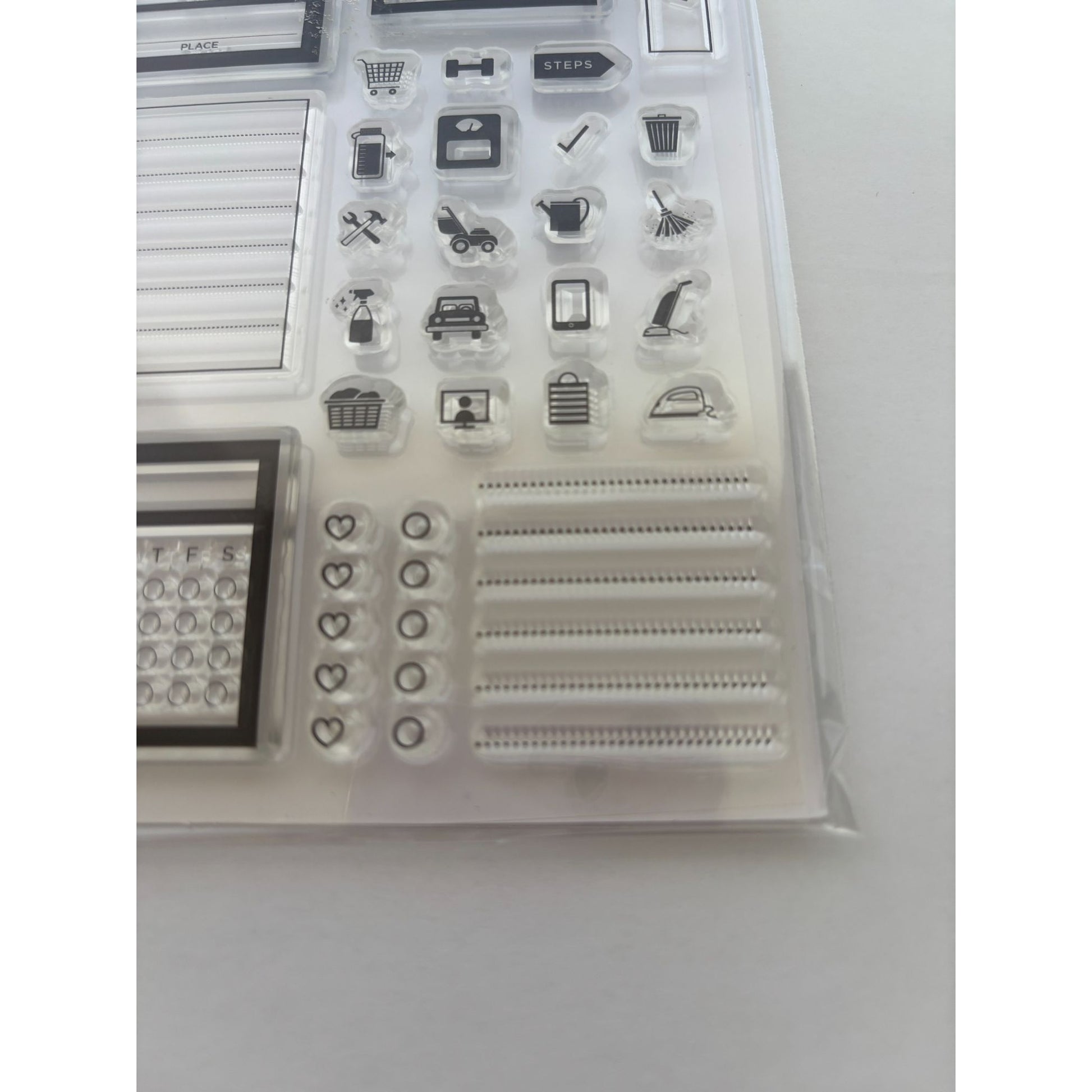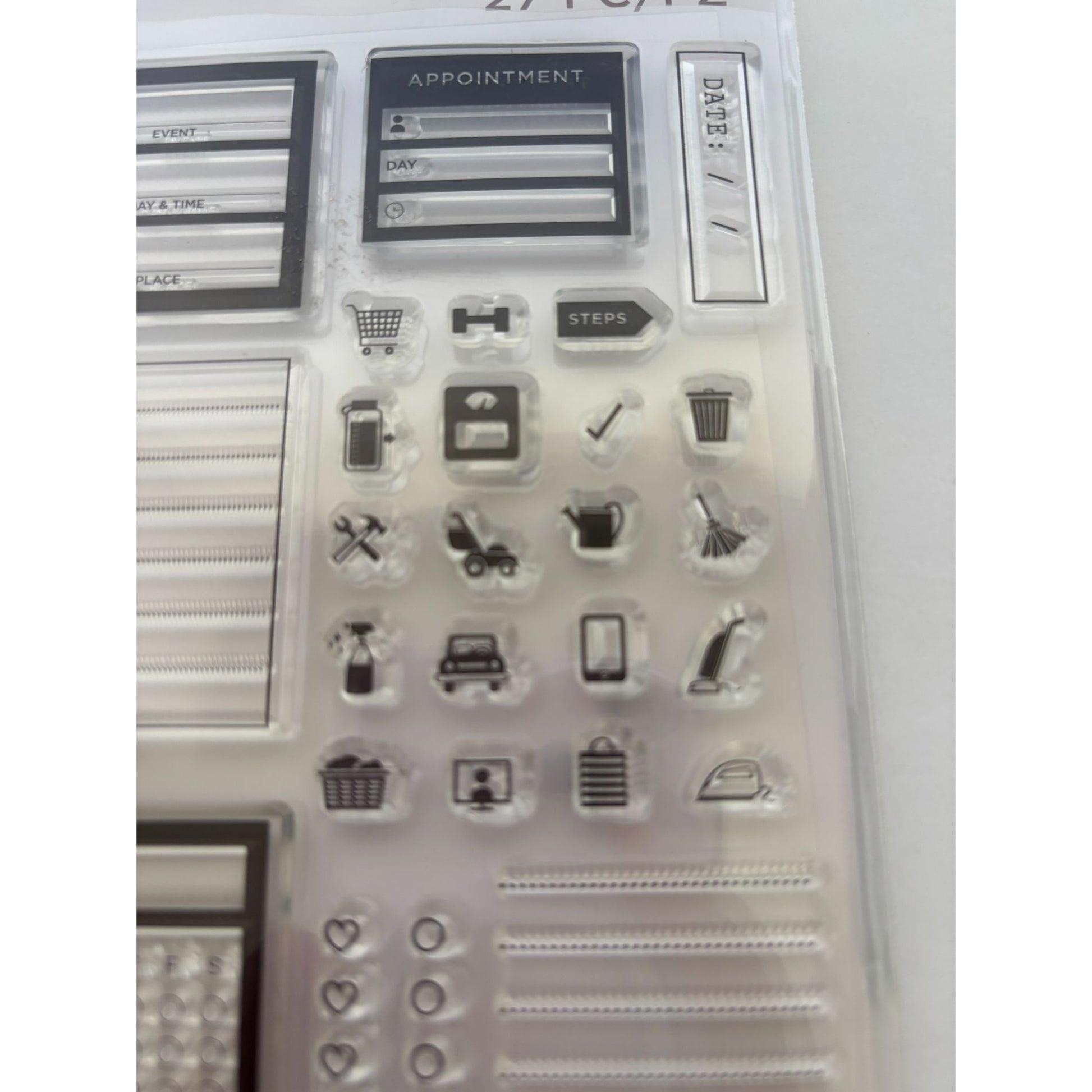 Organize schedules effortlessly with this 27-piece clear stamp set for planners and calendars. Includes icons, labels, and customizable date stamps.