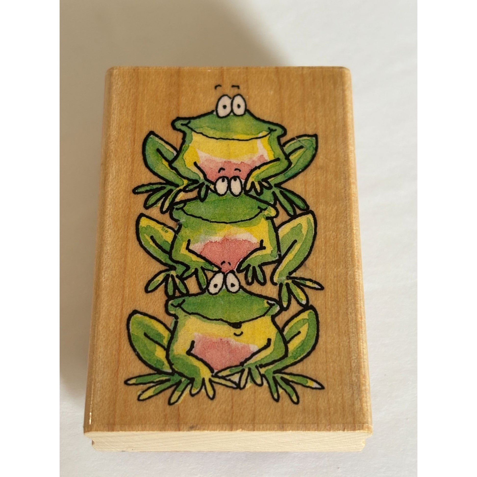 • Features a stack of adorable frogs