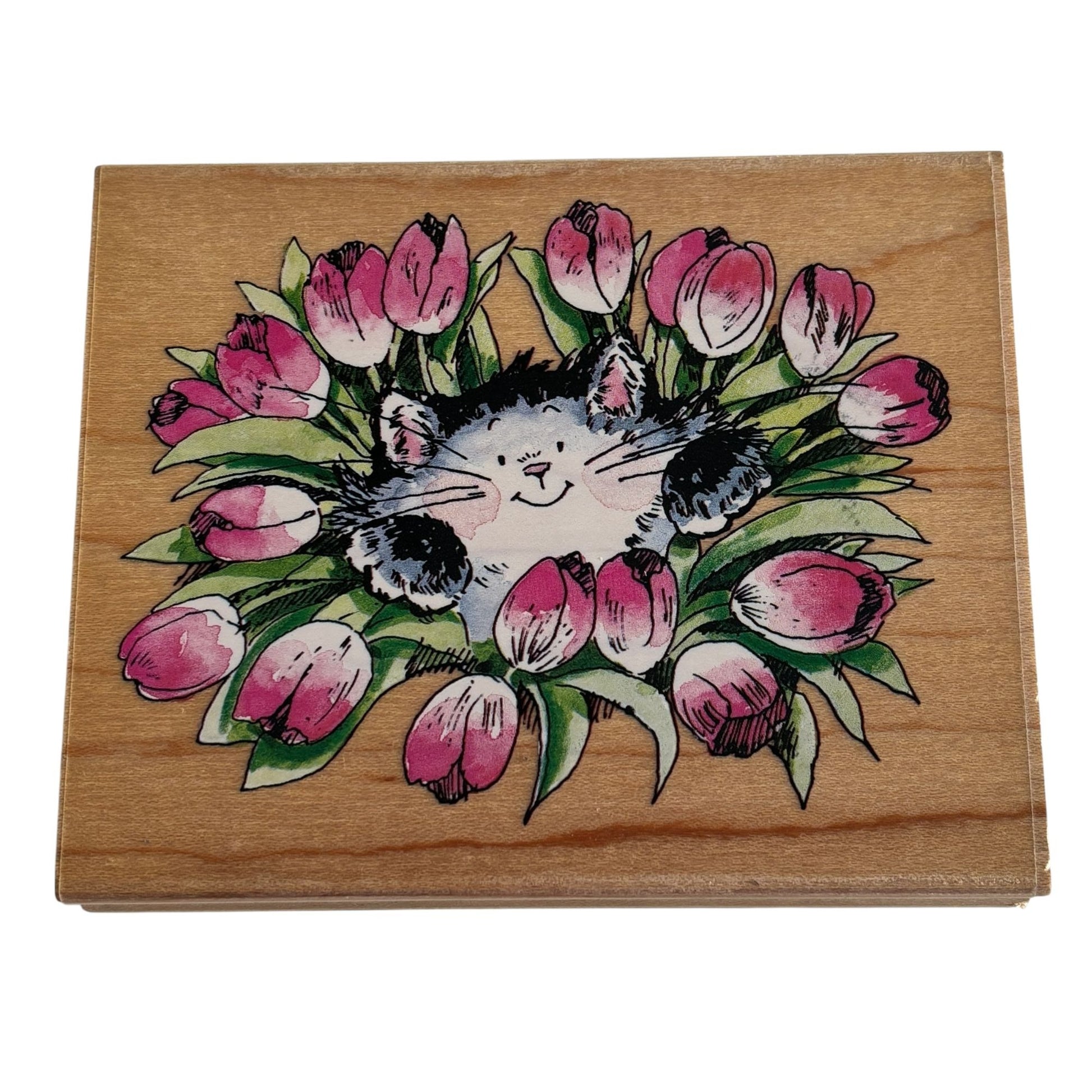 This rubber stamp is the cat's meow! It features a feline peeking through tulips.