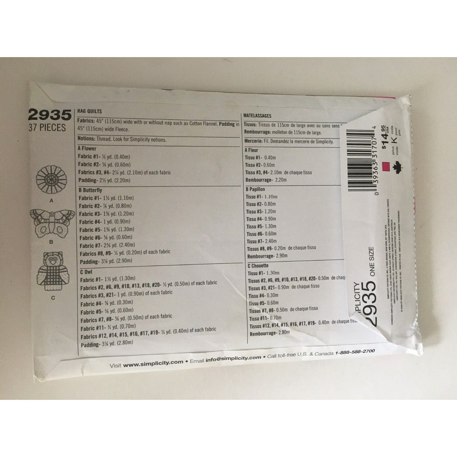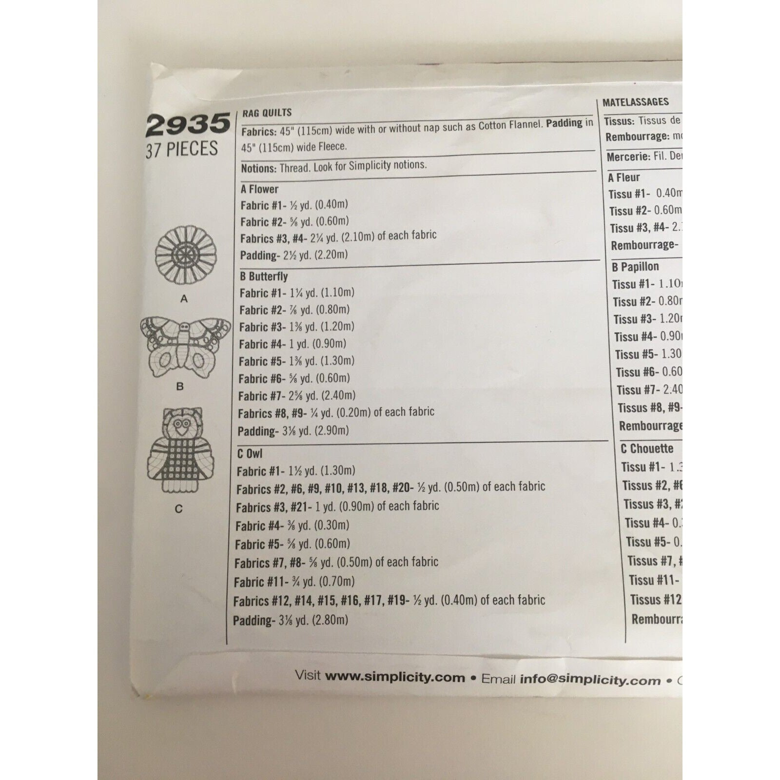 Simplicity Sewing Pattern 2935 Rag Quilts Flower Butterfly Owl Home Decor Uncut