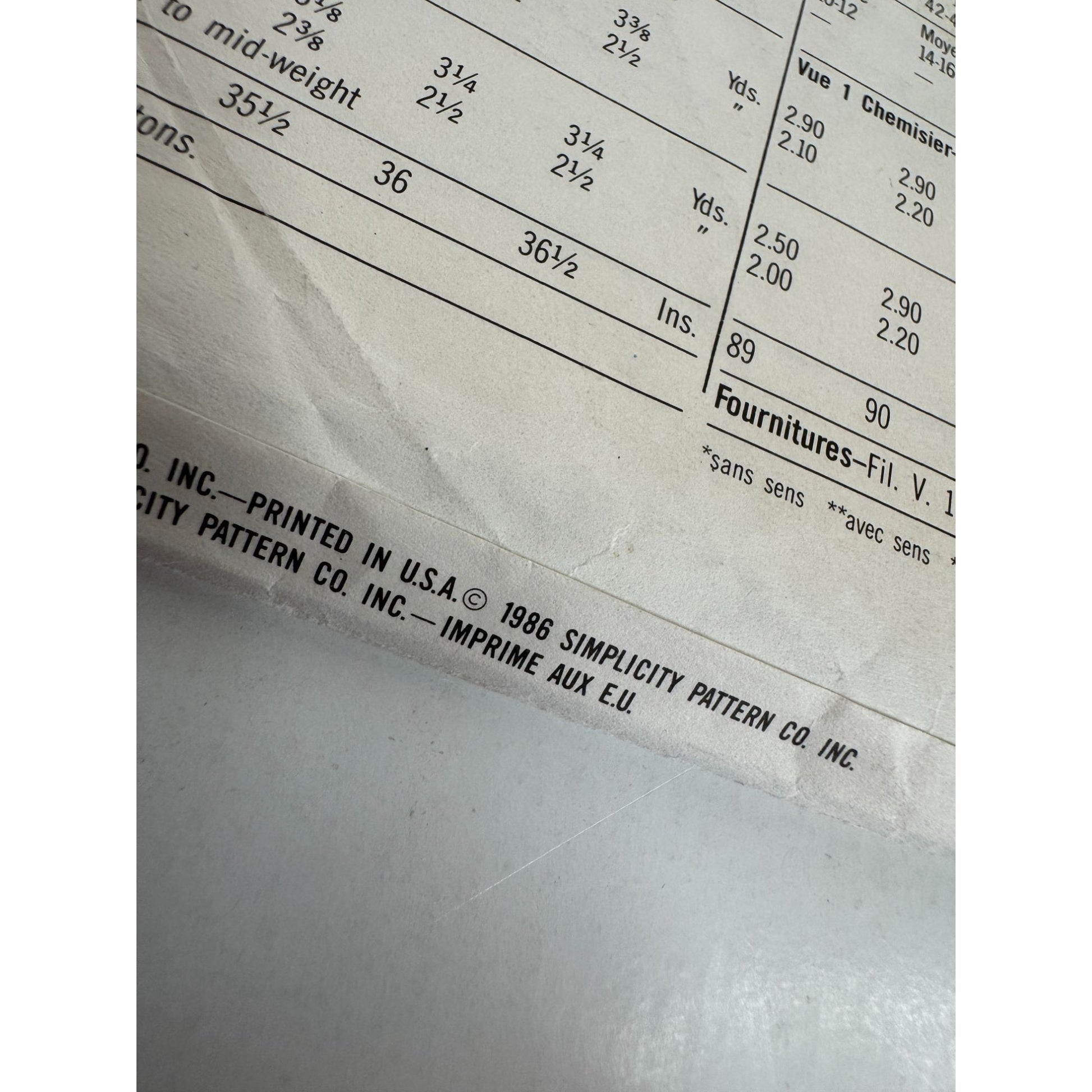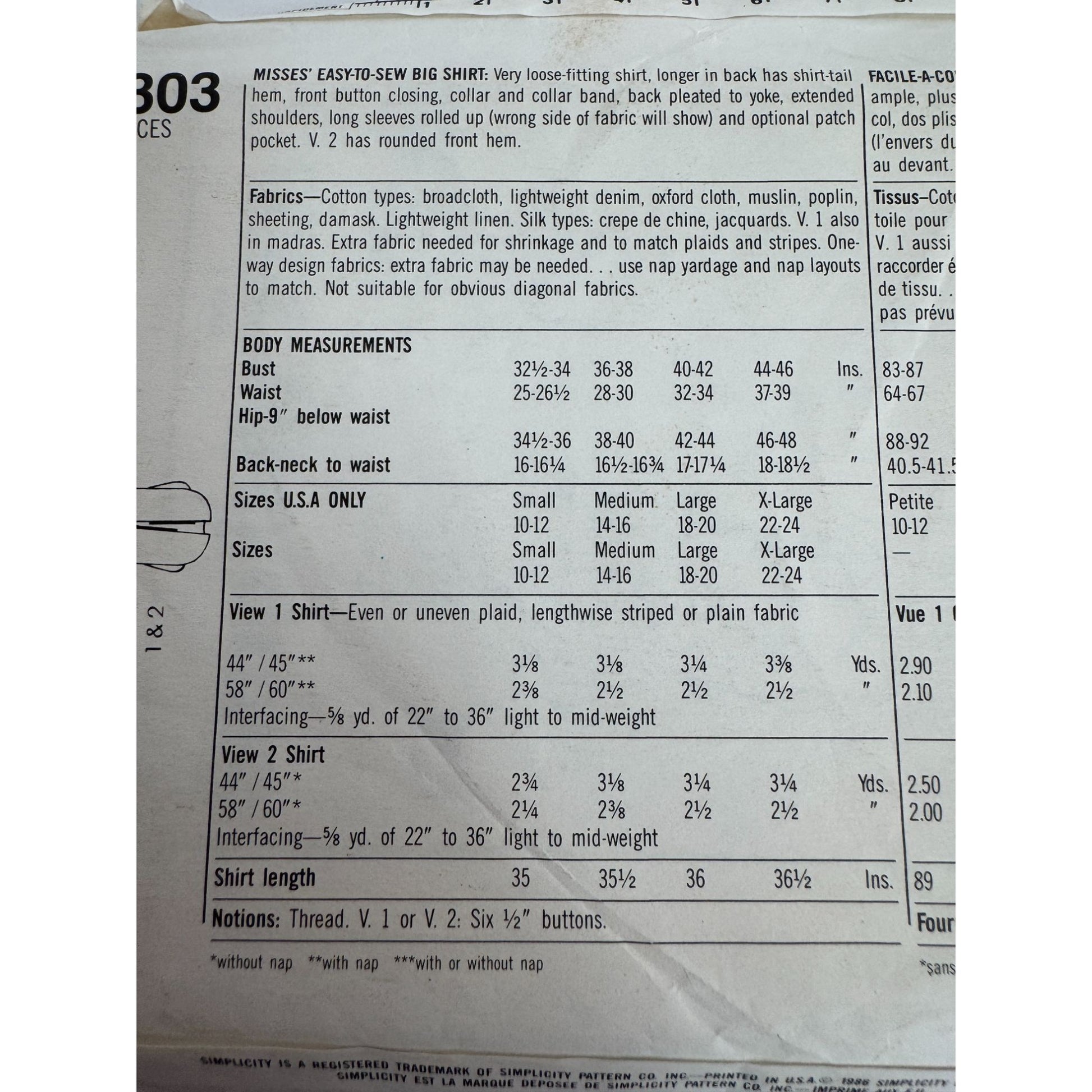 Simplicity Sewing Pattern 7303 Oversized Front Button Shirt Easy to Sew UC 1980s