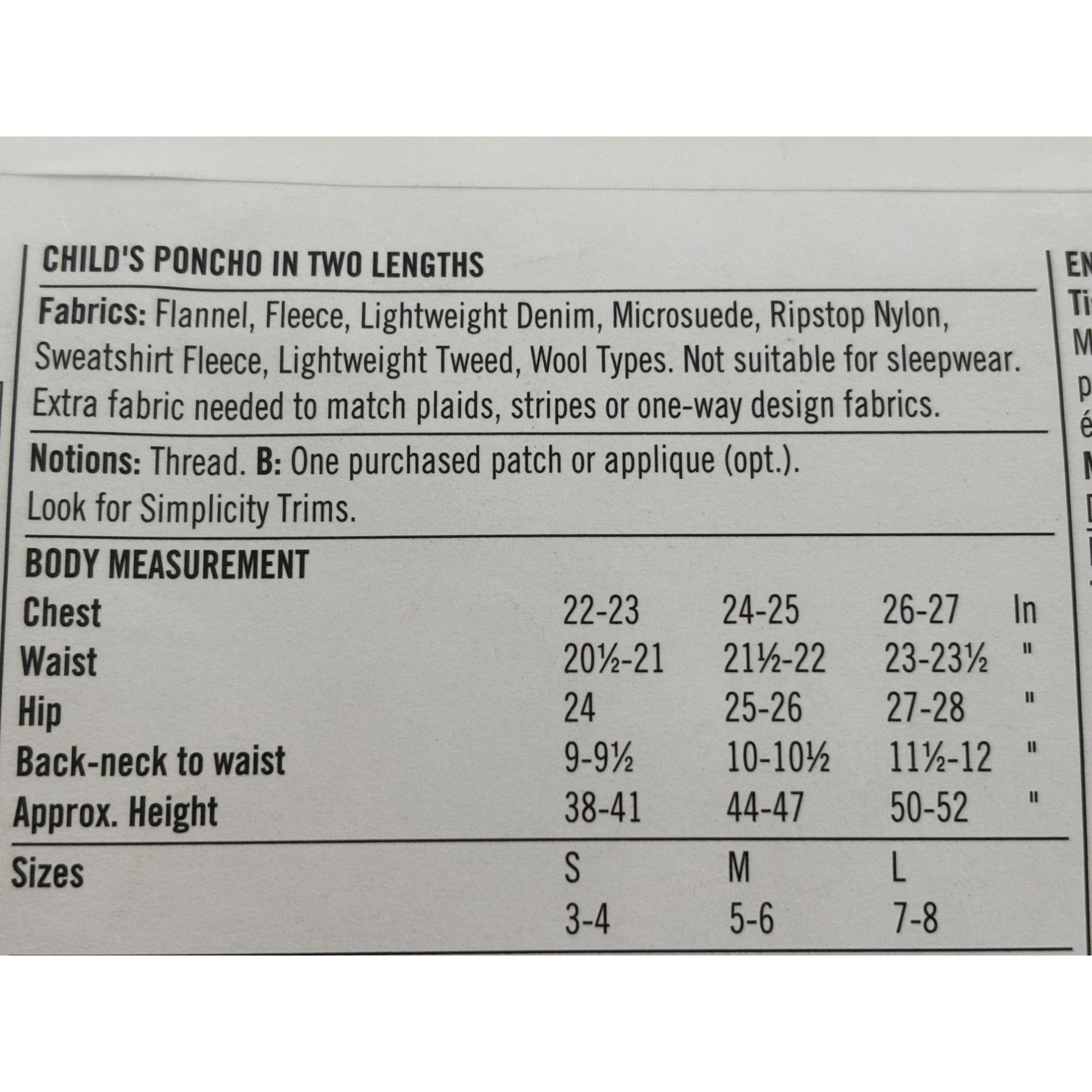 Simplicity Sewing Pattern 8428 Child Poncho S M L Easy Outerwear Fall Flannel UC