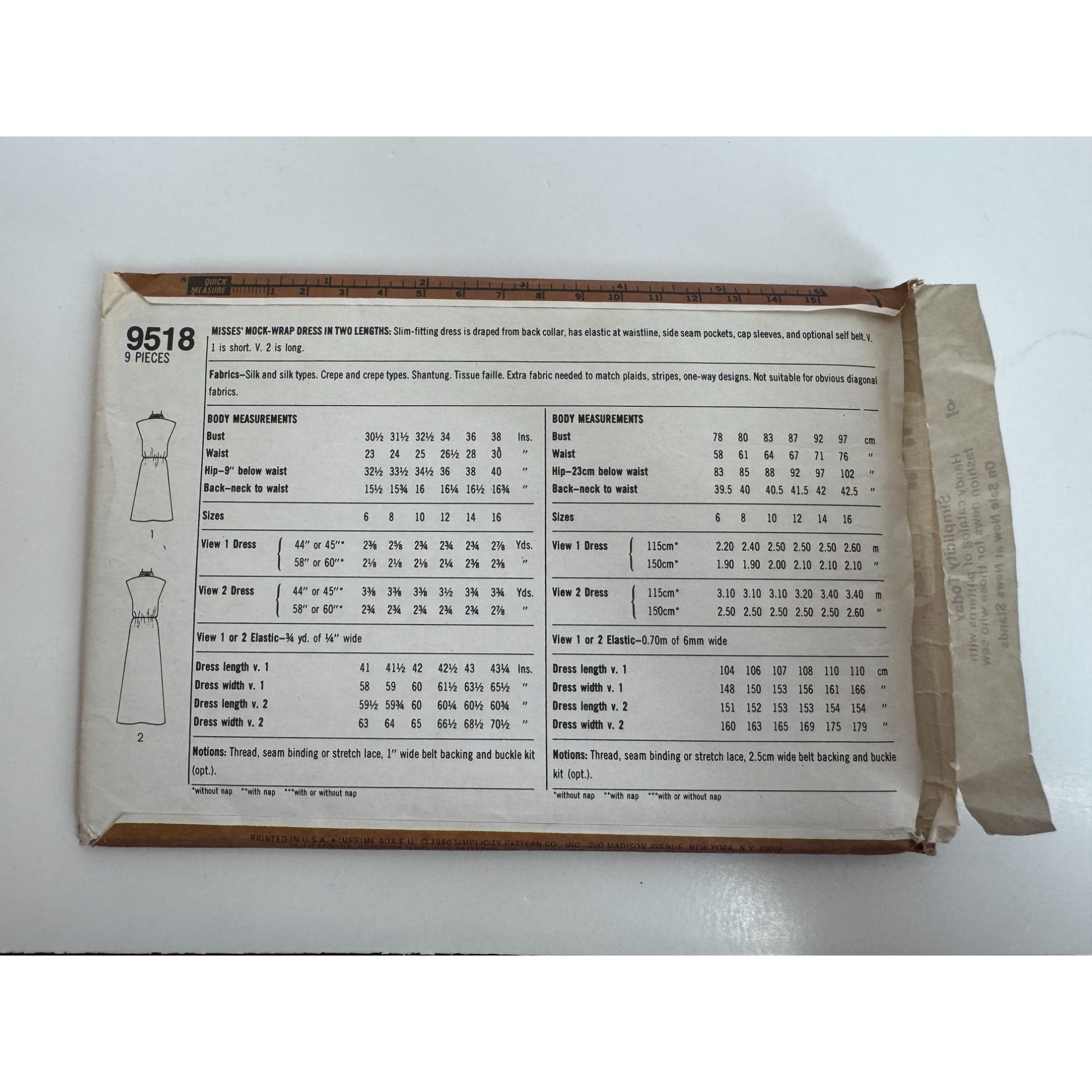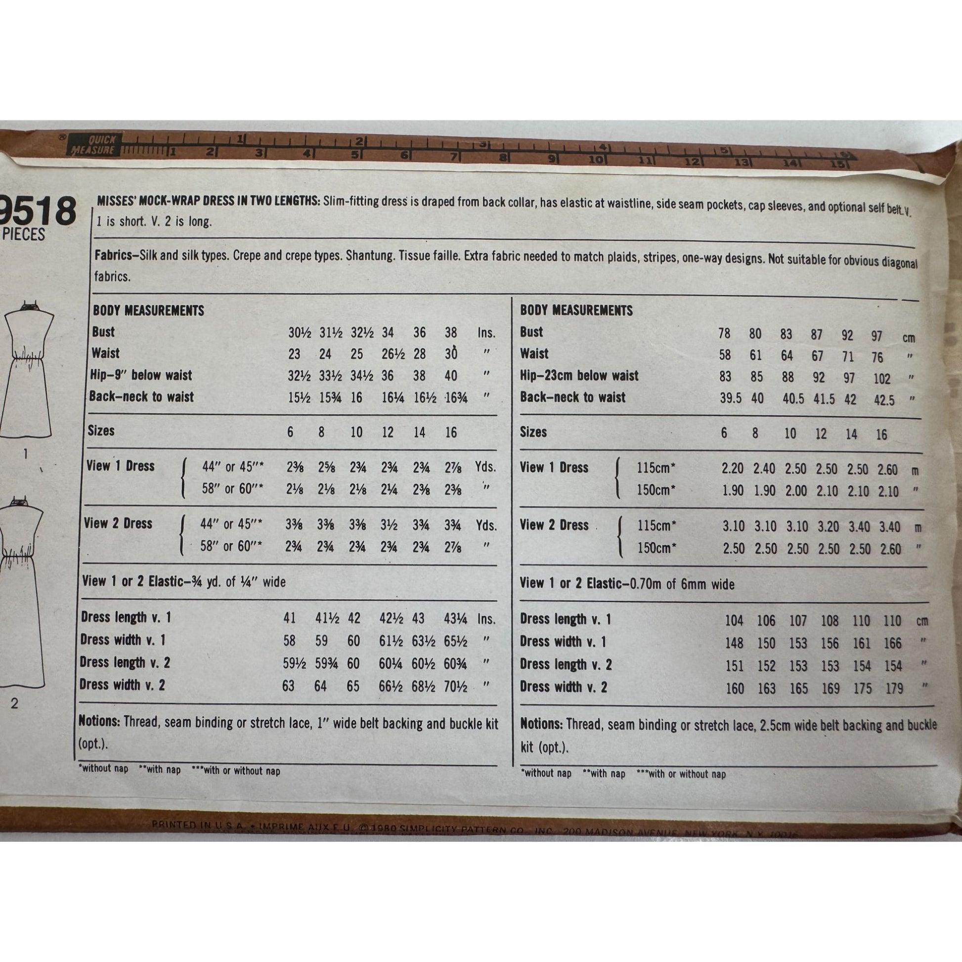Simplicity Sewing Pattern 9518 Mock-Wrap Dress Vintage 1980 Pockets Size 12 UC