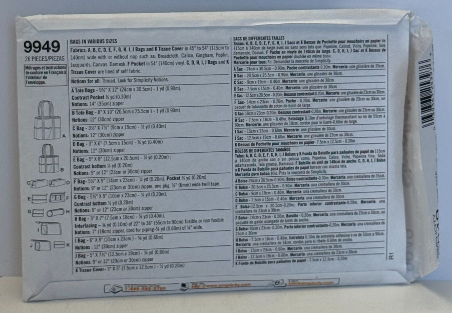 Simplicity Sewing Pattern 9949 Crafts Tote Bag Cosmetic Bags Travel Vacation UC