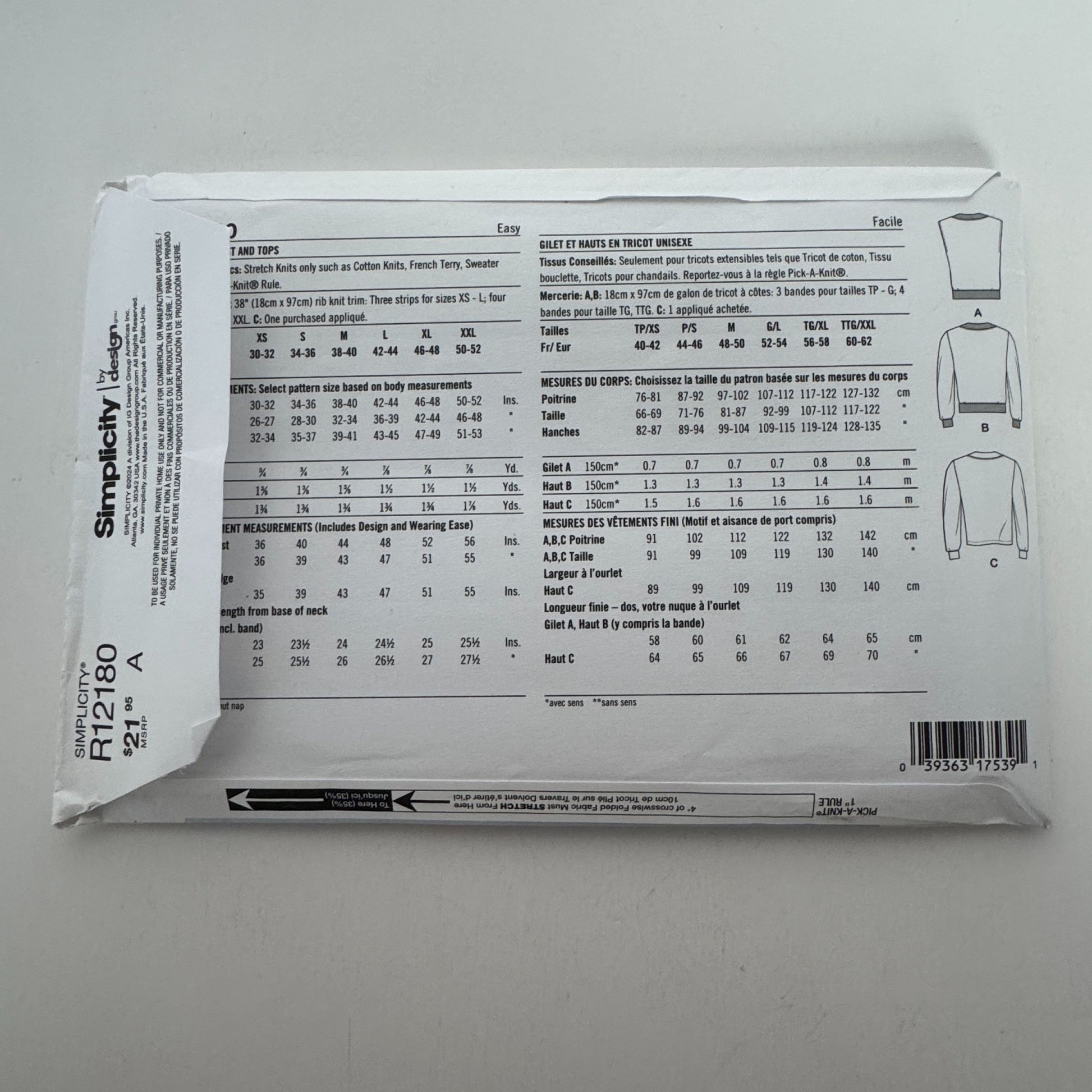 Simplicity Sewing Pattern R12180 Knit Vest and Tops Fall Easy Unisex XS-XXL UC
