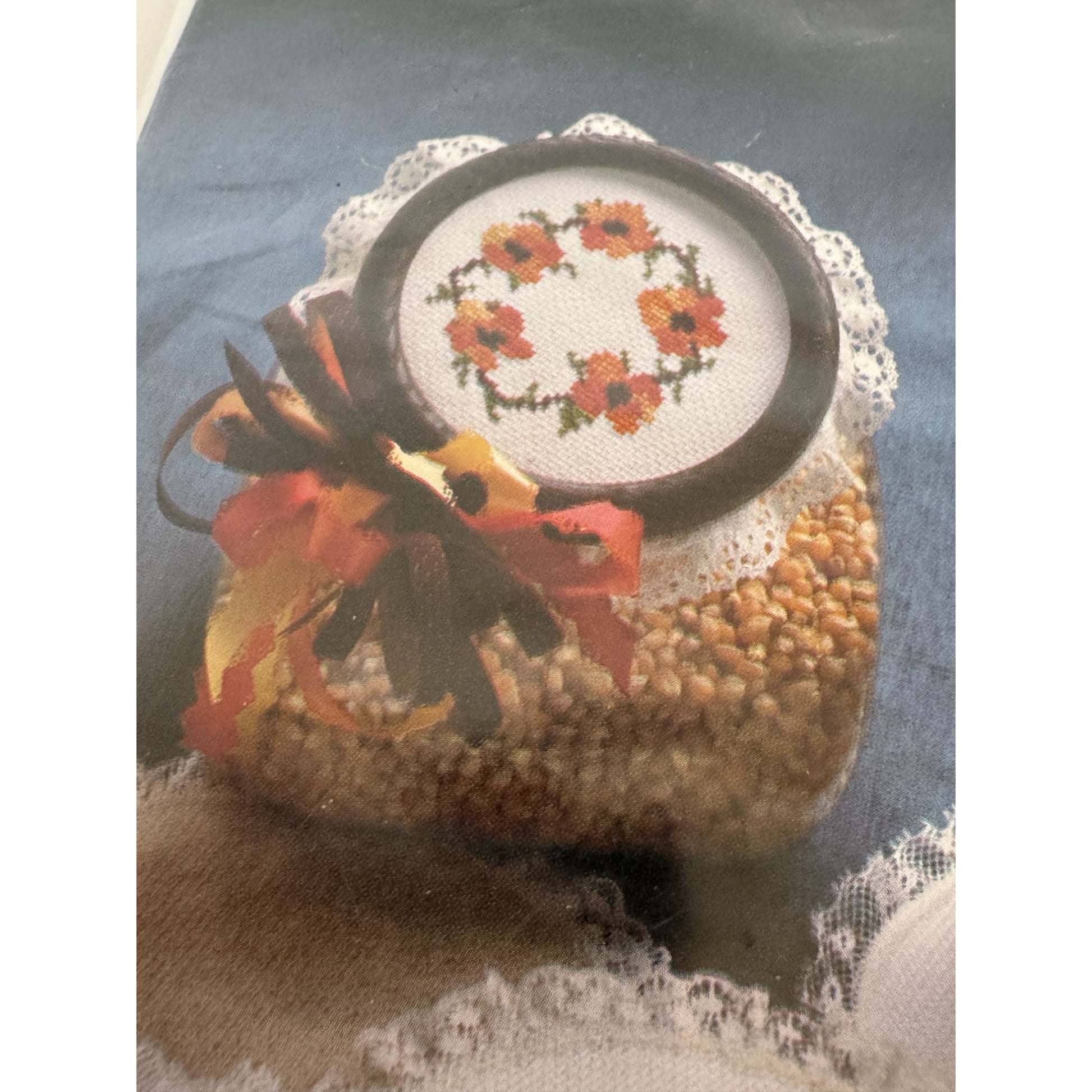 Create charming jar toppers with this cross-stitch pattern and lace-trimmed fabric.