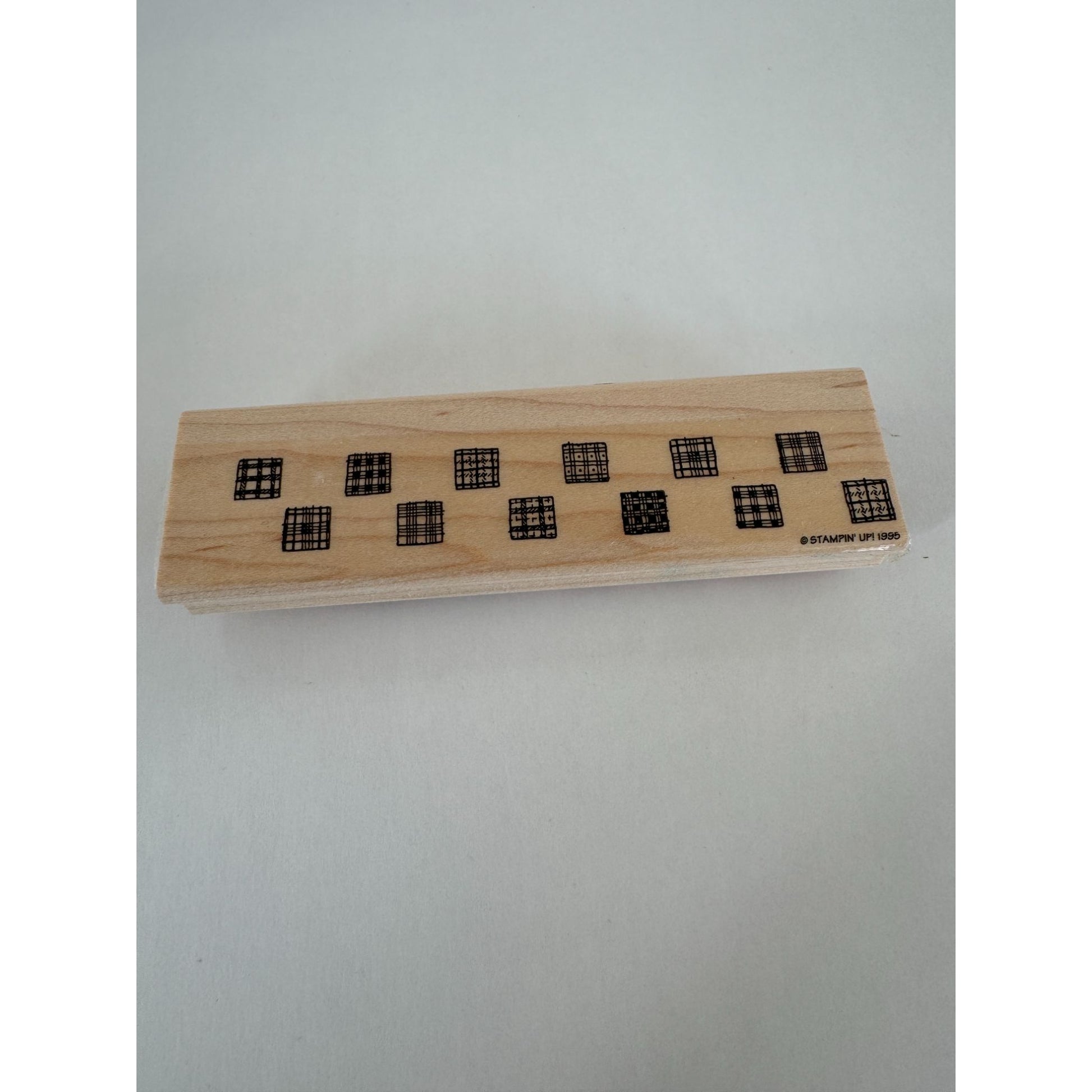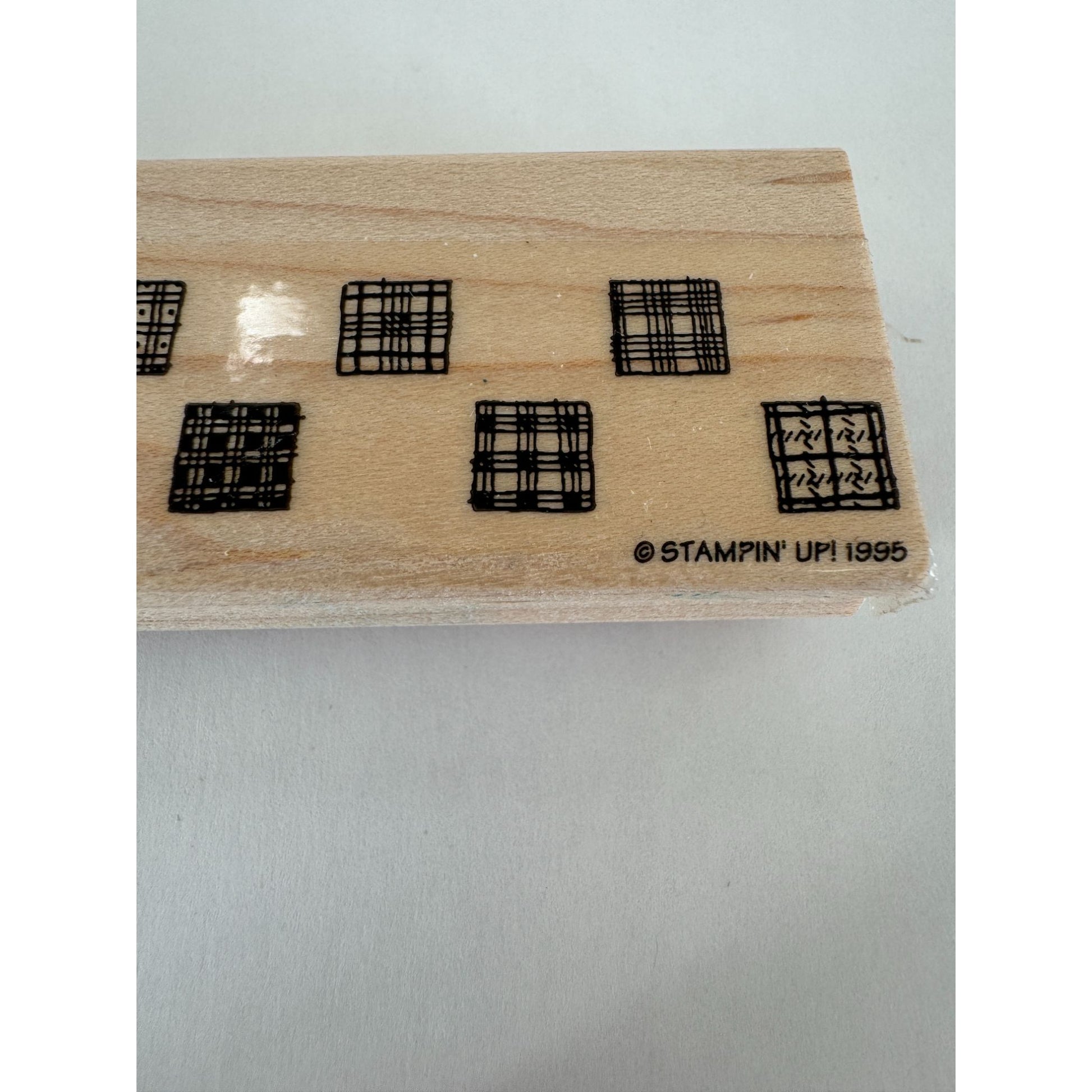 This wooden rubber stamp features a plaid quilting square border design, crafted by Stampin' Up! Ideal for scrapbooking, card making, or other creative projects.