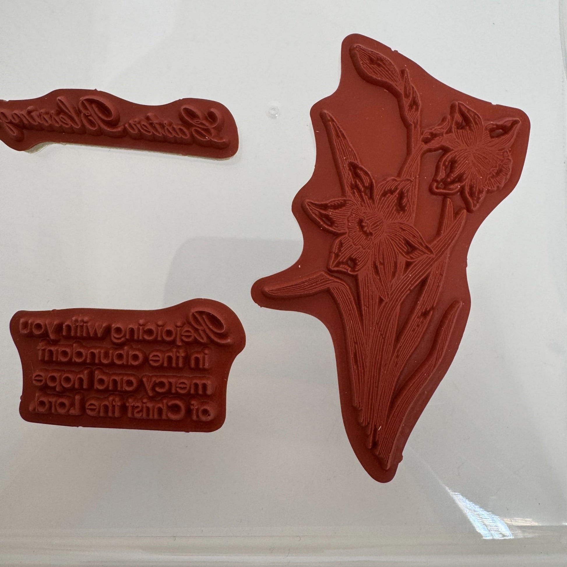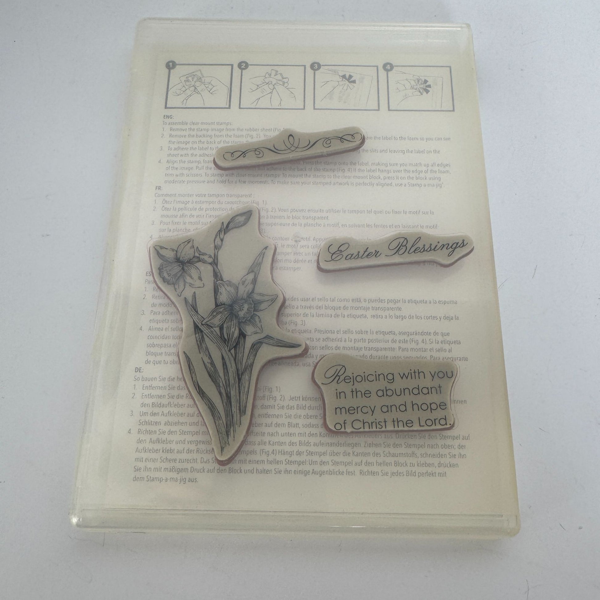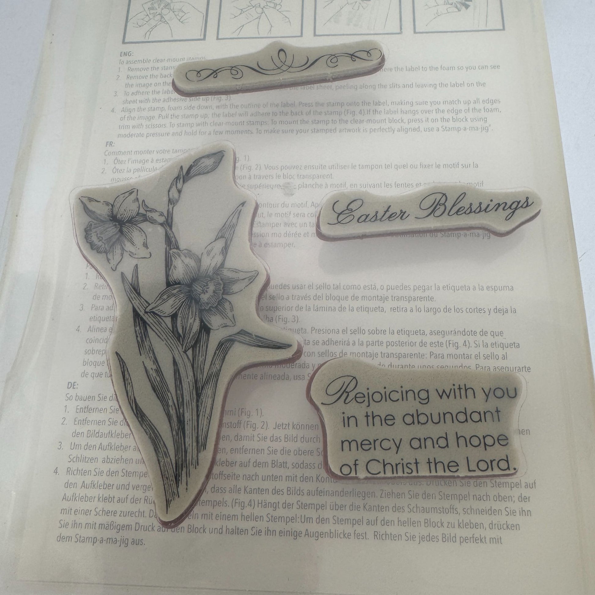 • Set Of 4 Unmounted Rubber Stamps: Easter Blessings, Rejoicing with you in the abundant mercy and hope of Christ the Lord, Easter lilies and decorative edge motif