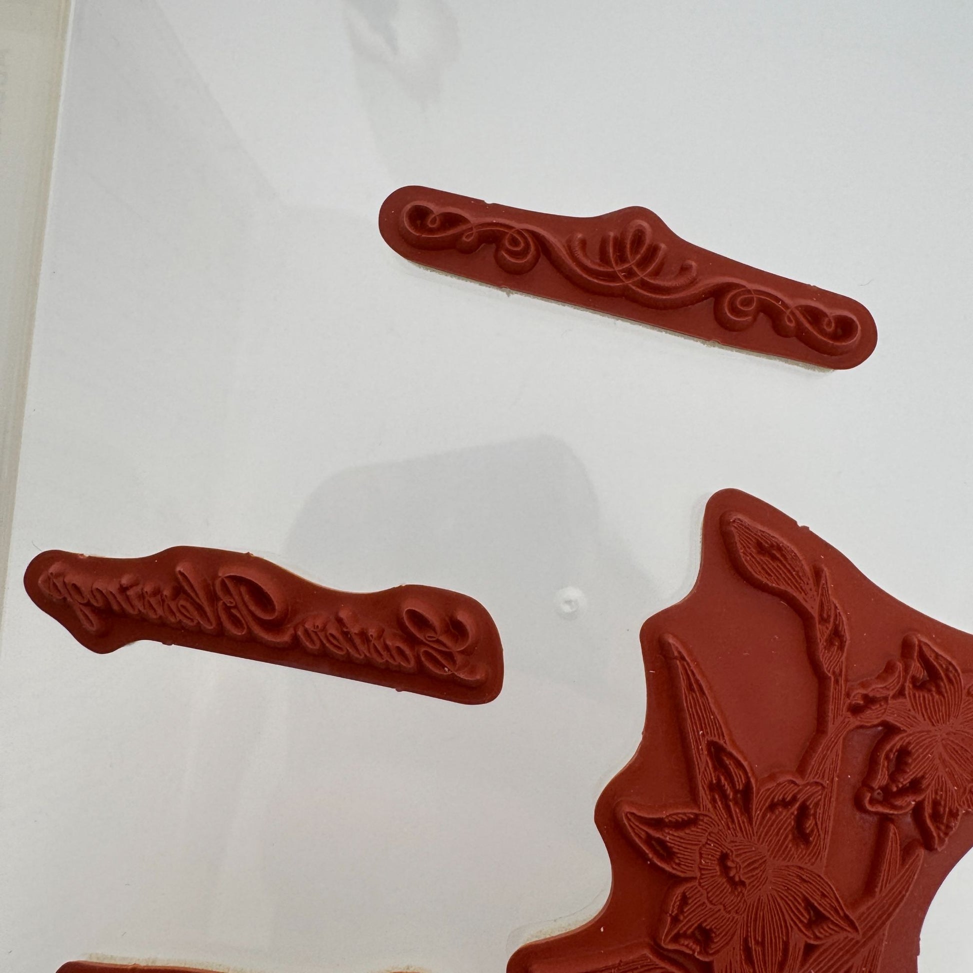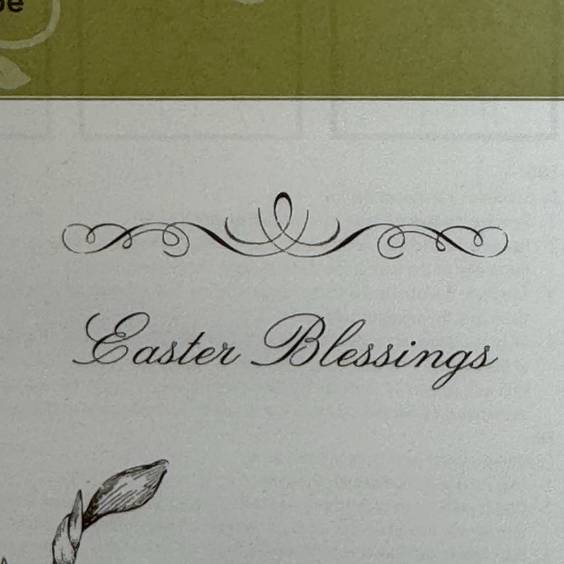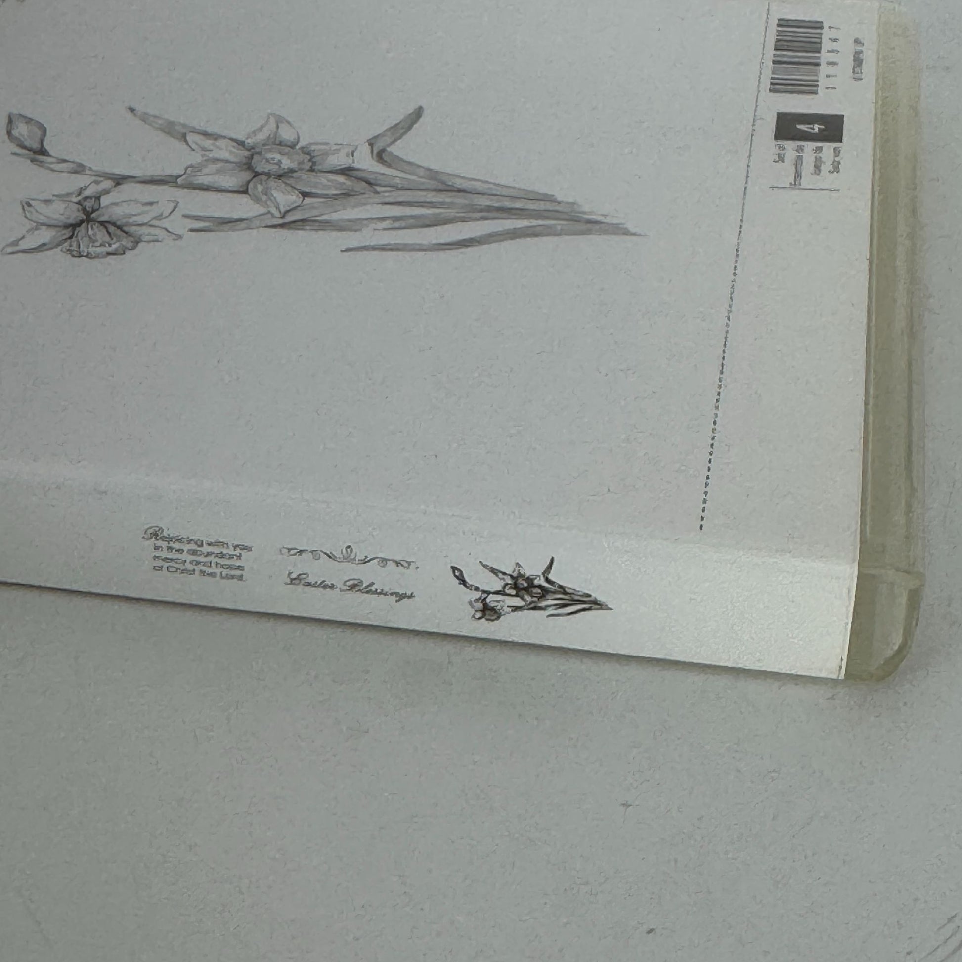 • Set Of 4 Unmounted Rubber Stamps: Easter Blessings, Rejoicing with you in the abundant mercy and hope of Christ the Lord, Easter lilies and decorative edge motif