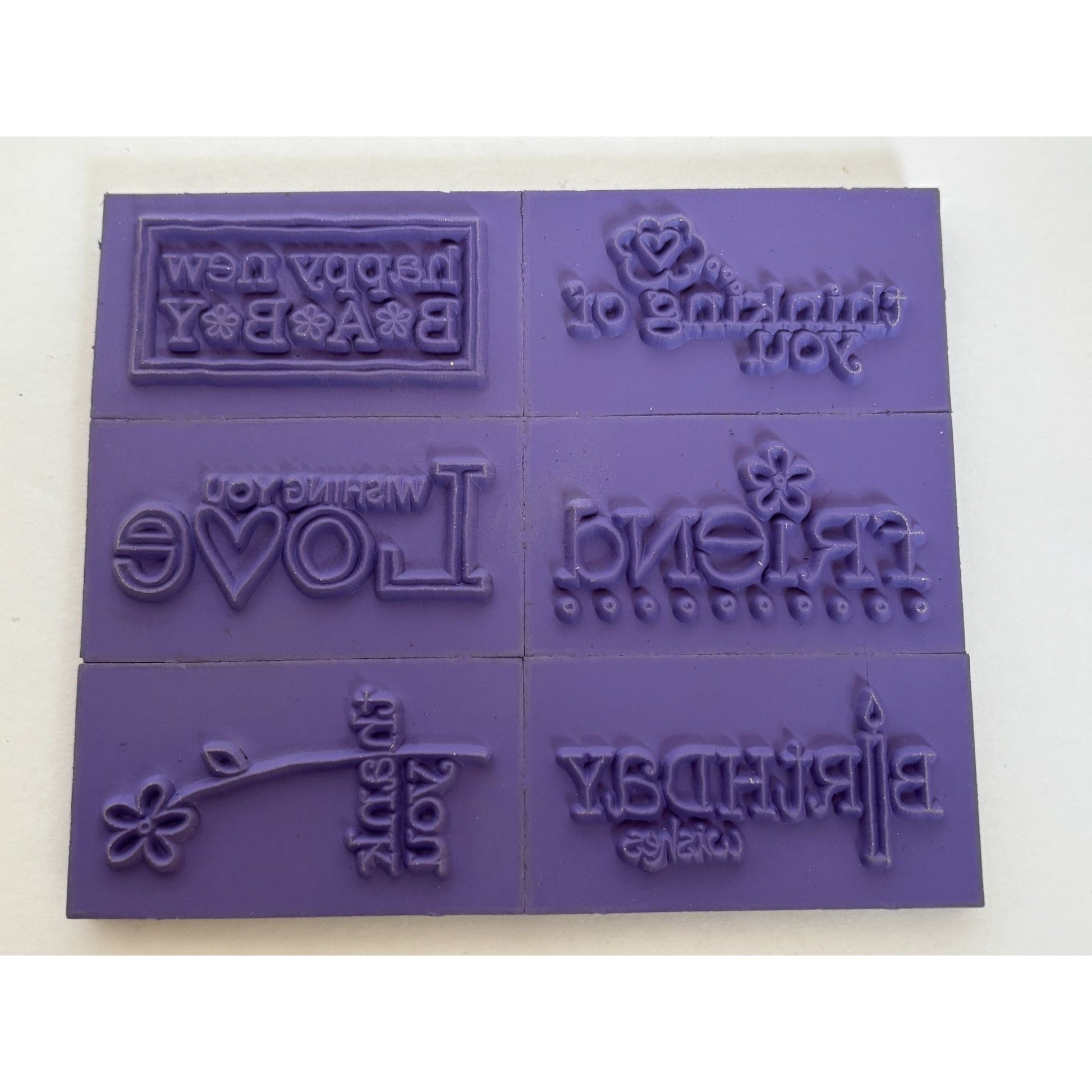 • Includes 6 stamps that read 1. Thinking of You 2. Happy New Baby 3. Friend 4. Wishing You Love 5. Birthday Wishes 6. Thank You